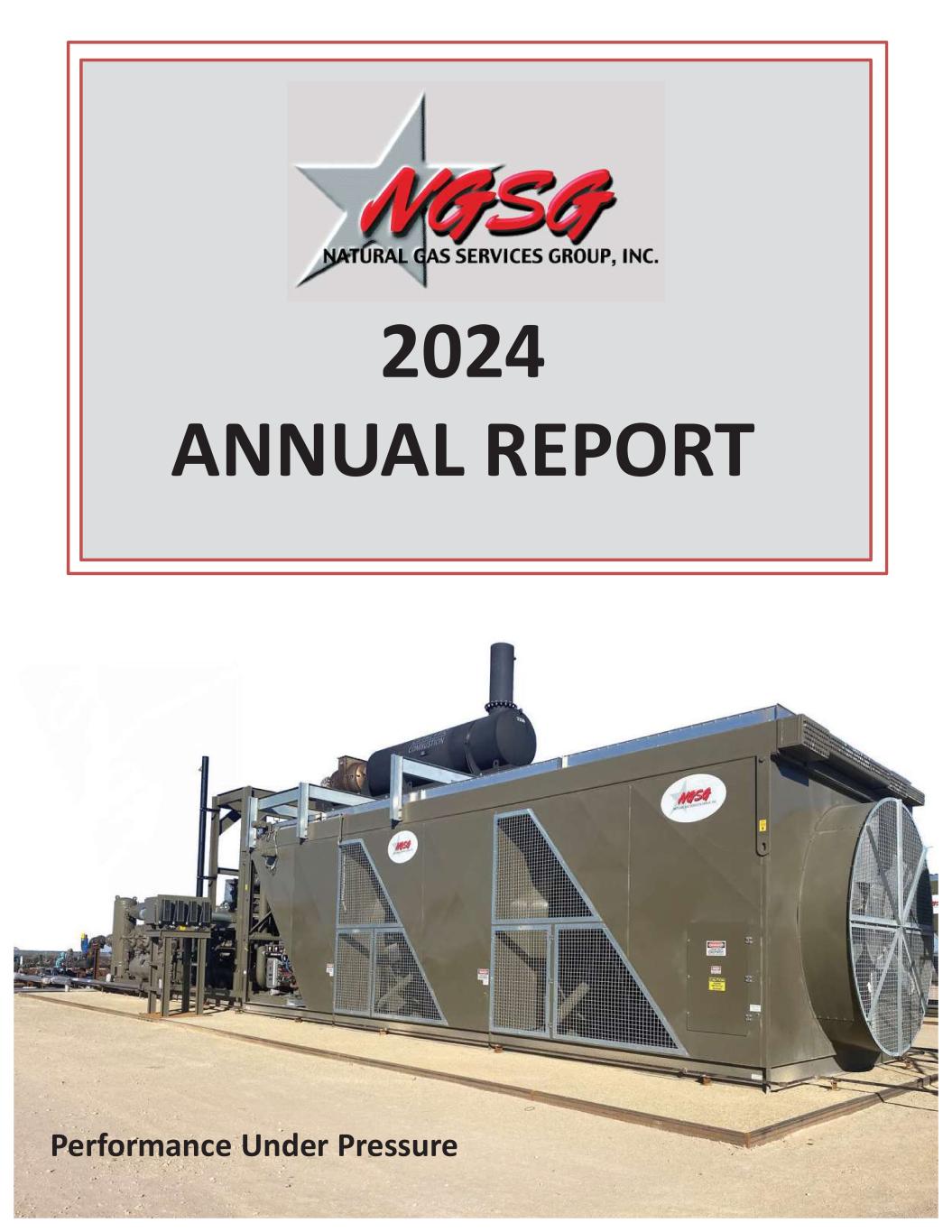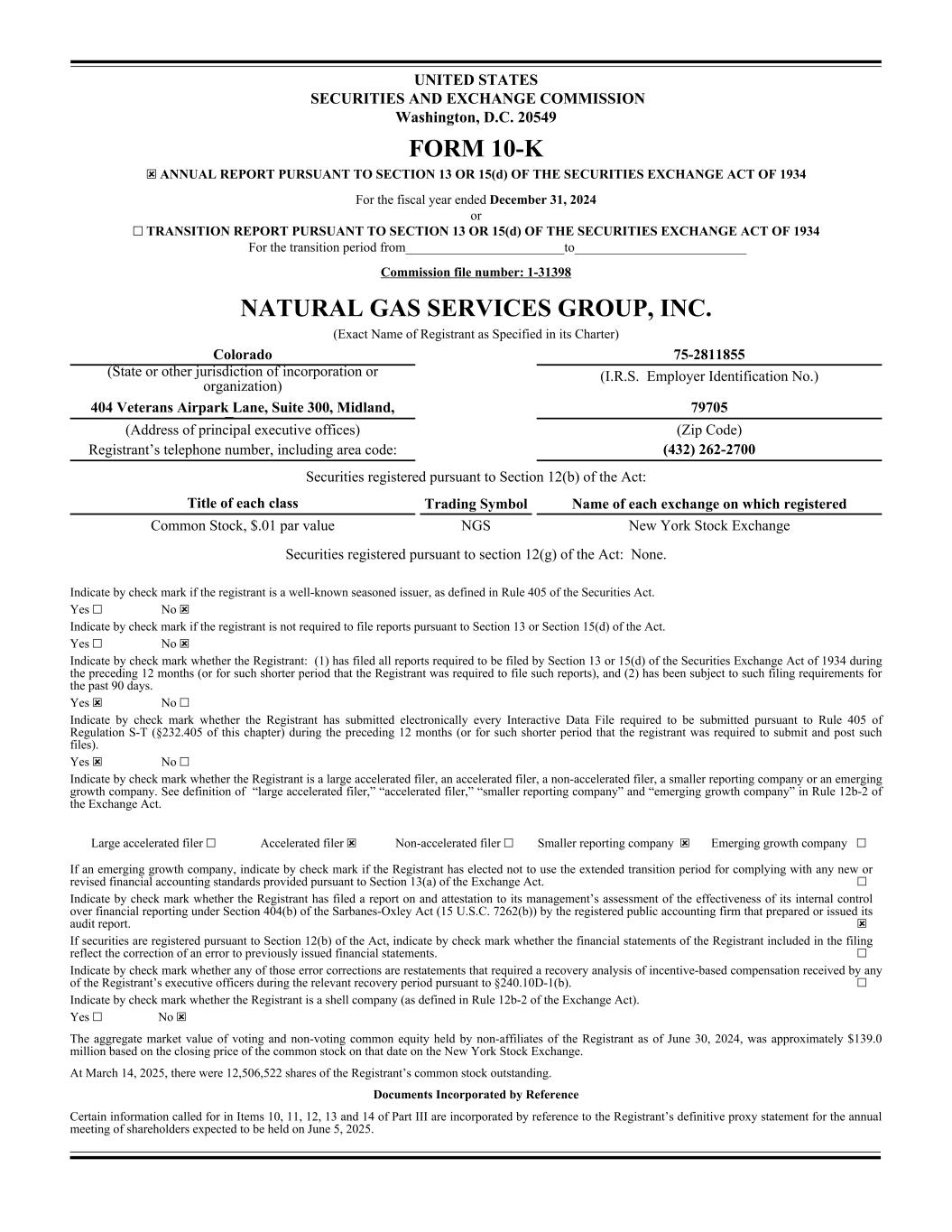 UNITED STATES SECURITIES AND EXCHANGE COMMISSION Washington, D.C. 20549 FORM 10-K ☒ ANNUAL REPORT PURSUANT TO SECTION 13 OR 15(d) OF THE SECURITIES EXCHANGE ACT OF 1934 For the fiscal year ended December 31, 2024 or ☐ TRANSITION REPORT PURSUANT TO SECTION 13 OR 15(d) OF THE SECURITIES EXCHANGE ACT OF 1934 For the transition period from________________________to__________________________ Commission file number: 1-31398 NATURAL GAS SERVICES GROUP, INC. (Exact Name of Registrant as Specified in its Charter) Colorado 75-2811855 (State or other jurisdiction of incorporation or organization) (I.R.S. Employer Identification No.) 404 Veterans Airpark Lane, Suite 300, Midland, Texas 79705 (Address of principal executive offices) (Zip Code) Registrant’s telephone number, including area code: (432) 262-2700 Securities registered pursuant to Section 12(b) of the Act: Title of each class Trading Symbol Name of each exchange on which registered Common Stock, $.01 par value NGS New York Stock Exchange Securities registered pursuant to section 12(g) of the Act: None. Indicate by check mark if the registrant is a well-known seasoned issuer, as defined in Rule 405 of the Securities Act. Yes ☐ No ☒ Indicate by check mark if the registrant is not required to file reports pursuant to Section 13 or Section 15(d) of the Act. Yes ☐ No ☒ Indicate by check mark whether the Registrant: (1) has filed all reports required to be filed by Section 13 or 15(d) of the Securities Exchange Act of 1934 during the preceding 12 months (or for such shorter period that the Registrant was required to file such reports), and (2) has been subject to such filing requirements for the past 90 days. Yes ☒ No ☐ Indicate by check mark whether the Registrant has submitted electronically every Interactive Data File required to be submitted pursuant to Rule 405 of Regulation S-T (§232.405 of this chapter) during the preceding 12 months (or for such shorter period that the registrant was required to submit and post such files). Yes ☒ No ☐ Indicate by check mark whether the Registrant is a large accelerated filer, an accelerated filer, a non-accelerated filer, a smaller reporting company or an emerging growth company. See definition of “large accelerated filer,” “accelerated filer,” “smaller reporting company” and “emerging growth company” in Rule 12b-2 of the Exchange Act. Large accelerated filer ☐ Accelerated filer ☒ Non-accelerated filer ☐ Smaller reporting company ☒ Emerging growth company ☐ If an emerging growth company, indicate by check mark if the Registrant has elected not to use the extended transition period for complying with any new or revised financial accounting standards provided pursuant to Section 13(a) of the Exchange Act. ☐ Indicate by check mark whether the Registrant has filed a report on and attestation to its management’s assessment of the effectiveness of its internal control over financial reporting under Section 404(b) of the Sarbanes-Oxley Act (15 U.S.C. 7262(b)) by the registered public accounting firm that prepared or issued its audit report. ☒ If securities are registered pursuant to Section 12(b) of the Act, indicate by check mark whether the financial statements of the Registrant included in the filing reflect the correction of an error to previously issued financial statements. ☐ Indicate by check mark whether any of those error corrections are restatements that required a recovery analysis of incentive-based compensation received by any of the Registrant’s executive officers during the relevant recovery period pursuant to §240.10D-1(b). ☐ Indicate by check mark whether the Registrant is a shell company (as defined in Rule 12b-2 of the Exchange Act). Yes ☐ No ☒ The aggregate market value of voting and non-voting common equity held by non-affiliates of the Registrant as of June 30, 2024, was approximately $139.0 million based on the closing price of the common stock on that date on the New York Stock Exchange. At March 14, 2025, there were 12,506,522 shares of the Registrant’s common stock outstanding. Documents Incorporated by Reference Certain information called for in Items 10, 11, 12, 13 and 14 of Part III are incorporated by reference to the Registrant’s definitive proxy statement for the annual meeting of shareholders expected to be held on June 5, 2025.