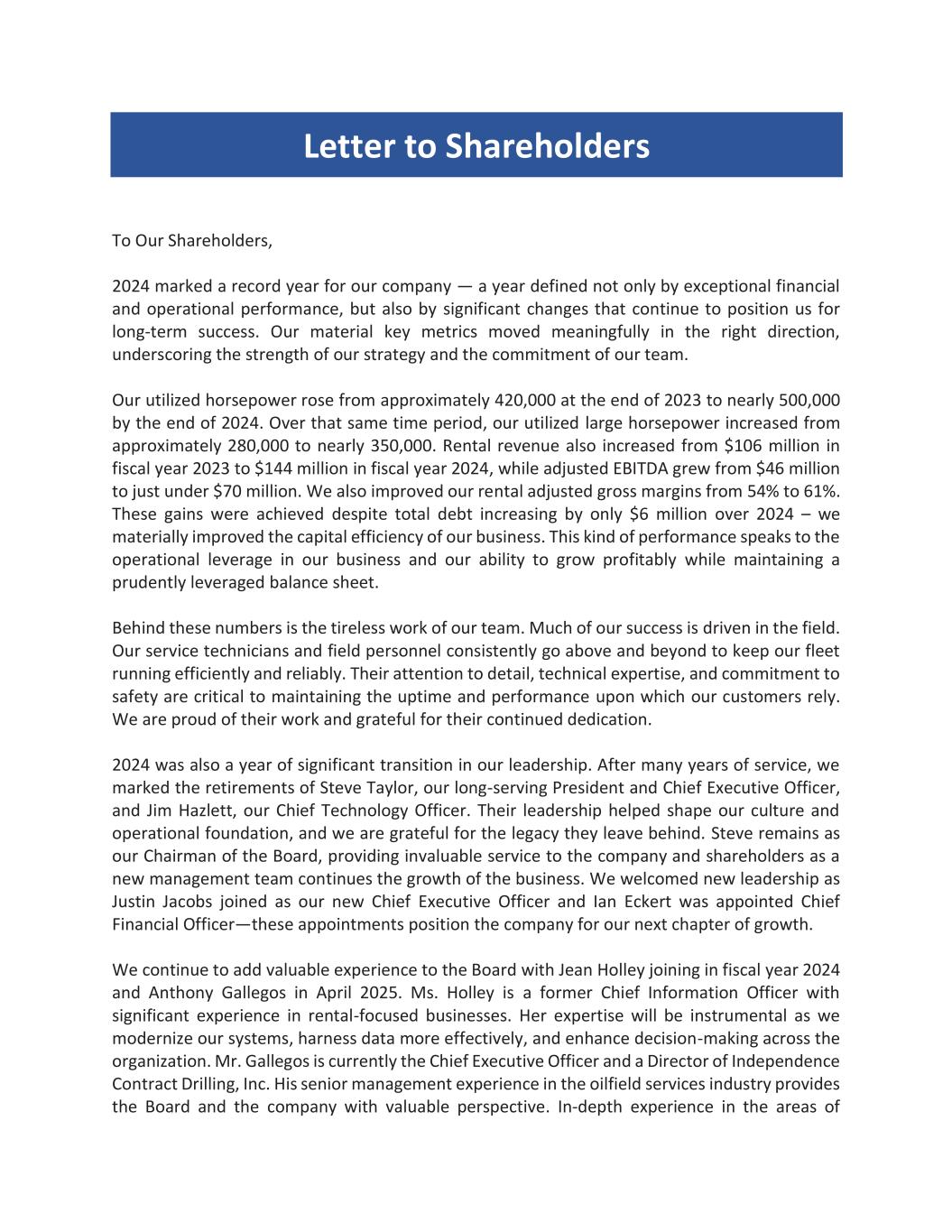 To Our Shareholders, 2024 marked a record year for our company a year defined not only by exceptional financial and operational performance, but also by significant changes that continue to position us for long-term success. Our material key metrics moved meaningfully in the right direction, underscoring the strength of our strategy and the commitment of our team. Our utilized horsepower rose from approximately 420,000 at the end of 2023 to nearly 500,000 by the end of 2024. Over that same time period, our utilized large horsepower increased from approximately 280,000 to nearly 350,000. Rental revenue also increased from $106 million in fiscal year 2023 to $144 million in fiscal year 2024, while adjusted EBITDA grew from $46 million to just under $70 million. We also improved our rental adjusted gross margins from 54% to 61%. These gains were achieved despite total debt increasing by only $6 million over 2024 we materially improved the capital efficiency of our business. This kind of performance speaks to the operational leverage in our business and our ability to grow profitably while maintaining a prudently leveraged balance sheet. Behind these numbers is the tireless work of our team. Much of our success is driven in the field. Our service technicians and field personnel consistently go above and beyond to keep our fleet running efficiently and reliably. Their attention to detail, technical expertise, and commitment to safety are critical to maintaining the uptime and performance upon which our customers rely. We are proud of their work and grateful for their continued dedication. 2024 was also a year of significant transition in our leadership. After many years of service, we marked the retirements of Steve Taylor, our long-serving President and Chief Executive Officer, and Jim Hazlett, our Chief Technology Officer. Their leadership helped shape our culture and operational foundation, and we are grateful for the legacy they leave behind. Steve remains as our Chairman of the Board, providing invaluable service to the company and shareholders as a new management team continues the growth of the business. We welcomed new leadership as Justin Jacobs joined as our new Chief Executive Officer and Ian Eckert was appointed Chief Financial Officerthese appointments position the company for our next chapter of growth. We continue to add valuable experience to the Board with Jean Holley joining in fiscal year 2024 and Anthony Gallegos in April 2025. Ms. Holley is a former Chief Information Officer with significant experience in rental-focused businesses. Her expertise will be instrumental as we modernize our systems, harness data more effectively, and enhance decision-making across the organization. Mr. Gallegos is currently the Chief Executive Officer and a Director of Independence Contract Drilling, Inc. His senior management experience in the oilfield services industry provides the Board and the company with valuable perspective. In-depth experience in the areas of Letter to Shareholders