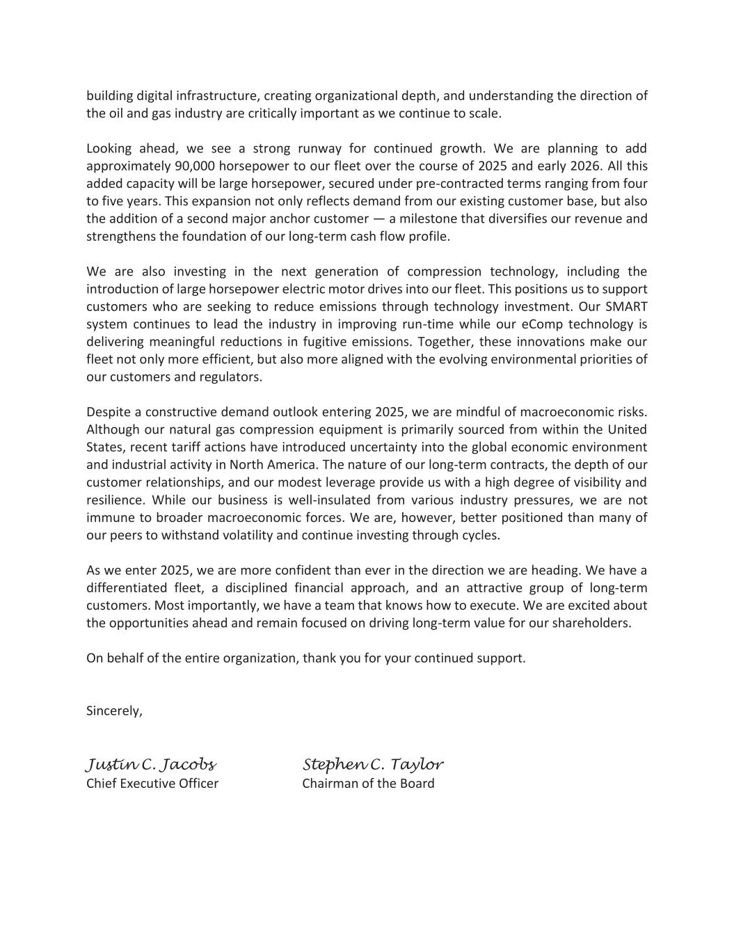 building digital infrastructure, creating organizational depth, and understanding the direction of the oil and gas industry are critically important as we continue to scale. Looking ahead, we see a strong runway for continued growth. We are planning to add approximately 90,000 horsepower to our fleet over the course of 2025 and early 2026. All this added capacity will be large horsepower, secured under pre-contracted terms ranging from four to five years. This expansion not only reflects demand from our existing customer base, but also the addition of a second major anchor customer a milestone that diversifies our revenue and strengthens the foundation of our long-term cash flow profile. We are also investing in the next generation of compression technology, including the introduction of large horsepower electric motor drives into our fleet. This positions us to support customers who are seeking to reduce emissions through technology investment. Our SMART system continues to lead the industry in improving run-time while our eComp technology is delivering meaningful reductions in fugitive emissions. Together, these innovations make our fleet not only more efficient, but also more aligned with the evolving environmental priorities of our customers and regulators. Despite a constructive demand outlook entering 2025, we are mindful of macroeconomic risks. Although our natural gas compression equipment is primarily sourced from within the United States, recent tariff actions have introduced uncertainty into the global economic environment and industrial activity in North America. The nature of our long-term contracts, the depth of our customer relationships, and our modest leverage provide us with a high degree of visibility and resilience. While our business is well-insulated from various industry pressures, we are not immune to broader macroeconomic forces. We are, however, better positioned than many of our peers to withstand volatility and continue investing through cycles. As we enter 2025, we are more confident than ever in the direction we are heading. We have a differentiated fleet, a disciplined financial approach, and an attractive group of long-term customers. Most importantly, we have a team that knows how to execute. We are excited about the opportunities ahead and remain focused on driving long-term value for our shareholders. On behalf of the entire organization, thank you for your continued support. Sincerely, Justin C. Jacobs Stephen C. Taylor Chief Executive Officer Chairman of the Board