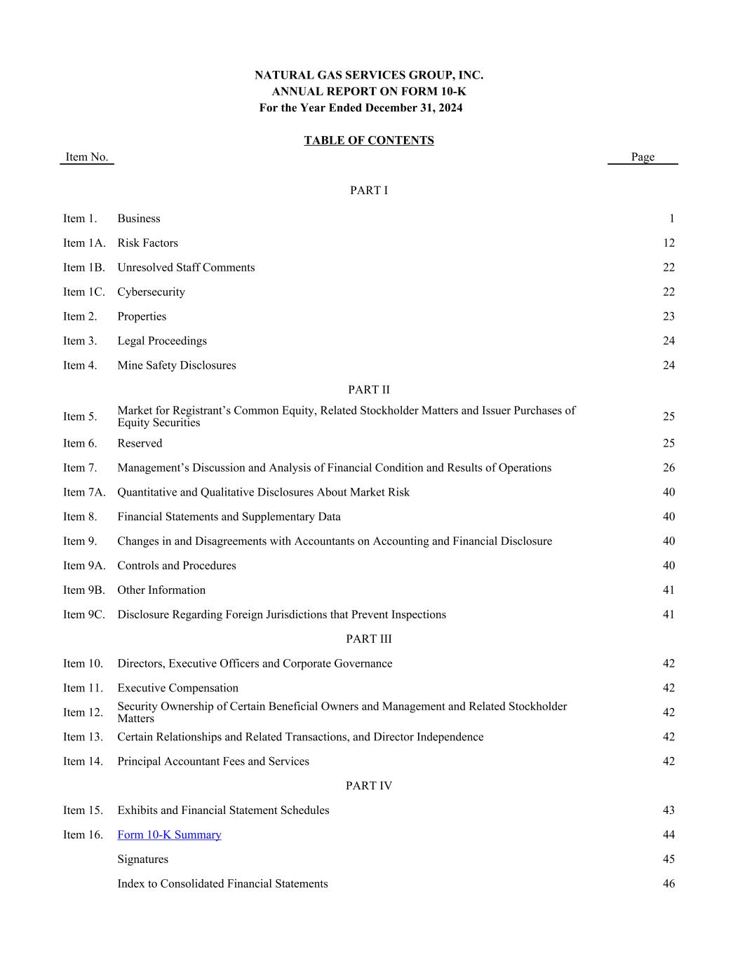 NATURAL GAS SERVICES GROUP, INC. ANNUAL REPORT ON FORM 10-K For the Year Ended December 31, 2024 TABLE OF CONTENTS Item No. Page PART I Item 1. Business 1 Item 1A. Risk Factors 12 Item 1B. Unresolved Staff Comments 22 Item 1C. Cybersecurity 22 Item 2. Properties 23 Item 3. Legal Proceedings 24 Item 4. Mine Safety Disclosures 24 PART II Item 5. Market for Registrant’s Common Equity, Related Stockholder Matters and Issuer Purchases of Equity Securities 25 Item 6. Reserved 25 Item 7. Management’s Discussion and Analysis of Financial Condition and Results of Operations 26 Item 7A. Quantitative and Qualitative Disclosures About Market Risk 40 Item 8. Financial Statements and Supplementary Data 40 Item 9. Changes in and Disagreements with Accountants on Accounting and Financial Disclosure 40 Item 9A. Controls and Procedures 40 Item 9B. Other Information 41 Item 9C. Disclosure Regarding Foreign Jurisdictions that Prevent Inspections 41 PART III Item 10. Directors, Executive Officers and Corporate Governance 42 Item 11. Executive Compensation 42 Item 12. Security Ownership of Certain Beneficial Owners and Management and Related Stockholder Matters 42 Item 13. Certain Relationships and Related Transactions, and Director Independence 42 Item 14. Principal Accountant Fees and Services 42 PART IV Item 15. Exhibits and Financial Statement Schedules 43 Item 16. Form 10-K Summary 44 Signatures 45 Index to Consolidated Financial Statements 46