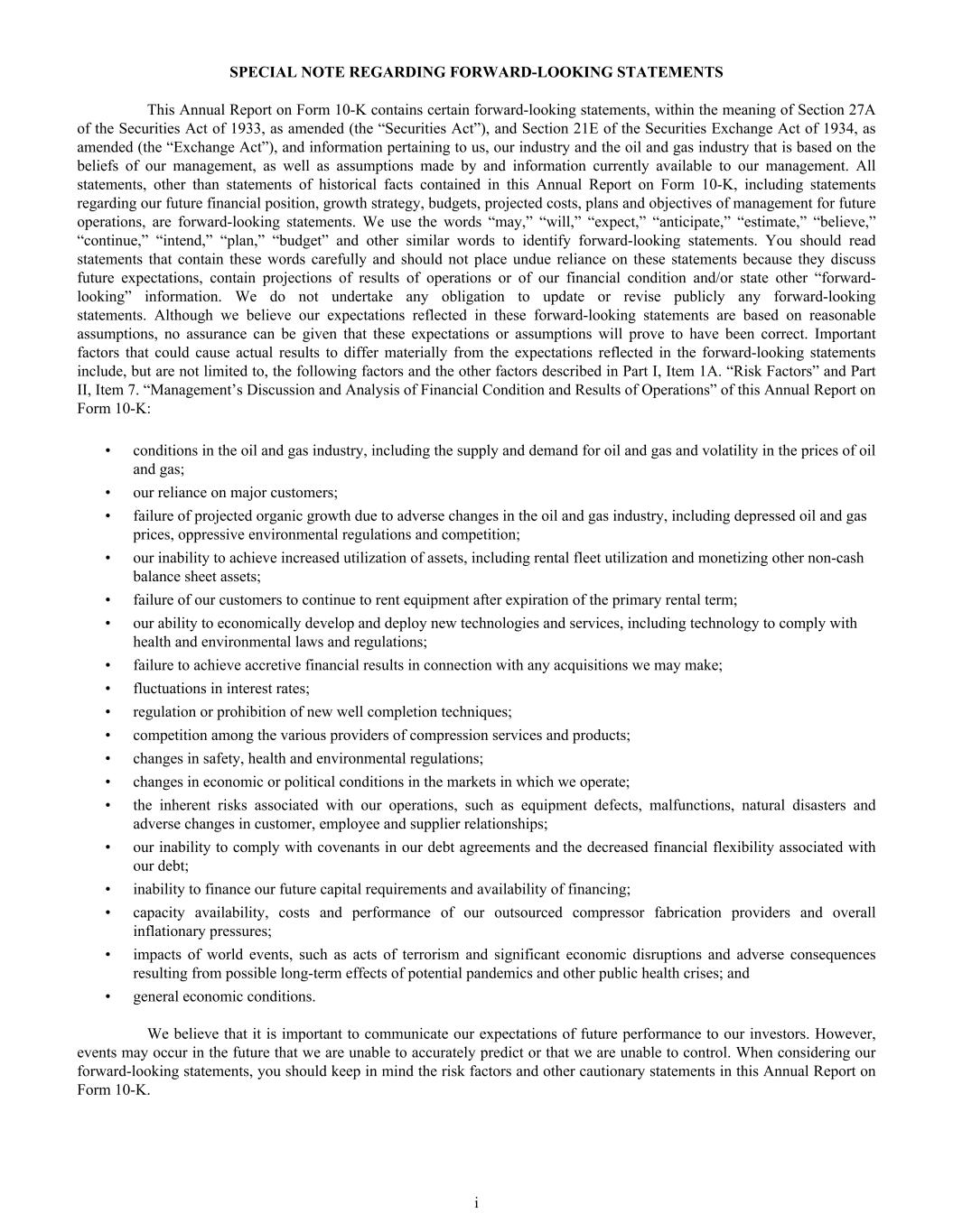 SPECIAL NOTE REGARDING FORWARD-LOOKING STATEMENTS This Annual Report on Form 10-K contains certain forward-looking statements, within the meaning of Section 27A of the Securities Act of 1933, as amended (the “Securities Act”), and Section 21E of the Securities Exchange Act of 1934, as amended (the “Exchange Act”), and information pertaining to us, our industry and the oil and gas industry that is based on the beliefs of our management, as well as assumptions made by and information currently available to our management. All statements, other than statements of historical facts contained in this Annual Report on Form 10-K, including statements regarding our future financial position, growth strategy, budgets, projected costs, plans and objectives of management for future operations, are forward-looking statements. We use the words “may,” “will,” “expect,” “anticipate,” “estimate,” “believe,” “continue,” “intend,” “plan,” “budget” and other similar words to identify forward-looking statements. You should read statements that contain these words carefully and should not place undue reliance on these statements because they discuss future expectations, contain projections of results of operations or of our financial condition and/or state other “forward- looking” information. We do not undertake any obligation to update or revise publicly any forward-looking statements. Although we believe our expectations reflected in these forward-looking statements are based on reasonable assumptions, no assurance can be given that these expectations or assumptions will prove to have been correct. Important factors that could cause actual results to differ materially from the expectations reflected in the forward-looking statements include, but are not limited to, the following factors and the other factors described in Part I, Item 1A. “Risk Factors” and Part II, Item 7. “Management’s Discussion and Analysis of Financial Condition and Results of Operations” of this Annual Report on Form 10-K: • conditions in the oil and gas industry, including the supply and demand for oil and gas and volatility in the prices of oil and gas; • our reliance on major customers; • failure of projected organic growth due to adverse changes in the oil and gas industry, including depressed oil and gas prices, oppressive environmental regulations and competition; • our inability to achieve increased utilization of assets, including rental fleet utilization and monetizing other non-cash balance sheet assets; • failure of our customers to continue to rent equipment after expiration of the primary rental term; • our ability to economically develop and deploy new technologies and services, including technology to comply with health and environmental laws and regulations; • failure to achieve accretive financial results in connection with any acquisitions we may make; • fluctuations in interest rates; • regulation or prohibition of new well completion techniques; • competition among the various providers of compression services and products; • changes in safety, health and environmental regulations; • changes in economic or political conditions in the markets in which we operate; • the inherent risks associated with our operations, such as equipment defects, malfunctions, natural disasters and adverse changes in customer, employee and supplier relationships; • our inability to comply with covenants in our debt agreements and the decreased financial flexibility associated with our debt; • inability to finance our future capital requirements and availability of financing; • capacity availability, costs and performance of our outsourced compressor fabrication providers and overall inflationary pressures; • impacts of world events, such as acts of terrorism and significant economic disruptions and adverse consequences resulting from possible long-term effects of potential pandemics and other public health crises; and • general economic conditions. We believe that it is important to communicate our expectations of future performance to our investors. However, events may occur in the future that we are unable to accurately predict or that we are unable to control. When considering our forward-looking statements, you should keep in mind the risk factors and other cautionary statements in this Annual Report on Form 10-K. i