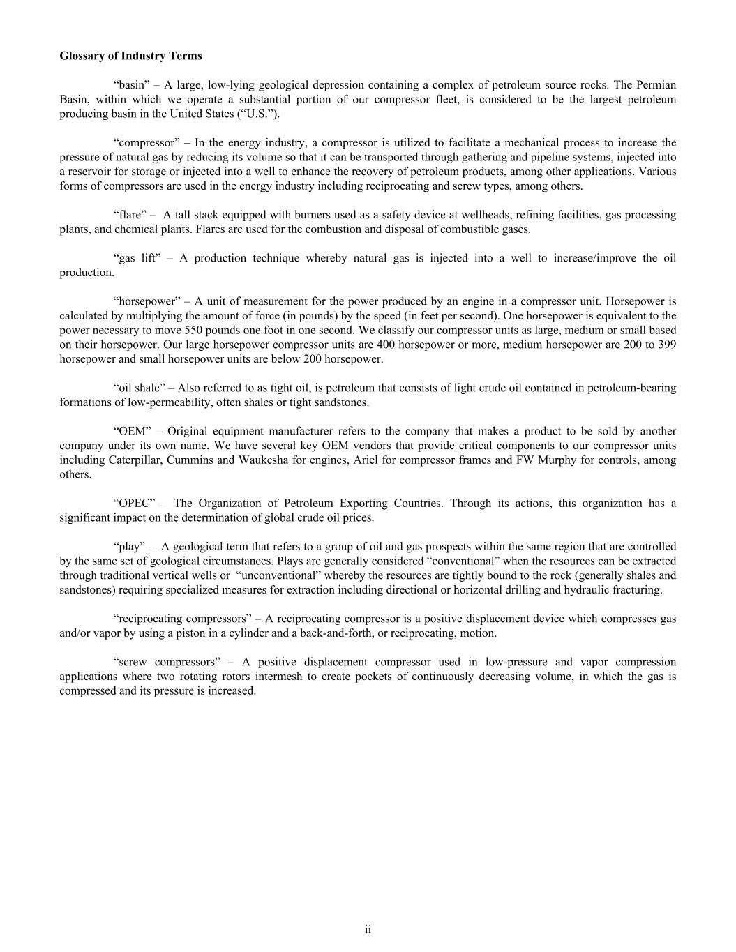 Glossary of Industry Terms “basin” – A large, low-lying geological depression containing a complex of petroleum source rocks. The Permian Basin, within which we operate a substantial portion of our compressor fleet, is considered to be the largest petroleum producing basin in the United States (“U.S.”). “compressor” – In the energy industry, a compressor is utilized to facilitate a mechanical process to increase the pressure of natural gas by reducing its volume so that it can be transported through gathering and pipeline systems, injected into a reservoir for storage or injected into a well to enhance the recovery of petroleum products, among other applications. Various forms of compressors are used in the energy industry including reciprocating and screw types, among others. “flare” – A tall stack equipped with burners used as a safety device at wellheads, refining facilities, gas processing plants, and chemical plants. Flares are used for the combustion and disposal of combustible gases. “gas lift” – A production technique whereby natural gas is injected into a well to increase/improve the oil production. “horsepower” – A unit of measurement for the power produced by an engine in a compressor unit. Horsepower is calculated by multiplying the amount of force (in pounds) by the speed (in feet per second). One horsepower is equivalent to the power necessary to move 550 pounds one foot in one second. We classify our compressor units as large, medium or small based on their horsepower. Our large horsepower compressor units are 400 horsepower or more, medium horsepower are 200 to 399 horsepower and small horsepower units are below 200 horsepower. “oil shale” – Also referred to as tight oil, is petroleum that consists of light crude oil contained in petroleum-bearing formations of low-permeability, often shales or tight sandstones. “OEM” – Original equipment manufacturer refers to the company that makes a product to be sold by another company under its own name. We have several key OEM vendors that provide critical components to our compressor units including Caterpillar, Cummins and Waukesha for engines, Ariel for compressor frames and FW Murphy for controls, among others. “OPEC” – The Organization of Petroleum Exporting Countries. Through its actions, this organization has a significant impact on the determination of global crude oil prices. “play” – A geological term that refers to a group of oil and gas prospects within the same region that are controlled by the same set of geological circumstances. Plays are generally considered “conventional” when the resources can be extracted through traditional vertical wells or “unconventional” whereby the resources are tightly bound to the rock (generally shales and sandstones) requiring specialized measures for extraction including directional or horizontal drilling and hydraulic fracturing. “reciprocating compressors” – A reciprocating compressor is a positive displacement device which compresses gas and/or vapor by using a piston in a cylinder and a back-and-forth, or reciprocating, motion. “screw compressors” – A positive displacement compressor used in low-pressure and vapor compression applications where two rotating rotors intermesh to create pockets of continuously decreasing volume, in which the gas is compressed and its pressure is increased. ii
