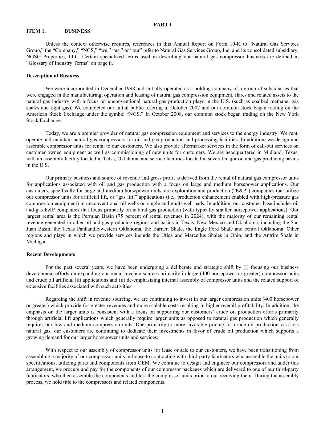 PART I ITEM 1. BUSINESS Unless the context otherwise requires, references in this Annual Report on Form 10-K to “Natural Gas Services Group,” the “Company,” “NGS,” “we,” “us,” or “our” refer to Natural Gas Services Group, Inc. and its consolidated subsidiary, NGSG Properties, LLC. Certain specialized terms used in describing our natural gas compressor business are defined in “Glossary of Industry Terms” on page ii. Description of Business We were incorporated in December 1998 and initially operated as a holding company of a group of subsidiaries that were engaged in the manufacturing, operation and leasing of natural gas compression equipment, flares and related assets to the natural gas industry with a focus on unconventional natural gas production plays in the U.S. (such as coalbed methane, gas shales and tight gas). We completed our initial public offering in October 2002 and our common stock began trading on the American Stock Exchange under the symbol “NGS.” In October 2008, our common stock began trading on the New York Stock Exchange. Today, we are a premier provider of natural gas compression equipment and services to the energy industry. We rent, operate and maintain natural gas compressors for oil and gas production and processing facilities. In addition, we design and assemble compressor units for rental to our customers. We also provide aftermarket services in the form of call-out services on customer-owned equipment as well as commissioning of new units for customers. We are headquartered in Midland, Texas, with an assembly facility located in Tulsa, Oklahoma and service facilities located in several major oil and gas producing basins in the U.S. Our primary business and source of revenue and gross profit is derived from the rental of natural gas compressor units for applications associated with oil and gas production with a focus on large and medium horsepower applications. Our customers, specifically for large and medium horsepower units, are exploration and production (“E&P”) companies that utilize our compressor units for artificial lift, or “gas lift,” applications (i.e., production enhancement enabled with high-pressure gas compression equipment) in unconventional oil wells on single and multi-well pads. In addition, our customer base includes oil and gas E&P companies that focus primarily on natural gas production (with typically smaller horsepower applications). Our largest rental area is the Permian Basin (75 percent of rental revenues in 2024), with the majority of our remaining rental revenue generated in other oil and gas producing regions and basins in Texas, New Mexico and Oklahoma, including the San Juan Basin, the Texas Panhandle/western Oklahoma, the Barnett Shale, the Eagle Ford Shale and central Oklahoma. Other regions and plays in which we provide services include the Utica and Marcellus Shales in Ohio, and the Antrim Shale in Michigan. Recent Developments For the past several years, we have been undergoing a deliberate and strategic shift by (i) focusing our business development efforts on expanding our rental revenue sources primarily in large (400 horsepower or greater) compressor units and crude oil artificial lift applications and (ii) de-emphasizing internal assembly of compressor units and the related support of extensive facilities associated with such activities. Regarding the shift in revenue sourcing, we are continuing to invest in our larger compression units (400 horsepower or greater) which provide for greater revenues and more scalable costs resulting in higher overall profitability. In addition, the emphasis on the larger units is consistent with a focus on supporting our customers’ crude oil production efforts primarily through artificial lift applications which generally require larger units as opposed to natural gas production which generally requires our low and medium compression units. Due primarily to more favorable pricing for crude oil production vis-à-vis natural gas, our customers are continuing to dedicate their investments in favor of crude oil production which supports a growing demand for our larger horsepower units and services. With respect to our assembly of compressor units for lease or sale to our customers, we have been transitioning from assembling a majority of our compressor units in-house to contracting with third-party fabricators who assemble the units to our specifications, utilizing parts and components from OEM. We continue to design and engineer our compressors and under this arrangement, we procure and pay for the components of our compressor packages which are delivered to one of our third-party fabricators, who then assemble the components and test the compressor units prior to our receiving them. During the assembly process, we hold title to the compressors and related components. 1