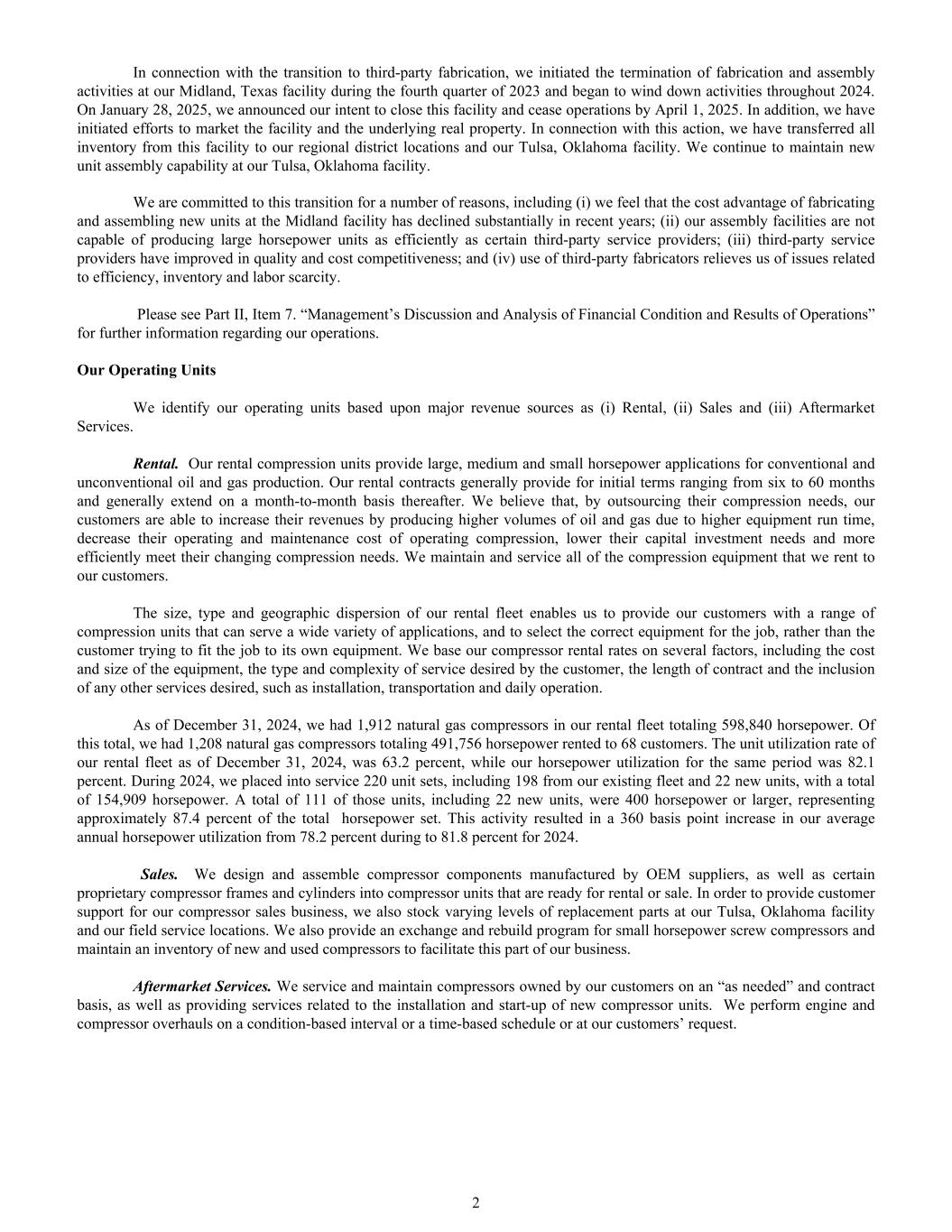 In connection with the transition to third-party fabrication, we initiated the termination of fabrication and assembly activities at our Midland, Texas facility during the fourth quarter of 2023 and began to wind down activities throughout 2024. On January 28, 2025, we announced our intent to close this facility and cease operations by April 1, 2025. In addition, we have initiated efforts to market the facility and the underlying real property. In connection with this action, we have transferred all inventory from this facility to our regional district locations and our Tulsa, Oklahoma facility. We continue to maintain new unit assembly capability at our Tulsa, Oklahoma facility. We are committed to this transition for a number of reasons, including (i) we feel that the cost advantage of fabricating and assembling new units at the Midland facility has declined substantially in recent years; (ii) our assembly facilities are not capable of producing large horsepower units as efficiently as certain third-party service providers; (iii) third-party service providers have improved in quality and cost competitiveness; and (iv) use of third-party fabricators relieves us of issues related to efficiency, inventory and labor scarcity. Please see Part II, Item 7. “Management’s Discussion and Analysis of Financial Condition and Results of Operations” for further information regarding our operations. Our Operating Units We identify our operating units based upon major revenue sources as (i) Rental, (ii) Sales and (iii) Aftermarket Services. Rental. Our rental compression units provide large, medium and small horsepower applications for conventional and unconventional oil and gas production. Our rental contracts generally provide for initial terms ranging from six to 60 months and generally extend on a month-to-month basis thereafter. We believe that, by outsourcing their compression needs, our customers are able to increase their revenues by producing higher volumes of oil and gas due to higher equipment run time, decrease their operating and maintenance cost of operating compression, lower their capital investment needs and more efficiently meet their changing compression needs. We maintain and service all of the compression equipment that we rent to our customers. The size, type and geographic dispersion of our rental fleet enables us to provide our customers with a range of compression units that can serve a wide variety of applications, and to select the correct equipment for the job, rather than the customer trying to fit the job to its own equipment. We base our compressor rental rates on several factors, including the cost and size of the equipment, the type and complexity of service desired by the customer, the length of contract and the inclusion of any other services desired, such as installation, transportation and daily operation. As of December 31, 2024, we had 1,912 natural gas compressors in our rental fleet totaling 598,840 horsepower. Of this total, we had 1,208 natural gas compressors totaling 491,756 horsepower rented to 68 customers. The unit utilization rate of our rental fleet as of December 31, 2024, was 63.2 percent, while our horsepower utilization for the same period was 82.1 percent. During 2024, we placed into service 220 unit sets, including 198 from our existing fleet and 22 new units, with a total of 154,909 horsepower. A total of 111 of those units, including 22 new units, were 400 horsepower or larger, representing approximately 87.4 percent of the total horsepower set. This activity resulted in a 360 basis point increase in our average annual horsepower utilization from 78.2 percent during to 81.8 percent for 2024. Sales. We design and assemble compressor components manufactured by OEM suppliers, as well as certain proprietary compressor frames and cylinders into compressor units that are ready for rental or sale. In order to provide customer support for our compressor sales business, we also stock varying levels of replacement parts at our Tulsa, Oklahoma facility and our field service locations. We also provide an exchange and rebuild program for small horsepower screw compressors and maintain an inventory of new and used compressors to facilitate this part of our business. Aftermarket Services. We service and maintain compressors owned by our customers on an “as needed” and contract basis, as well as providing services related to the installation and start-up of new compressor units. We perform engine and compressor overhauls on a condition-based interval or a time-based schedule or at our customers’ request. 2