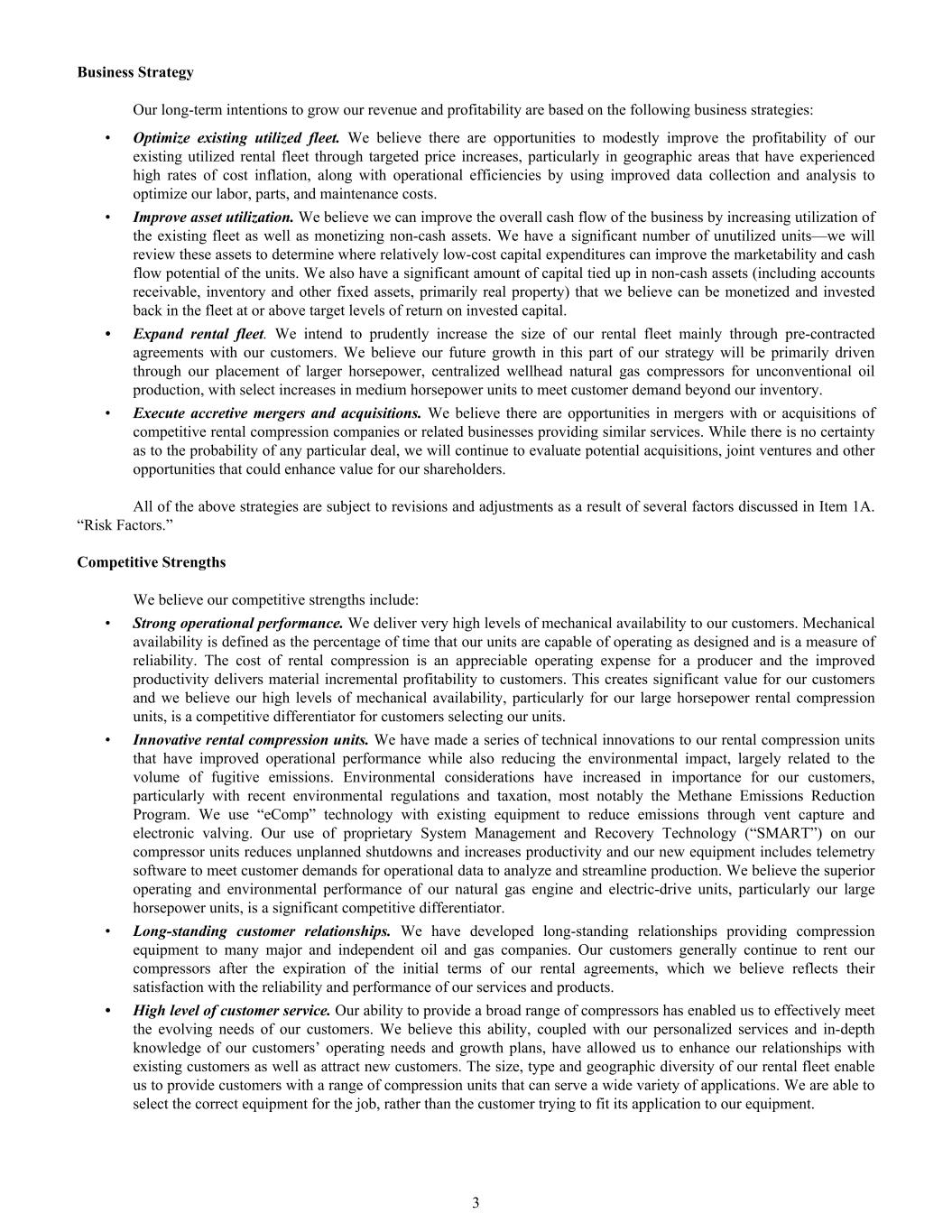 Business Strategy Our long-term intentions to grow our revenue and profitability are based on the following business strategies: • Optimize existing utilized fleet. We believe there are opportunities to modestly improve the profitability of our existing utilized rental fleet through targeted price increases, particularly in geographic areas that have experienced high rates of cost inflation, along with operational efficiencies by using improved data collection and analysis to optimize our labor, parts, and maintenance costs. • Improve asset utilization. We believe we can improve the overall cash flow of the business by increasing utilization of the existing fleet as well as monetizing non-cash assets. We have a significant number of unutilized units—we will review these assets to determine where relatively low-cost capital expenditures can improve the marketability and cash flow potential of the units. We also have a significant amount of capital tied up in non-cash assets (including accounts receivable, inventory and other fixed assets, primarily real property) that we believe can be monetized and invested back in the fleet at or above target levels of return on invested capital. • Expand rental fleet. We intend to prudently increase the size of our rental fleet mainly through pre-contracted agreements with our customers. We believe our future growth in this part of our strategy will be primarily driven through our placement of larger horsepower, centralized wellhead natural gas compressors for unconventional oil production, with select increases in medium horsepower units to meet customer demand beyond our inventory. • Execute accretive mergers and acquisitions. We believe there are opportunities in mergers with or acquisitions of competitive rental compression companies or related businesses providing similar services. While there is no certainty as to the probability of any particular deal, we will continue to evaluate potential acquisitions, joint ventures and other opportunities that could enhance value for our shareholders. All of the above strategies are subject to revisions and adjustments as a result of several factors discussed in Item 1A. “Risk Factors.” Competitive Strengths We believe our competitive strengths include: • Strong operational performance. We deliver very high levels of mechanical availability to our customers. Mechanical availability is defined as the percentage of time that our units are capable of operating as designed and is a measure of reliability. The cost of rental compression is an appreciable operating expense for a producer and the improved productivity delivers material incremental profitability to customers. This creates significant value for our customers and we believe our high levels of mechanical availability, particularly for our large horsepower rental compression units, is a competitive differentiator for customers selecting our units. • Innovative rental compression units. We have made a series of technical innovations to our rental compression units that have improved operational performance while also reducing the environmental impact, largely related to the volume of fugitive emissions. Environmental considerations have increased in importance for our customers, particularly with recent environmental regulations and taxation, most notably the Methane Emissions Reduction Program. We use “eComp” technology with existing equipment to reduce emissions through vent capture and electronic valving. Our use of proprietary System Management and Recovery Technology (“SMART”) on our compressor units reduces unplanned shutdowns and increases productivity and our new equipment includes telemetry software to meet customer demands for operational data to analyze and streamline production. We believe the superior operating and environmental performance of our natural gas engine and electric-drive units, particularly our large horsepower units, is a significant competitive differentiator. • Long-standing customer relationships. We have developed long-standing relationships providing compression equipment to many major and independent oil and gas companies. Our customers generally continue to rent our compressors after the expiration of the initial terms of our rental agreements, which we believe reflects their satisfaction with the reliability and performance of our services and products. • High level of customer service. Our ability to provide a broad range of compressors has enabled us to effectively meet the evolving needs of our customers. We believe this ability, coupled with our personalized services and in-depth knowledge of our customers’ operating needs and growth plans, have allowed us to enhance our relationships with existing customers as well as attract new customers. The size, type and geographic diversity of our rental fleet enable us to provide customers with a range of compression units that can serve a wide variety of applications. We are able to select the correct equipment for the job, rather than the customer trying to fit its application to our equipment. 3