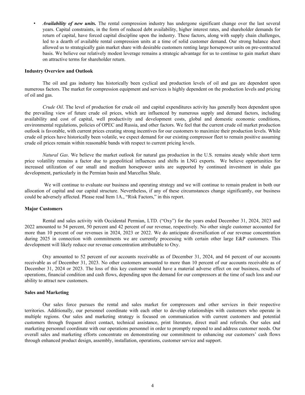 • Availability of new units. The rental compression industry has undergone significant change over the last several years. Capital constraints, in the form of reduced debt availability, higher interest rates, and shareholder demands for return of capital, have forced capital discipline upon the industry. These factors, along with supply chain challenges, led to a dearth of available rental compression units at a time of solid customer demand. Our strong balance sheet allowed us to strategically gain market share with desirable customers renting large horsepower units on pre-contracted basis. We believe our relatively modest leverage remains a strategic advantage for us to continue to gain market share on attractive terms for shareholder return. Industry Overview and Outlook The oil and gas industry has historically been cyclical and production levels of oil and gas are dependent upon numerous factors. The market for compression equipment and services is highly dependent on the production levels and pricing of oil and gas. Crude Oil. The level of production for crude oil and capital expenditures activity has generally been dependent upon the prevailing view of future crude oil prices, which are influenced by numerous supply and demand factors, including availability and cost of capital, well productivity and development costs, global and domestic economic conditions, environmental regulations, policies of OPEC and Russia, and other factors. We feel that the current crude oil market production outlook is favorable, with current prices creating strong incentives for our customers to maximize their production levels. While crude oil prices have historically been volatile, we expect demand for our existing compressor fleet to remain positive assuming crude oil prices remain within reasonable bands with respect to current pricing levels. Natural Gas. We believe the market outlook for natural gas production in the U.S. remains steady while short term price volatility remains a factor due to geopolitical influences and shifts in LNG exports. We believe opportunities for increased utilization of our small and medium horsepower units are supported by continued investment in shale gas development, particularly in the Permian basin and Marcellus Shale. We will continue to evaluate our business and operating strategy and we will continue to remain prudent in both our allocation of capital and our capital structure. Nevertheless, if any of these circumstances change significantly, our business could be adversely affected. Please read Item 1A., “Risk Factors,” in this report. Major Customers Rental and sales activity with Occidental Permian, LTD. (“Oxy”) for the years ended December 31, 2024, 2023 and 2022 amounted to 54 percent, 50 percent and 42 percent of our revenue, respectively. No other single customer accounted for more than 10 percent of our revenues in 2024, 2023 or 2022. We do anticipate diversification of our revenue concentration during 2025 in connection with commitments we are currently processing with certain other large E&P customers. This development will likely reduce our revenue concentration attributable to Oxy. Oxy amounted to 52 percent of our accounts receivable as of December 31, 2024, and 64 percent of our accounts receivable as of December 31, 2023. No other customers amounted to more than 10 percent of our accounts receivable as of December 31, 2024 or 2023. The loss of this key customer would have a material adverse effect on our business, results of operations, financial condition and cash flows, depending upon the demand for our compressors at the time of such loss and our ability to attract new customers. Sales and Marketing Our sales force pursues the rental and sales market for compressors and other services in their respective territories. Additionally, our personnel coordinate with each other to develop relationships with customers who operate in multiple regions. Our sales and marketing strategy is focused on communication with current customers and potential customers through frequent direct contact, technical assistance, print literature, direct mail and referrals. Our sales and marketing personnel coordinate with our operations personnel in order to promptly respond to and address customer needs. Our overall sales and marketing efforts concentrate on demonstrating our commitment to enhancing our customers’ cash flows through enhanced product design, assembly, installation, operations, customer service and support. 4