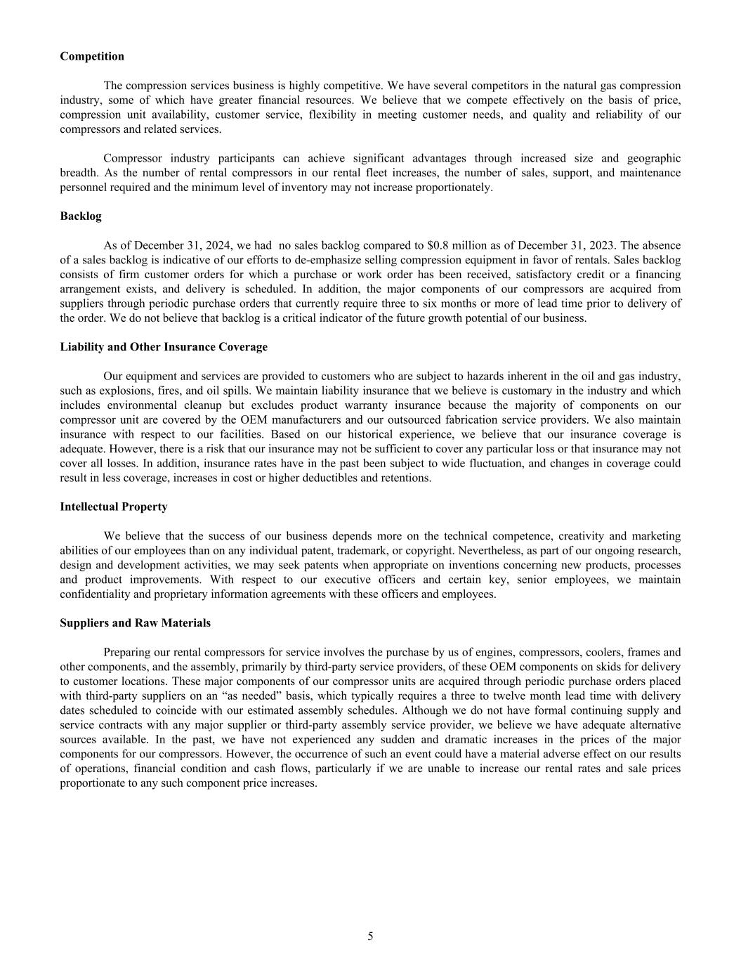 Competition The compression services business is highly competitive. We have several competitors in the natural gas compression industry, some of which have greater financial resources. We believe that we compete effectively on the basis of price, compression unit availability, customer service, flexibility in meeting customer needs, and quality and reliability of our compressors and related services. Compressor industry participants can achieve significant advantages through increased size and geographic breadth. As the number of rental compressors in our rental fleet increases, the number of sales, support, and maintenance personnel required and the minimum level of inventory may not increase proportionately. Backlog As of December 31, 2024, we had no sales backlog compared to $0.8 million as of December 31, 2023. The absence of a sales backlog is indicative of our efforts to de-emphasize selling compression equipment in favor of rentals. Sales backlog consists of firm customer orders for which a purchase or work order has been received, satisfactory credit or a financing arrangement exists, and delivery is scheduled. In addition, the major components of our compressors are acquired from suppliers through periodic purchase orders that currently require three to six months or more of lead time prior to delivery of the order. We do not believe that backlog is a critical indicator of the future growth potential of our business. Liability and Other Insurance Coverage Our equipment and services are provided to customers who are subject to hazards inherent in the oil and gas industry, such as explosions, fires, and oil spills. We maintain liability insurance that we believe is customary in the industry and which includes environmental cleanup but excludes product warranty insurance because the majority of components on our compressor unit are covered by the OEM manufacturers and our outsourced fabrication service providers. We also maintain insurance with respect to our facilities. Based on our historical experience, we believe that our insurance coverage is adequate. However, there is a risk that our insurance may not be sufficient to cover any particular loss or that insurance may not cover all losses. In addition, insurance rates have in the past been subject to wide fluctuation, and changes in coverage could result in less coverage, increases in cost or higher deductibles and retentions. Intellectual Property We believe that the success of our business depends more on the technical competence, creativity and marketing abilities of our employees than on any individual patent, trademark, or copyright. Nevertheless, as part of our ongoing research, design and development activities, we may seek patents when appropriate on inventions concerning new products, processes and product improvements. With respect to our executive officers and certain key, senior employees, we maintain confidentiality and proprietary information agreements with these officers and employees. Suppliers and Raw Materials Preparing our rental compressors for service involves the purchase by us of engines, compressors, coolers, frames and other components, and the assembly, primarily by third-party service providers, of these OEM components on skids for delivery to customer locations. These major components of our compressor units are acquired through periodic purchase orders placed with third-party suppliers on an “as needed” basis, which typically requires a three to twelve month lead time with delivery dates scheduled to coincide with our estimated assembly schedules. Although we do not have formal continuing supply and service contracts with any major supplier or third-party assembly service provider, we believe we have adequate alternative sources available. In the past, we have not experienced any sudden and dramatic increases in the prices of the major components for our compressors. However, the occurrence of such an event could have a material adverse effect on our results of operations, financial condition and cash flows, particularly if we are unable to increase our rental rates and sale prices proportionate to any such component price increases. 5