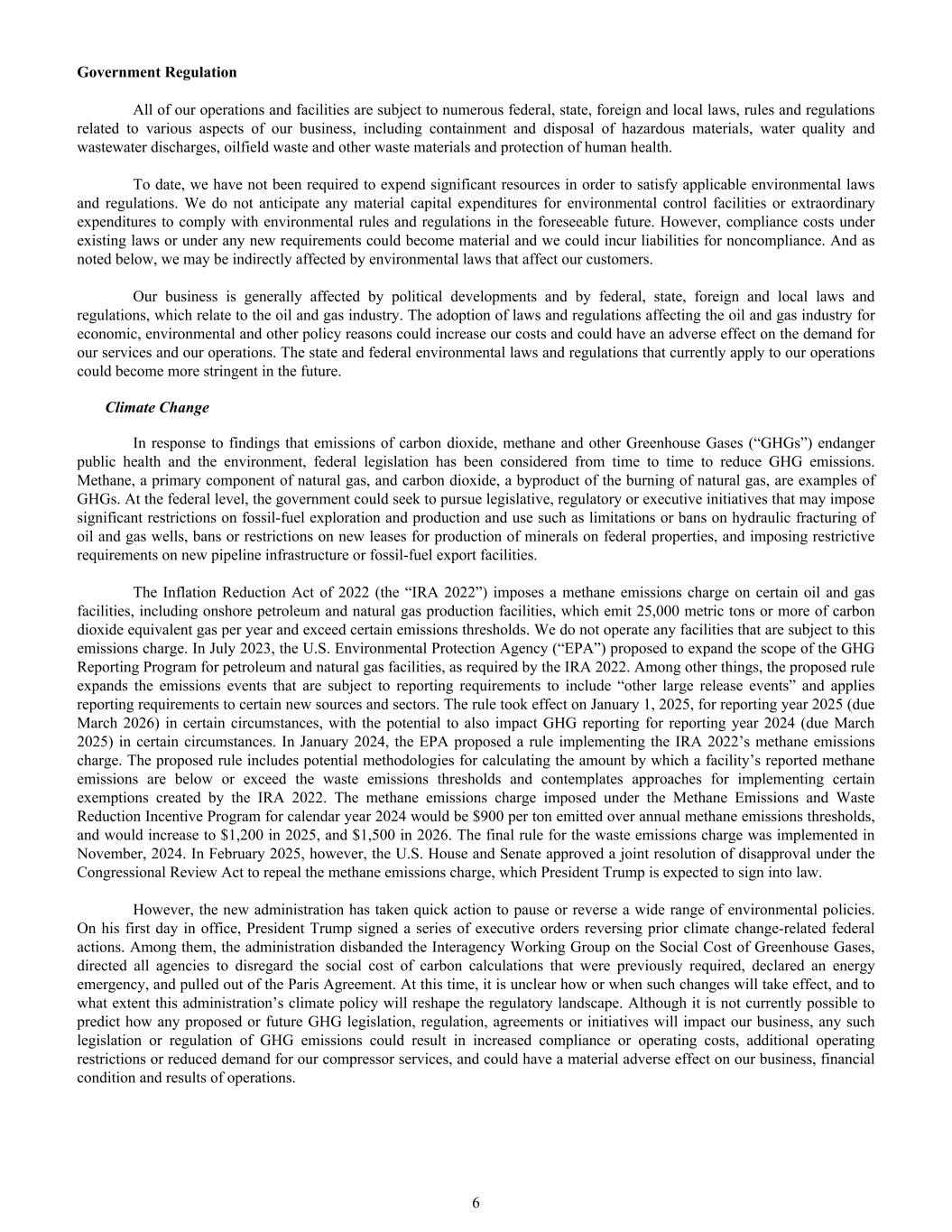 Government Regulation All of our operations and facilities are subject to numerous federal, state, foreign and local laws, rules and regulations related to various aspects of our business, including containment and disposal of hazardous materials, water quality and wastewater discharges, oilfield waste and other waste materials and protection of human health. To date, we have not been required to expend significant resources in order to satisfy applicable environmental laws and regulations. We do not anticipate any material capital expenditures for environmental control facilities or extraordinary expenditures to comply with environmental rules and regulations in the foreseeable future. However, compliance costs under existing laws or under any new requirements could become material and we could incur liabilities for noncompliance. And as noted below, we may be indirectly affected by environmental laws that affect our customers. Our business is generally affected by political developments and by federal, state, foreign and local laws and regulations, which relate to the oil and gas industry. The adoption of laws and regulations affecting the oil and gas industry for economic, environmental and other policy reasons could increase our costs and could have an adverse effect on the demand for our services and our operations. The state and federal environmental laws and regulations that currently apply to our operations could become more stringent in the future. Climate Change In response to findings that emissions of carbon dioxide, methane and other Greenhouse Gases (“GHGs”) endanger public health and the environment, federal legislation has been considered from time to time to reduce GHG emissions. Methane, a primary component of natural gas, and carbon dioxide, a byproduct of the burning of natural gas, are examples of GHGs. At the federal level, the government could seek to pursue legislative, regulatory or executive initiatives that may impose significant restrictions on fossil-fuel exploration and production and use such as limitations or bans on hydraulic fracturing of oil and gas wells, bans or restrictions on new leases for production of minerals on federal properties, and imposing restrictive requirements on new pipeline infrastructure or fossil-fuel export facilities. The Inflation Reduction Act of 2022 (the “IRA 2022”) imposes a methane emissions charge on certain oil and gas facilities, including onshore petroleum and natural gas production facilities, which emit 25,000 metric tons or more of carbon dioxide equivalent gas per year and exceed certain emissions thresholds. We do not operate any facilities that are subject to this emissions charge. In July 2023, the U.S. Environmental Protection Agency (“EPA”) proposed to expand the scope of the GHG Reporting Program for petroleum and natural gas facilities, as required by the IRA 2022. Among other things, the proposed rule expands the emissions events that are subject to reporting requirements to include “other large release events” and applies reporting requirements to certain new sources and sectors. The rule took effect on January 1, 2025, for reporting year 2025 (due March 2026) in certain circumstances, with the potential to also impact GHG reporting for reporting year 2024 (due March 2025) in certain circumstances. In January 2024, the EPA proposed a rule implementing the IRA 2022’s methane emissions charge. The proposed rule includes potential methodologies for calculating the amount by which a facility’s reported methane emissions are below or exceed the waste emissions thresholds and contemplates approaches for implementing certain exemptions created by the IRA 2022. The methane emissions charge imposed under the Methane Emissions and Waste Reduction Incentive Program for calendar year 2024 would be $900 per ton emitted over annual methane emissions thresholds, and would increase to $1,200 in 2025, and $1,500 in 2026. The final rule for the waste emissions charge was implemented in November, 2024. In February 2025, however, the U.S. House and Senate approved a joint resolution of disapproval under the Congressional Review Act to repeal the methane emissions charge, which President Trump is expected to sign into law. However, the new administration has taken quick action to pause or reverse a wide range of environmental policies. On his first day in office, President Trump signed a series of executive orders reversing prior climate change-related federal actions. Among them, the administration disbanded the Interagency Working Group on the Social Cost of Greenhouse Gases, directed all agencies to disregard the social cost of carbon calculations that were previously required, declared an energy emergency, and pulled out of the Paris Agreement. At this time, it is unclear how or when such changes will take effect, and to what extent this administration’s climate policy will reshape the regulatory landscape. Although it is not currently possible to predict how any proposed or future GHG legislation, regulation, agreements or initiatives will impact our business, any such legislation or regulation of GHG emissions could result in increased compliance or operating costs, additional operating restrictions or reduced demand for our compressor services, and could have a material adverse effect on our business, financial condition and results of operations. 6
