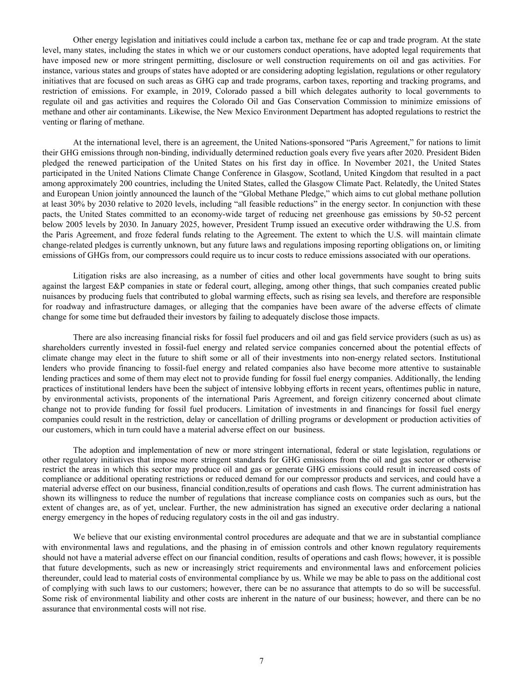 Other energy legislation and initiatives could include a carbon tax, methane fee or cap and trade program. At the state level, many states, including the states in which we or our customers conduct operations, have adopted legal requirements that have imposed new or more stringent permitting, disclosure or well construction requirements on oil and gas activities. For instance, various states and groups of states have adopted or are considering adopting legislation, regulations or other regulatory initiatives that are focused on such areas as GHG cap and trade programs, carbon taxes, reporting and tracking programs, and restriction of emissions. For example, in 2019, Colorado passed a bill which delegates authority to local governments to regulate oil and gas activities and requires the Colorado Oil and Gas Conservation Commission to minimize emissions of methane and other air contaminants. Likewise, the New Mexico Environment Department has adopted regulations to restrict the venting or flaring of methane. At the international level, there is an agreement, the United Nations-sponsored “Paris Agreement,” for nations to limit their GHG emissions through non-binding, individually determined reduction goals every five years after 2020. President Biden pledged the renewed participation of the United States on his first day in office. In November 2021, the United States participated in the United Nations Climate Change Conference in Glasgow, Scotland, United Kingdom that resulted in a pact among approximately 200 countries, including the United States, called the Glasgow Climate Pact. Relatedly, the United States and European Union jointly announced the launch of the “Global Methane Pledge,” which aims to cut global methane pollution at least 30% by 2030 relative to 2020 levels, including “all feasible reductions” in the energy sector. In conjunction with these pacts, the United States committed to an economy-wide target of reducing net greenhouse gas emissions by 50-52 percent below 2005 levels by 2030. In January 2025, however, President Trump issued an executive order withdrawing the U.S. from the Paris Agreement, and froze federal funds relating to the Agreement. The extent to which the U.S. will maintain climate change-related pledges is currently unknown, but any future laws and regulations imposing reporting obligations on, or limiting emissions of GHGs from, our compressors could require us to incur costs to reduce emissions associated with our operations. Litigation risks are also increasing, as a number of cities and other local governments have sought to bring suits against the largest E&P companies in state or federal court, alleging, among other things, that such companies created public nuisances by producing fuels that contributed to global warming effects, such as rising sea levels, and therefore are responsible for roadway and infrastructure damages, or alleging that the companies have been aware of the adverse effects of climate change for some time but defrauded their investors by failing to adequately disclose those impacts. There are also increasing financial risks for fossil fuel producers and oil and gas field service providers (such as us) as shareholders currently invested in fossil-fuel energy and related service companies concerned about the potential effects of climate change may elect in the future to shift some or all of their investments into non-energy related sectors. Institutional lenders who provide financing to fossil-fuel energy and related companies also have become more attentive to sustainable lending practices and some of them may elect not to provide funding for fossil fuel energy companies. Additionally, the lending practices of institutional lenders have been the subject of intensive lobbying efforts in recent years, oftentimes public in nature, by environmental activists, proponents of the international Paris Agreement, and foreign citizenry concerned about climate change not to provide funding for fossil fuel producers. Limitation of investments in and financings for fossil fuel energy companies could result in the restriction, delay or cancellation of drilling programs or development or production activities of our customers, which in turn could have a material adverse effect on our business. The adoption and implementation of new or more stringent international, federal or state legislation, regulations or other regulatory initiatives that impose more stringent standards for GHG emissions from the oil and gas sector or otherwise restrict the areas in which this sector may produce oil and gas or generate GHG emissions could result in increased costs of compliance or additional operating restrictions or reduced demand for our compressor products and services, and could have a material adverse effect on our business, financial condition,results of operations and cash flows. The current administration has shown its willingness to reduce the number of regulations that increase compliance costs on companies such as ours, but the extent of changes are, as of yet, unclear. Further, the new administration has signed an executive order declaring a national energy emergency in the hopes of reducing regulatory costs in the oil and gas industry. We believe that our existing environmental control procedures are adequate and that we are in substantial compliance with environmental laws and regulations, and the phasing in of emission controls and other known regulatory requirements should not have a material adverse effect on our financial condition, results of operations and cash flows; however, it is possible that future developments, such as new or increasingly strict requirements and environmental laws and enforcement policies thereunder, could lead to material costs of environmental compliance by us. While we may be able to pass on the additional cost of complying with such laws to our customers; however, there can be no assurance that attempts 