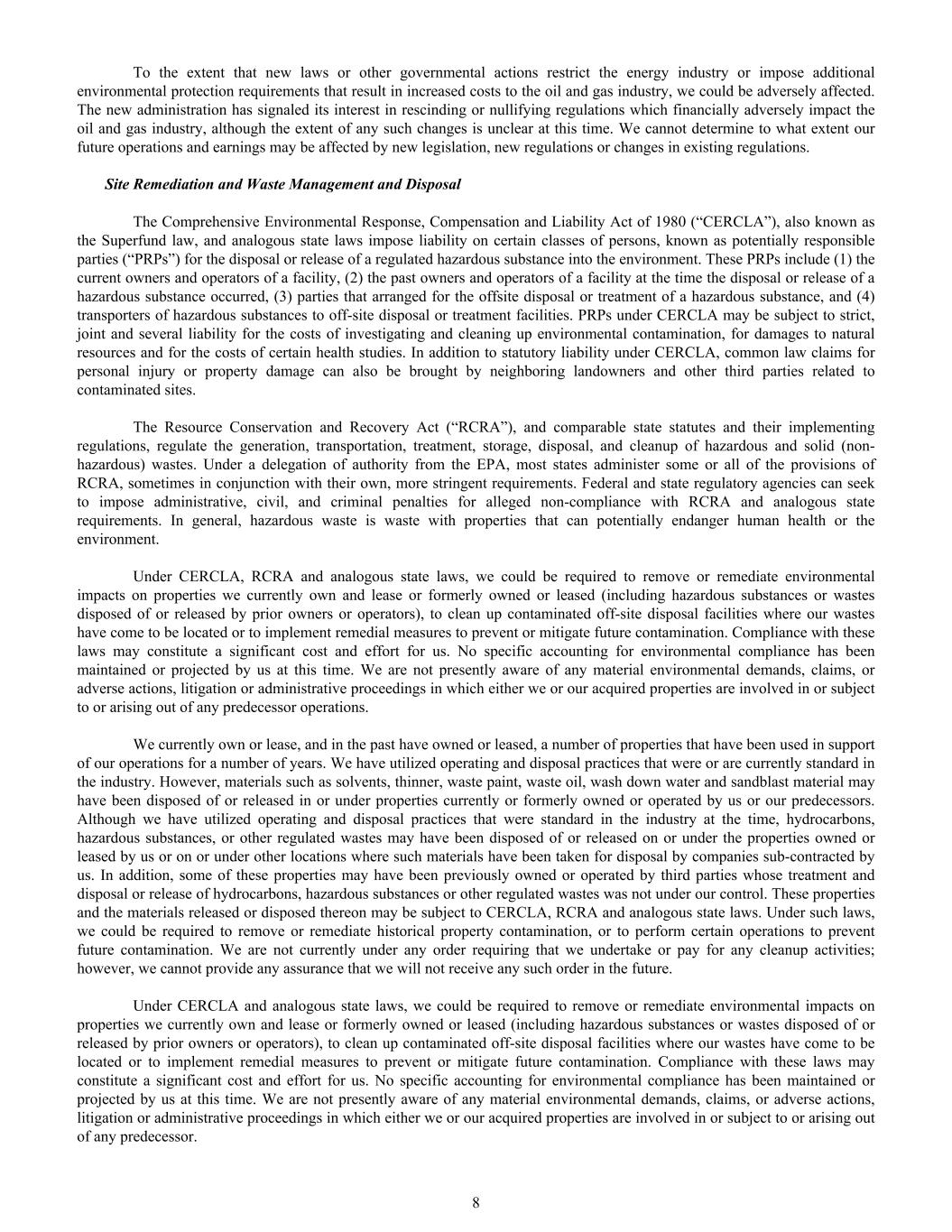 To the extent that new laws or other governmental actions restrict the energy industry or impose additional environmental protection requirements that result in increased costs to the oil and gas industry, we could be adversely affected. The new administration has signaled its interest in rescinding or nullifying regulations which financially adversely impact the oil and gas industry, although the extent of any such changes is unclear at this time. We cannot determine to what extent our future operations and earnings may be affected by new legislation, new regulations or changes in existing regulations. Site Remediation and Waste Management and Disposal The Comprehensive Environmental Response, Compensation and Liability Act of 1980 (“CERCLA”), also known as the Superfund law, and analogous state laws impose liability on certain classes of persons, known as potentially responsible parties (“PRPs”) for the disposal or release of a regulated hazardous substance into the environment. These PRPs include (1) the current owners and operators of a facility, (2) the past owners and operators of a facility at the time the disposal or release of a hazardous substance occurred, (3) parties that arranged for the offsite disposal or treatment of a hazardous substance, and (4) transporters of hazardous substances to off-site disposal or treatment facilities. PRPs under CERCLA may be subject to strict, joint and several liability for the costs of investigating and cleaning up environmental contamination, for damages to natural resources and for the costs of certain health studies. In addition to statutory liability under CERCLA, common law claims for personal injury or property damage can also be brought by neighboring landowners and other third parties related to contaminated sites. The Resource Conservation and Recovery Act (“RCRA”), and comparable state statutes and their implementing regulations, regulate the generation, transportation, treatment, storage, disposal, and cleanup of hazardous and solid (non- hazardous) wastes. Under a delegation of authority from the EPA, most states administer some or all of the provisions of RCRA, sometimes in conjunction with their own, more stringent requirements. Federal and state regulatory agencies can seek to impose administrative, civil, and criminal penalties for alleged non-compliance with RCRA and analogous state requirements. In general, hazardous waste is waste with properties that can potentially endanger human health or the environment. Under CERCLA, RCRA and analogous state laws, we could be required to remove or remediate environmental impacts on properties we currently own and lease or formerly owned or leased (including hazardous substances or wastes disposed of or released by prior owners or operators), to clean up contaminated off-site disposal facilities where our wastes have come to be located or to implement remedial measures to prevent or mitigate future contamination. Compliance with these laws may constitute a significant cost and effort for us. No specific accounting for environmental compliance has been maintained or projected by us at this time. We are not presently aware of any material environmental demands, claims, or adverse actions, litigation or administrative proceedings in which either we or our acquired properties are involved in or subject to or arising out of any predecessor operations. We currently own or lease, and in the past have owned or leased, a number of properties that have been used in support of our operations for a number of years. We have utilized operating and disposal practices that were or are currently standard in the industry. However, materials such as solvents, thinner, waste paint, waste oil, wash down water and sandblast material may have been disposed of or released in or under properties currently or formerly owned or operated by us or our predecessors. Although we have utilized operating and disposal practices that were standard in the industry at the time, hydrocarbons, hazardous substances, or other regulated wastes may have been disposed of or released on or under the properties owned or leased by us or on or under other locations where such materials have been taken for disposal by companies sub-contracted by us. In addition, some of these properties may have been previously owned or operated by third parties whose treatment and disposal or release of hydrocarbons, hazardous substances or other regulated wastes was not under our control. These properties and the materials released or disposed thereon may be subject to CERCLA, RCRA and analogous state laws. Under such laws, we could be required to remove or remediate historical property contamination, or to perform certain operations to prevent future contamination. We are not currently under any order requiring that we undertake or pay for any cleanup activities; however, we cannot provide any assurance that we will not receive any such order in the future. Under CERCLA and analogous state laws, we could be required to remove or remediate environmental impacts on properties we currently own and lease or formerly owned or leased (including hazardous substances or wastes disposed of or released by prior owners or operators), to clean up contaminated off-site disposal facilities where our wastes have come to be located or to implement remedial measures to prevent or mitigate future contamination. Compliance with these laws may constitute a significant cost and effort for us. No specific accounting for environmental compliance has been maintained or projected by us at this time. We are not presently aware of any material environmental demands, claims, or adverse actions, litigation or administrative proceedings in which either we or our acquired properties are involved in or subject to or arising out of any predecessor. 8