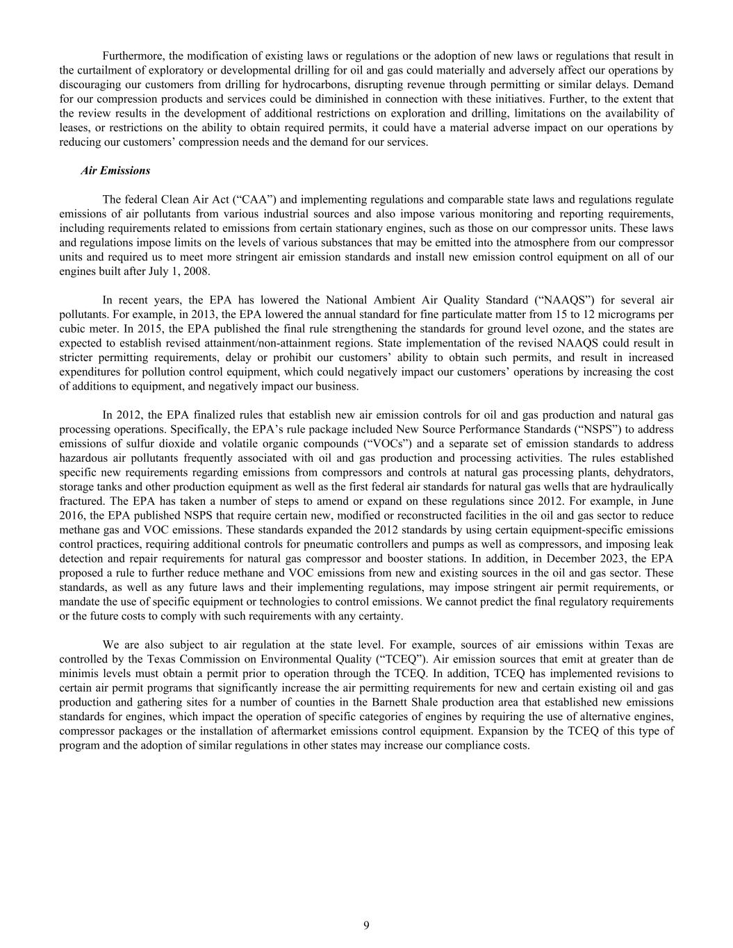 Furthermore, the modification of existing laws or regulations or the adoption of new laws or regulations that result in the curtailment of exploratory or developmental drilling for oil and gas could materially and adversely affect our operations by discouraging our customers from drilling for hydrocarbons, disrupting revenue through permitting or similar delays. Demand for our compression products and services could be diminished in connection with these initiatives. Further, to the extent that the review results in the development of additional restrictions on exploration and drilling, limitations on the availability of leases, or restrictions on the ability to obtain required permits, it could have a material adverse impact on our operations by reducing our customers’ compression needs and the demand for our services. Air Emissions The federal Clean Air Act (“CAA”) and implementing regulations and comparable state laws and regulations regulate emissions of air pollutants from various industrial sources and also impose various monitoring and reporting requirements, including requirements related to emissions from certain stationary engines, such as those on our compressor units. These laws and regulations impose limits on the levels of various substances that may be emitted into the atmosphere from our compressor units and required us to meet more stringent air emission standards and install new emission control equipment on all of our engines built after July 1, 2008. In recent years, the EPA has lowered the National Ambient Air Quality Standard (“NAAQS”) for several air pollutants. For example, in 2013, the EPA lowered the annual standard for fine particulate matter from 15 to 12 micrograms per cubic meter. In 2015, the EPA published the final rule strengthening the standards for ground level ozone, and the states are expected to establish revised attainment/non-attainment regions. State implementation of the revised NAAQS could result in stricter permitting requirements, delay or prohibit our customers’ ability to obtain such permits, and result in increased expenditures for pollution control equipment, which could negatively impact our customers’ operations by increasing the cost of additions to equipment, and negatively impact our business. In 2012, the EPA finalized rules that establish new air emission controls for oil and gas production and natural gas processing operations. Specifically, the EPA’s rule package included New Source Performance Standards (“NSPS”) to address emissions of sulfur dioxide and volatile organic compounds (“VOCs”) and a separate set of emission standards to address hazardous air pollutants frequently associated with oil and gas production and processing activities. The rules established specific new requirements regarding emissions from compressors and controls at natural gas processing plants, dehydrators, storage tanks and other production equipment as well as the first federal air standards for natural gas wells that are hydraulically fractured. The EPA has taken a number of steps to amend or expand on these regulations since 2012. For example, in June 2016, the EPA published NSPS that require certain new, modified or reconstructed facilities in the oil and gas sector to reduce methane gas and VOC emissions. These standards expanded the 2012 standards by using certain equipment-specific emissions control practices, requiring additional controls for pneumatic controllers and pumps as well as compressors, and imposing leak detection and repair requirements for natural gas compressor and booster stations. In addition, in December 2023, the EPA proposed a rule to further reduce methane and VOC emissions from new and existing sources in the oil and gas sector. These standards, as well as any future laws and their implementing regulations, may impose stringent air permit requirements, or mandate the use of specific equipment or technologies to control emissions. We cannot predict the final regulatory requirements or the future costs to comply with such requirements with any certainty. We are also subject to air regulation at the state level. For example, sources of air emissions within Texas are controlled by the Texas Commission on Environmental Quality (“TCEQ”). Air emission sources that emit at greater than de minimis levels must obtain a permit prior to operation through the TCEQ. In addition, TCEQ has implemented revisions to certain air permit programs that significantly increase the air permitting requirements for new and certain existing oil and gas production and gathering sites for a number of counties in the Barnett Shale production area that established new emissions standards for engines, which impact the operation of specific categories of engines by requiring the use of alternative engines, compressor packages or the installation of aftermarket emissions control equipment. Expansion by the TCEQ of this type of program and the adoption of similar regulations in other states may increase our compliance costs. 9
