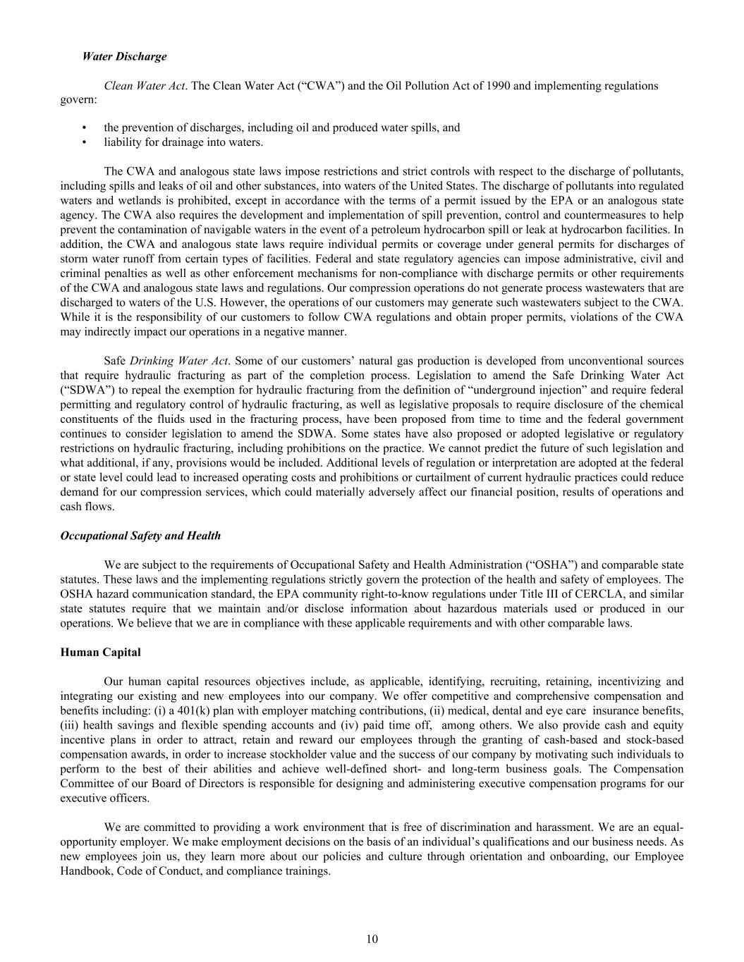 Water Discharge Clean Water Act. The Clean Water Act (“CWA”) and the Oil Pollution Act of 1990 and implementing regulations govern: • the prevention of discharges, including oil and produced water spills, and • liability for drainage into waters. The CWA and analogous state laws impose restrictions and strict controls with respect to the discharge of pollutants, including spills and leaks of oil and other substances, into waters of the United States. The discharge of pollutants into regulated waters and wetlands is prohibited, except in accordance with the terms of a permit issued by the EPA or an analogous state agency. The CWA also requires the development and implementation of spill prevention, control and countermeasures to help prevent the contamination of navigable waters in the event of a petroleum hydrocarbon spill or leak at hydrocarbon facilities. In addition, the CWA and analogous state laws require individual permits or coverage under general permits for discharges of storm water runoff from certain types of facilities. Federal and state regulatory agencies can impose administrative, civil and criminal penalties as well as other enforcement mechanisms for non-compliance with discharge permits or other requirements of the CWA and analogous state laws and regulations. Our compression operations do not generate process wastewaters that are discharged to waters of the U.S. However, the operations of our customers may generate such wastewaters subject to the CWA. While it is the responsibility of our customers to follow CWA regulations and obtain proper permits, violations of the CWA may indirectly impact our operations in a negative manner. Safe Drinking Water Act. Some of our customers’ natural gas production is developed from unconventional sources that require hydraulic fracturing as part of the completion process. Legislation to amend the Safe Drinking Water Act (“SDWA”) to repeal the exemption for hydraulic fracturing from the definition of “underground injection” and require federal permitting and regulatory control of hydraulic fracturing, as well as legislative proposals to require disclosure of the chemical constituents of the fluids used in the fracturing process, have been proposed from time to time and the federal government continues to consider legislation to amend the SDWA. Some states have also proposed or adopted legislative or regulatory restrictions on hydraulic fracturing, including prohibitions on the practice. We cannot predict the future of such legislation and what additional, if any, provisions would be included. Additional levels of regulation or interpretation are adopted at the federal or state level could lead to increased operating costs and prohibitions or curtailment of current hydraulic practices could reduce demand for our compression services, which could materially adversely affect our financial position, results of operations and cash flows. Occupational Safety and Health We are subject to the requirements of Occupational Safety and Health Administration (“OSHA”) and comparable state statutes. These laws and the implementing regulations strictly govern the protection of the health and safety of employees. The OSHA hazard communication standard, the EPA community right-to-know regulations under Title III of CERCLA, and similar state statutes require that we maintain and/or disclose information about hazardous materials used or produced in our operations. We believe that we are in compliance with these applicable requirements and with other comparable laws. Human Capital Our human capital resources objectives include, as applicable, identifying, recruiting, retaining, incentivizing and integrating our existing and new employees into our company. We offer competitive and comprehensive compensation and benefits including: (i) a 401(k) plan with employer matching contributions, (ii) medical, dental and eye care insurance benefits, (iii) health savings and flexible spending accounts and (iv) paid time off, among others. We also provide cash and equity incentive plans in order to attract, retain and reward our employees through the granting of cash-based and stock-based compensation awards, in order to increase stockholder value and the success of our company by motivating such individuals to perform to the best of their abilities and achieve well-defined short- and long-term business goals. The Compensation Committee of our Board of Directors is responsible for designing and administering executive compensation programs for our executive officers. We are committed to providing a work environment that is free of discrimination and harassment. We are an equal- opportunity employer. We make employment decisions on the basis of an individual’s qualifications and our business needs. As new employees join us, they learn more about our policies and culture through orientation and onboarding, our Employee Handbook, Code of Conduct, and compliance trainings. 10