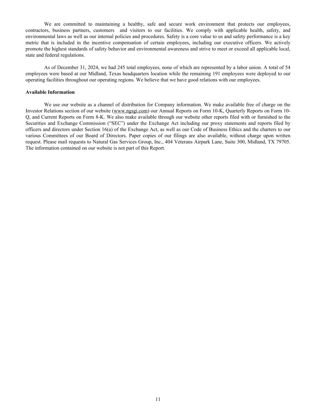 We are committed to maintaining a healthy, safe and secure work environment that protects our employees, contractors, business partners, customers and visitors to our facilities. We comply with applicable health, safety, and environmental laws as well as our internal policies and procedures. Safety is a core value to us and safety performance is a key metric that is included in the incentive compensation of certain employees, including our executive officers. We actively promote the highest standards of safety behavior and environmental awareness and strive to meet or exceed all applicable local, state and federal regulations. As of December 31, 2024, we had 245 total employees, none of which are represented by a labor union. A total of 54 employees were based at our Midland, Texas headquarters location while the remaining 191 employees were deployed to our operating facilities throughout our operating regions. We believe that we have good relations with our employees. Available Information We use our website as a channel of distribution for Company information. We make available free of charge on the Investor Relations section of our website (www.ngsgi.com) our Annual Reports on Form 10-K, Quarterly Reports on Form 10- Q, and Current Reports on Form 8-K. We also make available through our website other reports filed with or furnished to the Securities and Exchange Commission (“SEC”) under the Exchange Act including our proxy statements and reports filed by officers and directors under Section 16(a) of the Exchange Act, as well as our Code of Business Ethics and the charters to our various Committees of our Board of Directors. Paper copies of our filings are also available, without charge upon written request. Please mail requests to Natural Gas Services Group, Inc., 404 Veterans Airpark Lane, Suite 300, Midland, TX 79705. The information contained on our website is not part of this Report. 11