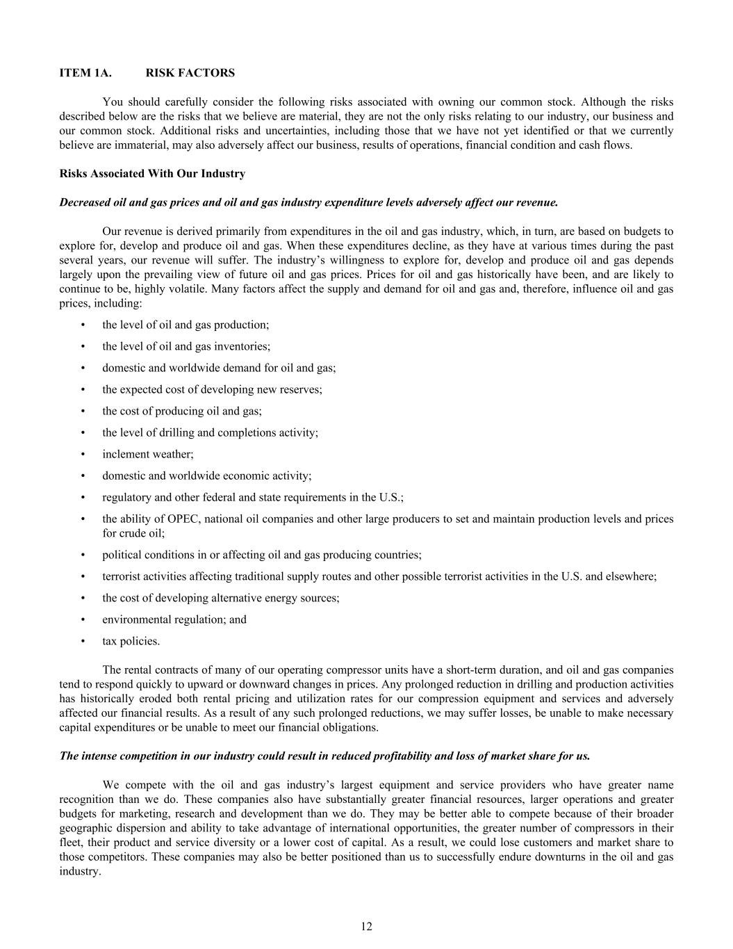 ITEM 1A. RISK FACTORS You should carefully consider the following risks associated with owning our common stock. Although the risks described below are the risks that we believe are material, they are not the only risks relating to our industry, our business and our common stock. Additional risks and uncertainties, including those that we have not yet identified or that we currently believe are immaterial, may also adversely affect our business, results of operations, financial condition and cash flows. Risks Associated With Our Industry Decreased oil and gas prices and oil and gas industry expenditure levels adversely affect our revenue. Our revenue is derived primarily from expenditures in the oil and gas industry, which, in turn, are based on budgets to explore for, develop and produce oil and gas. When these expenditures decline, as they have at various times during the past several years, our revenue will suffer. The industry’s willingness to explore for, develop and produce oil and gas depends largely upon the prevailing view of future oil and gas prices. Prices for oil and gas historically have been, and are likely to continue to be, highly volatile. Many factors affect the supply and demand for oil and gas and, therefore, influence oil and gas prices, including: • the level of oil and gas production; • the level of oil and gas inventories; • domestic and worldwide demand for oil and gas; • the expected cost of developing new reserves; • the cost of producing oil and gas; • the level of drilling and completions activity; • inclement weather; • domestic and worldwide economic activity; • regulatory and other federal and state requirements in the U.S.; • the ability of OPEC, national oil companies and other large producers to set and maintain production levels and prices for crude oil; • political conditions in or affecting oil and gas producing countries; • terrorist activities affecting traditional supply routes and other possible terrorist activities in the U.S. and elsewhere; • the cost of developing alternative energy sources; • environmental regulation; and • tax policies. The rental contracts of many of our operating compressor units have a short-term duration, and oil and gas companies tend to respond quickly to upward or downward changes in prices. Any prolonged reduction in drilling and production activities has historically eroded both rental pricing and utilization rates for our compression equipment and services and adversely affected our financial results. As a result of any such prolonged reductions, we may suffer losses, be unable to make necessary capital expenditures or be unable to meet our financial obligations. The intense competition in our industry could result in reduced profitability and loss of market share for us. We compete with the oil and gas industry’s largest equipment and service providers who have greater name recognition than we do. These companies also have substantially greater financial resources, larger operations and greater budgets for marketing, research and development than we do. They may be better able to compete because of their broader geographic dispersion and ability to take advantage of international opportunities, the greater number of compressors in their fleet, their product and service diversity or a lower cost of capital. As a result, we could lose customers and market share to those competitors. These companies may also be better positioned than us to successfully endure downturns in the oil and gas industry. 12