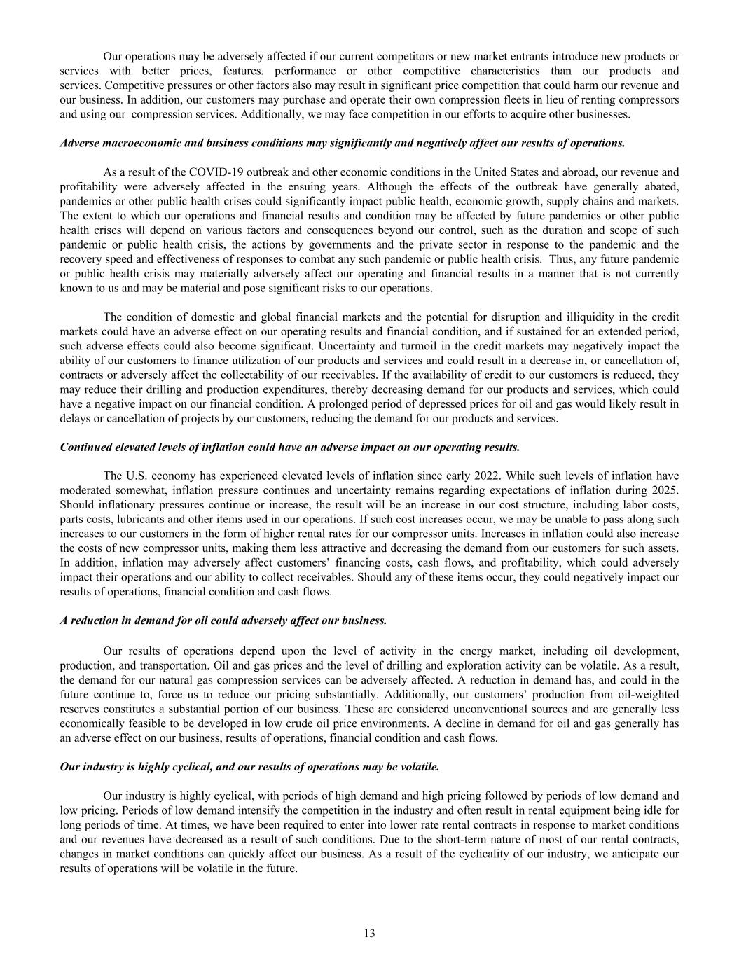 Our operations may be adversely affected if our current competitors or new market entrants introduce new products or services with better prices, features, performance or other competitive characteristics than our products and services. Competitive pressures or other factors also may result in significant price competition that could harm our revenue and our business. In addition, our customers may purchase and operate their own compression fleets in lieu of renting compressors and using our compression services. Additionally, we may face competition in our efforts to acquire other businesses. Adverse macroeconomic and business conditions may significantly and negatively affect our results of operations. As a result of the COVID-19 outbreak and other economic conditions in the United States and abroad, our revenue and profitability were adversely affected in the ensuing years. Although the effects of the outbreak have generally abated, pandemics or other public health crises could significantly impact public health, economic growth, supply chains and markets. The extent to which our operations and financial results and condition may be affected by future pandemics or other public health crises will depend on various factors and consequences beyond our control, such as the duration and scope of such pandemic or public health crisis, the actions by governments and the private sector in response to the pandemic and the recovery speed and effectiveness of responses to combat any such pandemic or public health crisis. Thus, any future pandemic or public health crisis may materially adversely affect our operating and financial results in a manner that is not currently known to us and may be material and pose significant risks to our operations. The condition of domestic and global financial markets and the potential for disruption and illiquidity in the credit markets could have an adverse effect on our operating results and financial condition, and if sustained for an extended period, such adverse effects could also become significant. Uncertainty and turmoil in the credit markets may negatively impact the ability of our customers to finance utilization of our products and services and could result in a decrease in, or cancellation of, contracts or adversely affect the collectability of our receivables. If the availability of credit to our customers is reduced, they may reduce their drilling and production expenditures, thereby decreasing demand for our products and services, which could have a negative impact on our financial condition. A prolonged period of depressed prices for oil and gas would likely result in delays or cancellation of projects by our customers, reducing the demand for our products and services. Continued elevated levels of inflation could have an adverse impact on our operating results. The U.S. economy has experienced elevated levels of inflation since early 2022. While such levels of inflation have moderated somewhat, inflation pressure continues and uncertainty remains regarding expectations of inflation during 2025. Should inflationary pressures continue or increase, the result will be an increase in our cost structure, including labor costs, parts costs, lubricants and other items used in our operations. If such cost increases occur, we may be unable to pass along such increases to our customers in the form of higher rental rates for our compressor units. Increases in inflation could also increase the costs of new compressor units, making them less attractive and decreasing the demand from our customers for such assets. In addition, inflation may adversely affect customers’ financing costs, cash flows, and profitability, which could adversely impact their operations and our ability to collect receivables. Should any of these items occur, they could negatively impact our results of operations, financial condition and cash flows. A reduction in demand for oil could adversely affect our business. Our results of operations depend upon the level of activity in the energy market, including oil development, production, and transportation. Oil and gas prices and the level of drilling and exploration activity can be volatile. As a result, the demand for our natural gas compression services can be adversely affected. A reduction in demand has, and could in the future continue to, force us to reduce our pricing substantially. Additionally, our customers’ production from oil-weighted reserves constitutes a substantial portion of our business. These are considered unconventional sources and are generally less economically feasible to be developed in low crude oil price environments. A decline in demand for oil and gas generally has an adverse effect on our business, results of operations, financial condition and cash flows. Our industry is highly cyclical, and our results of operations may be volatile. Our industry is highly cyclical, with periods of high demand and high pricing followed by periods of low demand and low pricing. Periods of low demand intensify the competition in the industry and often result in rental equipment being idle for long periods of time. At times, we have been required to enter into lower rate rental contracts in response to market conditions and our revenues have decreased as a result of such conditions. Due to the short-term nature of most of our rental contracts, changes in market conditions can quickly affect our business. As a result of the cyclicality of our industry, we anticipate our results of operations will be volatile in the future. 13