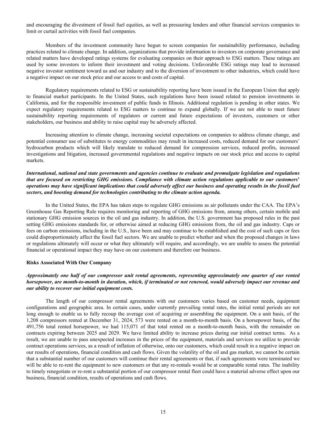 and encouraging the divestment of fossil fuel equities, as well as pressuring lenders and other financial services companies to limit or curtail activities with fossil fuel companies. Members of the investment community have begun to screen companies for sustainability performance, including practices related to climate change. In addition, organizations that provide information to investors on corporate governance and related matters have developed ratings systems for evaluating companies on their approach to ESG matters. These ratings are used by some investors to inform their investment and voting decisions. Unfavorable ESG ratings may lead to increased negative investor sentiment toward us and our industry and to the diversion of investment to other industries, which could have a negative impact on our stock price and our access to and costs of capital. Regulatory requirements related to ESG or sustainability reporting have been issued in the European Union that apply to financial market participants. In the United States, such regulations have been issued related to pension investments in California, and for the responsible investment of public funds in Illinois. Additional regulation is pending in other states. We expect regulatory requirements related to ESG matters to continue to expand globally. If we are not able to meet future sustainability reporting requirements of regulators or current and future expectations of investors, customers or other stakeholders, our business and ability to raise capital may be adversely affected. Increasing attention to climate change, increasing societal expectations on companies to address climate change, and potential consumer use of substitutes to energy commodities may result in increased costs, reduced demand for our customers’ hydrocarbon products which will likely translate to reduced demand for compression services, reduced profits, increased investigations and litigation, increased governmental regulations and negative impacts on our stock price and access to capital markets. International, national and state governments and agencies continue to evaluate and promulgate legislation and regulations that are focused on restricting GHG emissions. Compliance with climate action regulations applicable to our customers’ operations may have significant implications that could adversely affect our business and operating results in the fossil fuel sectors, and boosting demand for technologies contributing to the climate action agenda. In the United States, the EPA has taken steps to regulate GHG emissions as air pollutants under the CAA. The EPA’s Greenhouse Gas Reporting Rule requires monitoring and reporting of GHG emissions from, among others, certain mobile and stationary GHG emission sources in the oil and gas industry. In addition, the U.S. government has proposed rules in the past setting GHG emissions standards for, or otherwise aimed at reducing GHG emissions from, the oil and gas industry. Caps or fees on carbon emissions, including in the U.S., have been and may continue to be established and the cost of such caps or fees could disproportionately affect the fossil fuel sectors. We are unable to predict whether and when the proposed changes in laws or regulations ultimately will occur or what they ultimately will require, and accordingly, we are unable to assess the potential financial or operational impact they may have on our customers and therefore our business. Risks Associated With Our Company Approximately one half of our compressor unit rental agreements, representing approximately one quarter of our rented horsepower, are month-to-month in duration, which, if terminated or not renewed, would adversely impact our revenue and our ability to recover our initial equipment costs. The length of our compressor rental agreements with our customers varies based on customer needs, equipment configurations and geographic area. In certain cases, under currently prevailing rental rates, the initial rental periods are not long enough to enable us to fully recoup the average cost of acquiring or assembling the equipment. On a unit basis, of the 1,208 compressors rented at December 31, 2024, 573 were rented on a month-to-month basis. On a horsepower basis, of the 491,756 total rented horsepower, we had 115,071 of that total rented on a month-to-month basis, with the remainder on contracts expiring between 2025 and 2029. We have limited ability to increase prices during our initial contract terms. As a result, we are unable to pass unexpected increases in the prices of the equipment, materials and services we utilize to provide contract operations services, as a result of inflation of otherwise, onto our customers, which could result in a negative impact on our results of operations, financial condition and cash flows. Given the volatility of the oil and gas market, we cannot be certain that a substantial number of our customers will continue their rental agreements or that, if such agreements were terminated we will be able to re-rent the equipment to new customers or that any re-rentals would be at comparable rental rates. The inability to timely renegotiate or re-rent a substantial portion of our compressor rental fleet could have a material adverse effect upon our business, financial condition, results of operations and cash flows. 15