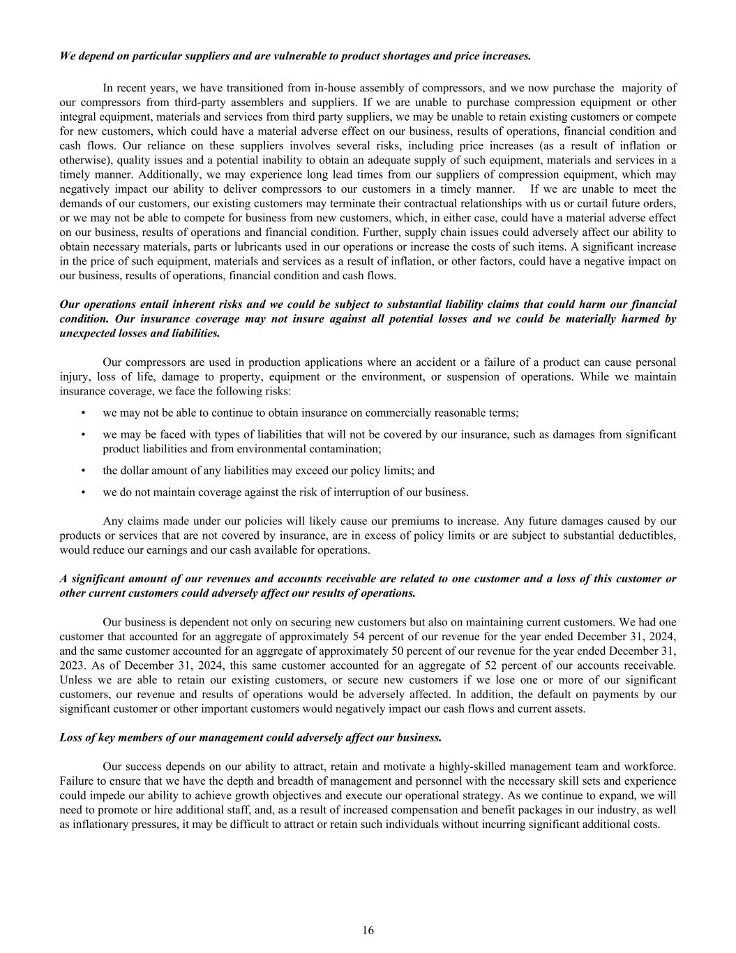 We depend on particular suppliers and are vulnerable to product shortages and price increases. In recent years, we have transitioned from in-house assembly of compressors, and we now purchase the majority of our compressors from third-party assemblers and suppliers. If we are unable to purchase compression equipment or other integral equipment, materials and services from third party suppliers, we may be unable to retain existing customers or compete for new customers, which could have a material adverse effect on our business, results of operations, financial condition and cash flows. Our reliance on these suppliers involves several risks, including price increases (as a result of inflation or otherwise), quality issues and a potential inability to obtain an adequate supply of such equipment, materials and services in a timely manner. Additionally, we may experience long lead times from our suppliers of compression equipment, which may negatively impact our ability to deliver compressors to our customers in a timely manner. If we are unable to meet the demands of our customers, our existing customers may terminate their contractual relationships with us or curtail future orders, or we may not be able to compete for business from new customers, which, in either case, could have a material adverse effect on our business, results of operations and financial condition. Further, supply chain issues could adversely affect our ability to obtain necessary materials, parts or lubricants used in our operations or increase the costs of such items. A significant increase in the price of such equipment, materials and services as a result of inflation, or other factors, could have a negative impact on our business, results of operations, financial condition and cash flows. Our operations entail inherent risks and we could be subject to substantial liability claims that could harm our financial condition. Our insurance coverage may not insure against all potential losses and we could be materially harmed by unexpected losses and liabilities. Our compressors are used in production applications where an accident or a failure of a product can cause personal injury, loss of life, damage to property, equipment or the environment, or suspension of operations. While we maintain insurance coverage, we face the following risks: • we may not be able to continue to obtain insurance on commercially reasonable terms; • we may be faced with types of liabilities that will not be covered by our insurance, such as damages from significant product liabilities and from environmental contamination; • the dollar amount of any liabilities may exceed our policy limits; and • we do not maintain coverage against the risk of interruption of our business. Any claims made under our policies will likely cause our premiums to increase. Any future damages caused by our products or services that are not covered by insurance, are in excess of policy limits or are subject to substantial deductibles, would reduce our earnings and our cash available for operations. A significant amount of our revenues and accounts receivable are related to one customer and a loss of this customer or other current customers could adversely affect our results of operations. Our business is dependent not only on securing new customers but also on maintaining current customers. We had one customer that accounted for an aggregate of approximately 54 percent of our revenue for the year ended December 31, 2024, and the same customer accounted for an aggregate of approximately 50 percent of our revenue for the year ended December 31, 2023. As of December 31, 2024, this same customer accounted for an aggregate of 52 percent of our accounts receivable. Unless we are able to retain our existing customers, or secure new customers if we lose one or more of our significant customers, our revenue and results of operations would be adversely affected. In addition, the default on payments by our significant customer or other important customers would negatively impact our cash flows and current assets. Loss of key members of our management could adversely affect our business. Our success depends on our ability to attract, retain and motivate a highly-skilled management team and workforce. Failure to ensure that we have the depth and breadth of management and personnel with the necessary skill sets and experience could impede our ability to achieve growth objectives and execute our operational strategy. As we continue to expand, we will need to promote or hire additional staff, and, as a result of increased compensation and benefit packages in our industry, as well as inflationary pressures, it may be difficult to attract or retain such individuals without incurring significant additional costs. 16