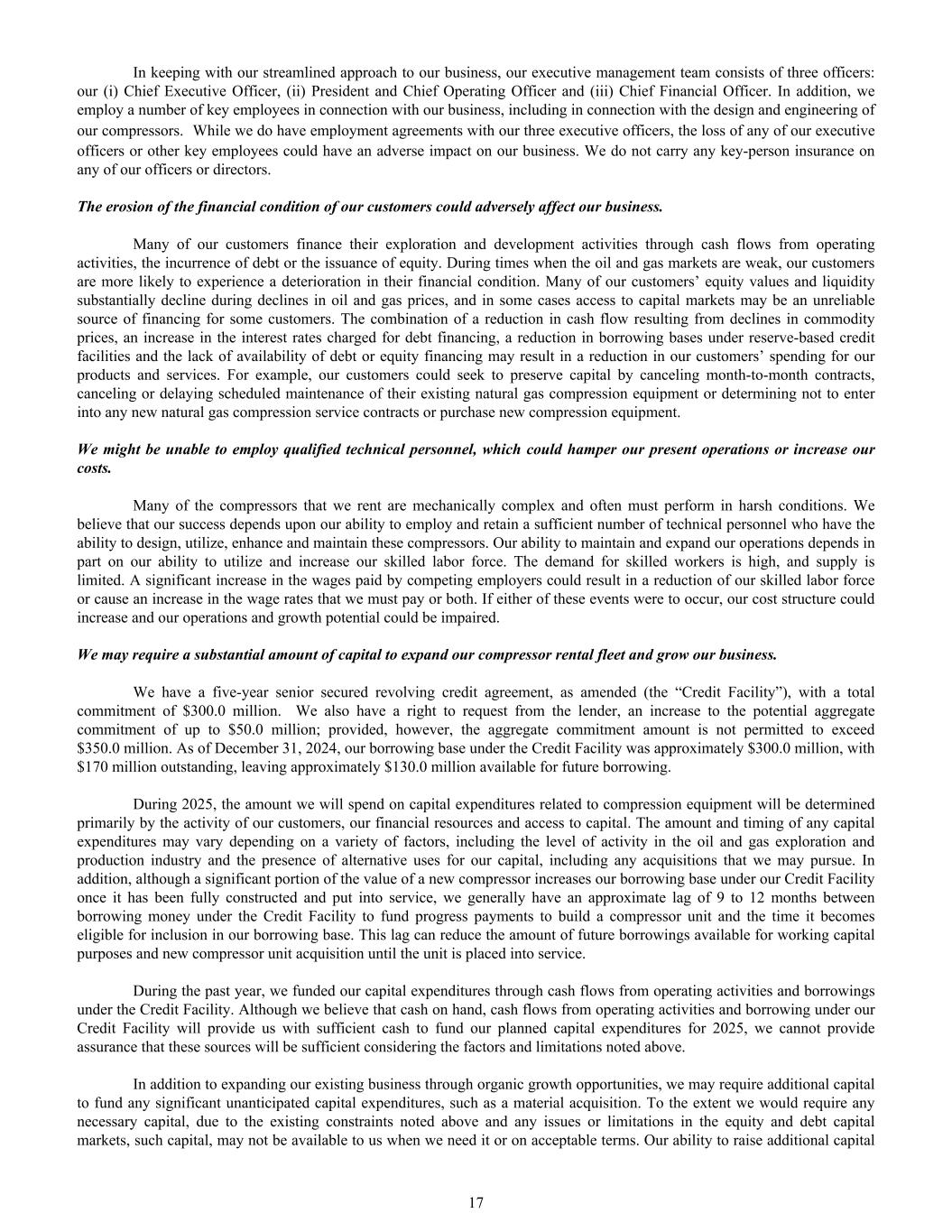 In keeping with our streamlined approach to our business, our executive management team consists of three officers: our (i) Chief Executive Officer, (ii) President and Chief Operating Officer and (iii) Chief Financial Officer. In addition, we employ a number of key employees in connection with our business, including in connection with the design and engineering of our compressors. While we do have employment agreements with our three executive officers, the loss of any of our executive officers or other key employees could have an adverse impact on our business. We do not carry any key-person insurance on any of our officers or directors. The erosion of the financial condition of our customers could adversely affect our business. Many of our customers finance their exploration and development activities through cash flows from operating activities, the incurrence of debt or the issuance of equity. During times when the oil and gas markets are weak, our customers are more likely to experience a deterioration in their financial condition. Many of our customers’ equity values and liquidity substantially decline during declines in oil and gas prices, and in some cases access to capital markets may be an unreliable source of financing for some customers. The combination of a reduction in cash flow resulting from declines in commodity prices, an increase in the interest rates charged for debt financing, a reduction in borrowing bases under reserve-based credit facilities and the lack of availability of debt or equity financing may result in a reduction in our customers’ spending for our products and services. For example, our customers could seek to preserve capital by canceling month-to-month contracts, canceling or delaying scheduled maintenance of their existing natural gas compression equipment or determining not to enter into any new natural gas compression service contracts or purchase new compression equipment. We might be unable to employ qualified technical personnel, which could hamper our present operations or increase our costs. Many of the compressors that we rent are mechanically complex and often must perform in harsh conditions. We believe that our success depends upon our ability to employ and retain a sufficient number of technical personnel who have the ability to design, utilize, enhance and maintain these compressors. Our ability to maintain and expand our operations depends in part on our ability to utilize and increase our skilled labor force. The demand for skilled workers is high, and supply is limited. A significant increase in the wages paid by competing employers could result in a reduction of our skilled labor force or cause an increase in the wage rates that we must pay or both. If either of these events were to occur, our cost structure could increase and our operations and growth potential could be impaired. We may require a substantial amount of capital to expand our compressor rental fleet and grow our business. We have a five-year senior secured revolving credit agreement, as amended (the “Credit Facility”), with a total commitment of $300.0 million. We also have a right to request from the lender, an increase to the potential aggregate commitment of up to $50.0 million; provided, however, the aggregate commitment amount is not permitted to exceed $350.0 million. As of December 31, 2024, our borrowing base under the Credit Facility was approximately $300.0 million, with $170 million outstanding, leaving approximately $130.0 million available for future borrowing. During 2025, the amount we will spend on capital expenditures related to compression equipment will be determined primarily by the activity of our customers, our financial resources and access to capital. The amount and timing of any capital expenditures may vary depending on a variety of factors, including the level of activity in the oil and gas exploration and production industry and the presence of alternative uses for our capital, including any acquisitions that we may pursue. In addition, although a significant portion of the value of a new compressor increases our borrowing base under our Credit Facility once it has been fully constructed and put into service, we generally have an approximate lag of 9 to 12 months between borrowing money under the Credit Facility to fund progress payments to build a compressor unit and the time it becomes eligible for inclusion in our borrowing base. This lag can reduce the amount of future borrowings available for working capital purposes and new compressor unit acquisition until the unit is placed into service. During the past year, we funded our capital expenditures through cash flows from operating activities and borrowings under the Credit Facility. Although we believe that cash on hand, cash flows from operating activities and borrowing under our Credit Facility will provide us with sufficient cash to fund our planned capital expenditures for 2025, we cannot provide assurance that these sources will be sufficient considering the factors and limitations noted above. In addition to expanding our existing business through organic growth opportunities, we may require additional capital to fund any significant unanticipated capital expenditures, such as a material acquisition. To the extent we would require any necessary capital, due to the existing constraints noted above and any issues or limitations in the equity and debt capital markets, such capital, may not be available to us when we need it or on acceptable terms. Our ability to raise additional capital 17