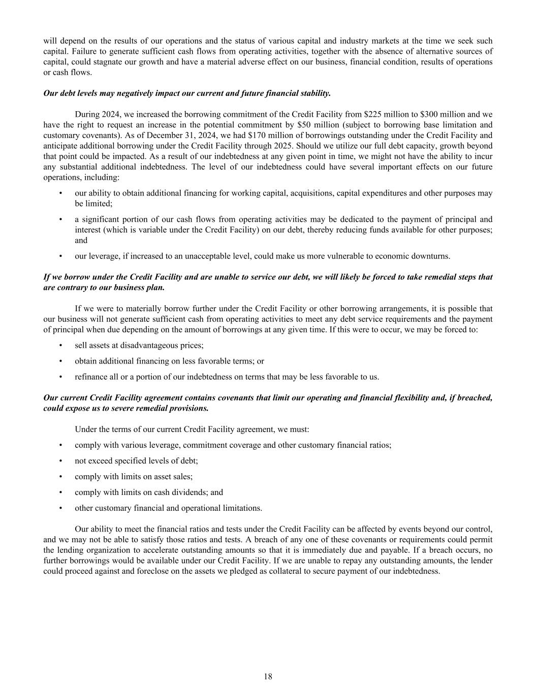 will depend on the results of our operations and the status of various capital and industry markets at the time we seek such capital. Failure to generate sufficient cash flows from operating activities, together with the absence of alternative sources of capital, could stagnate our growth and have a material adverse effect on our business, financial condition, results of operations or cash flows. Our debt levels may negatively impact our current and future financial stability. During 2024, we increased the borrowing commitment of the Credit Facility from $225 million to $300 million and we have the right to request an increase in the potential commitment by $50 million (subject to borrowing base limitation and customary covenants). As of December 31, 2024, we had $170 million of borrowings outstanding under the Credit Facility and anticipate additional borrowing under the Credit Facility through 2025. Should we utilize our full debt capacity, growth beyond that point could be impacted. As a result of our indebtedness at any given point in time, we might not have the ability to incur any substantial additional indebtedness. The level of our indebtedness could have several important effects on our future operations, including: • our ability to obtain additional financing for working capital, acquisitions, capital expenditures and other purposes may be limited; • a significant portion of our cash flows from operating activities may be dedicated to the payment of principal and interest (which is variable under the Credit Facility) on our debt, thereby reducing funds available for other purposes; and • our leverage, if increased to an unacceptable level, could make us more vulnerable to economic downturns. If we borrow under the Credit Facility and are unable to service our debt, we will likely be forced to take remedial steps that are contrary to our business plan. If we were to materially borrow further under the Credit Facility or other borrowing arrangements, it is possible that our business will not generate sufficient cash from operating activities to meet any debt service requirements and the payment of principal when due depending on the amount of borrowings at any given time. If this were to occur, we may be forced to: • sell assets at disadvantageous prices; • obtain additional financing on less favorable terms; or • refinance all or a portion of our indebtedness on terms that may be less favorable to us. Our current Credit Facility agreement contains covenants that limit our operating and financial flexibility and, if breached, could expose us to severe remedial provisions. Under the terms of our current Credit Facility agreement, we must: • comply with various leverage, commitment coverage and other customary financial ratios; • not exceed specified levels of debt; • comply with limits on asset sales; • comply with limits on cash dividends; and • other customary financial and operational limitations. Our ability to meet the financial ratios and tests under the Credit Facility can be affected by events beyond our control, and we may not be able to satisfy those ratios and tests. A breach of any one of these covenants or requirements could permit the lending organization to accelerate outstanding amounts so that it is immediately due and payable. If a breach occurs, no further borrowings would be available under our Credit Facility. If we are unable to repay any outstanding amounts, the lender could proceed against and foreclose on the assets we pledged as collateral to secure payment of our indebtedness. 18