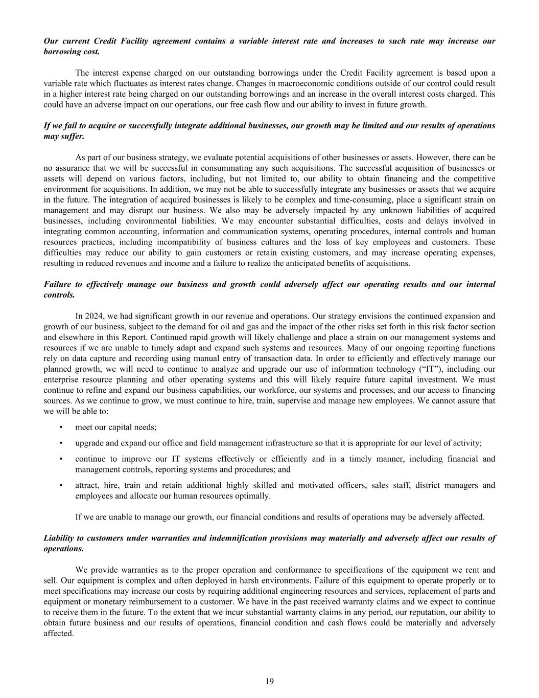 Our current Credit Facility agreement contains a variable interest rate and increases to such rate may increase our borrowing cost. The interest expense charged on our outstanding borrowings under the Credit Facility agreement is based upon a variable rate which fluctuates as interest rates change. Changes in macroeconomic conditions outside of our control could result in a higher interest rate being charged on our outstanding borrowings and an increase in the overall interest costs charged. This could have an adverse impact on our operations, our free cash flow and our ability to invest in future growth. If we fail to acquire or successfully integrate additional businesses, our growth may be limited and our results of operations may suffer. As part of our business strategy, we evaluate potential acquisitions of other businesses or assets. However, there can be no assurance that we will be successful in consummating any such acquisitions. The successful acquisition of businesses or assets will depend on various factors, including, but not limited to, our ability to obtain financing and the competitive environment for acquisitions. In addition, we may not be able to successfully integrate any businesses or assets that we acquire in the future. The integration of acquired businesses is likely to be complex and time-consuming, place a significant strain on management and may disrupt our business. We also may be adversely impacted by any unknown liabilities of acquired businesses, including environmental liabilities. We may encounter substantial difficulties, costs and delays involved in integrating common accounting, information and communication systems, operating procedures, internal controls and human resources practices, including incompatibility of business cultures and the loss of key employees and customers. These difficulties may reduce our ability to gain customers or retain existing customers, and may increase operating expenses, resulting in reduced revenues and income and a failure to realize the anticipated benefits of acquisitions. Failure to effectively manage our business and growth could adversely affect our operating results and our internal controls. In 2024, we had significant growth in our revenue and operations. Our strategy envisions the continued expansion and growth of our business, subject to the demand for oil and gas and the impact of the other risks set forth in this risk factor section and elsewhere in this Report. Continued rapid growth will likely challenge and place a strain on our management systems and resources if we are unable to timely adapt and expand such systems and resources. Many of our ongoing reporting functions rely on data capture and recording using manual entry of transaction data. In order to efficiently and effectively manage our planned growth, we will need to continue to analyze and upgrade our use of information technology (“IT”), including our enterprise resource planning and other operating systems and this will likely require future capital investment. We must continue to refine and expand our business capabilities, our workforce, our systems and processes, and our access to financing sources. As we continue to grow, we must continue to hire, train, supervise and manage new employees. We cannot assure that we will be able to: • meet our capital needs; • upgrade and expand our office and field management infrastructure so that it is appropriate for our level of activity; • continue to improve our IT systems effectively or efficiently and in a timely manner, including financial and management controls, reporting systems and procedures; and • attract, hire, train and retain additional highly skilled and motivated officers, sales staff, district managers and employees and allocate our human resources optimally. If we are unable to manage our growth, our financial conditions and results of operations may be adversely affected. Liability to customers under warranties and indemnification provisions may materially and adversely affect our results of operations. We provide warranties as to the proper operation and conformance to specifications of the equipment we rent and sell. Our equipment is complex and often deployed in harsh environments. Failure of this equipment to operate properly or to meet specifications may increase our costs by requiring additional engineering resources and services, replacement of parts and equipment or monetary reimbursement to a customer. We have in the past received warranty claims and we expect to continue to receive them in the future. To the extent that we incur substantial warranty claims in any period, our reputation, our ability to obtain future business and our results of operations, financial condition and cash flows could be materially and adversely affected. 19