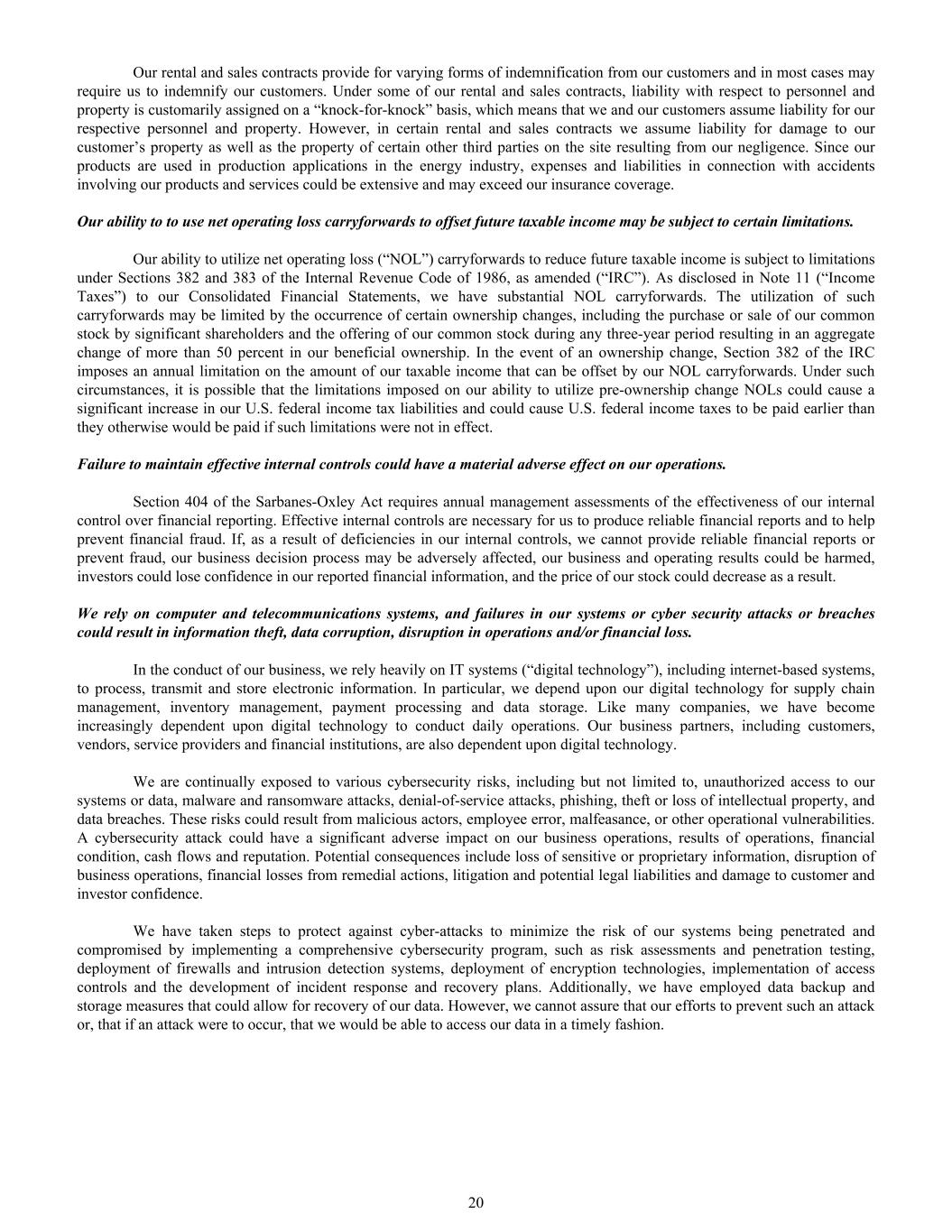 Our rental and sales contracts provide for varying forms of indemnification from our customers and in most cases may require us to indemnify our customers. Under some of our rental and sales contracts, liability with respect to personnel and property is customarily assigned on a “knock-for-knock” basis, which means that we and our customers assume liability for our respective personnel and property. However, in certain rental and sales contracts we assume liability for damage to our customer’s property as well as the property of certain other third parties on the site resulting from our negligence. Since our products are used in production applications in the energy industry, expenses and liabilities in connection with accidents involving our products and services could be extensive and may exceed our insurance coverage. Our ability to to use net operating loss carryforwards to offset future taxable income may be subject to certain limitations. Our ability to utilize net operating loss (“NOL”) carryforwards to reduce future taxable income is subject to limitations under Sections 382 and 383 of the Internal Revenue Code of 1986, as amended (“IRC”). As disclosed in Note 11 (“Income Taxes”) to our Consolidated Financial Statements, we have substantial NOL carryforwards. The utilization of such carryforwards may be limited by the occurrence of certain ownership changes, including the purchase or sale of our common stock by significant shareholders and the offering of our common stock during any three-year period resulting in an aggregate change of more than 50 percent in our beneficial ownership. In the event of an ownership change, Section 382 of the IRC imposes an annual limitation on the amount of our taxable income that can be offset by our NOL carryforwards. Under such circumstances, it is possible that the limitations imposed on our ability to utilize pre-ownership change NOLs could cause a significant increase in our U.S. federal income tax liabilities and could cause U.S. federal income taxes to be paid earlier than they otherwise would be paid if such limitations were not in effect. Failure to maintain effective internal controls could have a material adverse effect on our operations. Section 404 of the Sarbanes-Oxley Act requires annual management assessments of the effectiveness of our internal control over financial reporting. Effective internal controls are necessary for us to produce reliable financial reports and to help prevent financial fraud. If, as a result of deficiencies in our internal controls, we cannot provide reliable financial reports or prevent fraud, our business decision process may be adversely affected, our business and operating results could be harmed, investors could lose confidence in our reported financial information, and the price of our stock could decrease as a result. We rely on computer and telecommunications systems, and failures in our systems or cyber security attacks or breaches could result in information theft, data corruption, disruption in operations and/or financial loss. In the conduct of our business, we rely heavily on IT systems (“digital technology”), including internet-based systems, to process, transmit and store electronic information. In particular, we depend upon our digital technology for supply chain management, inventory management, payment processing and data storage. Like many companies, we have become increasingly dependent upon digital technology to conduct daily operations. Our business partners, including customers, vendors, service providers and financial institutions, are also dependent upon digital technology. We are continually exposed to various cybersecurity risks, including but not limited to, unauthorized access to our systems or data, malware and ransomware attacks, denial-of-service attacks, phishing, theft or loss of intellectual property, and data breaches. These risks could result from malicious actors, employee error, malfeasance, or other operational vulnerabilities. A cybersecurity attack could have a significant adverse impact on our business operations, results of operations, financial condition, cash flows and reputation. Potential consequences include loss of sensitive or proprietary information, disruption of business operations, financial losses from remedial actions, litigation and potential legal liabilities and damage to customer and investor confidence. We have taken steps to protect against cyber-attacks to minimize the risk of our systems being penetrated and compromised by implementing a comprehensive cybersecurity program, such as risk assessments and penetration testing, deployment of firewalls and intrusion detection systems, deployment of encryption technologies, implementation of access controls and the development of incident response and recovery plans. Additionally, we have employed data backup and storage measures that could allow for recovery of our data. However, we cannot assure that our efforts to prevent such an attack or, that if an attack were to occur, that we would be able to access our data in a timely fashion. 20