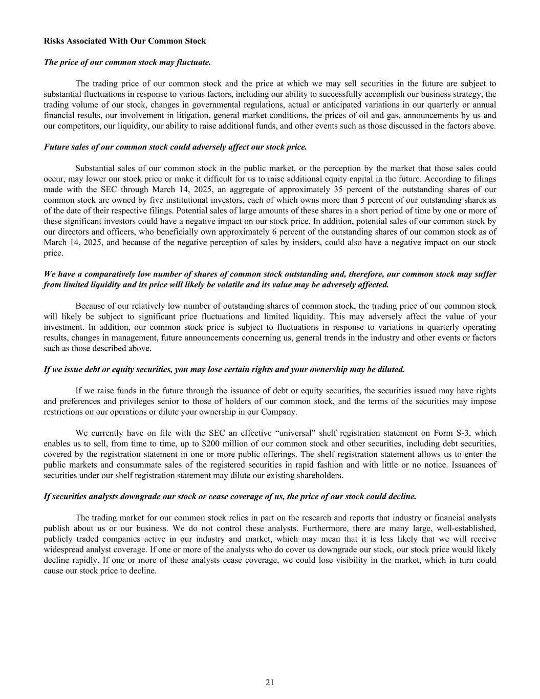 Risks Associated With Our Common Stock The price of our common stock may fluctuate. The trading price of our common stock and the price at which we may sell securities in the future are subject to substantial fluctuations in response to various factors, including our ability to successfully accomplish our business strategy, the trading volume of our stock, changes in governmental regulations, actual or anticipated variations in our quarterly or annual financial results, our involvement in litigation, general market conditions, the prices of oil and gas, announcements by us and our competitors, our liquidity, our ability to raise additional funds, and other events such as those discussed in the factors above. Future sales of our common stock could adversely affect our stock price. Substantial sales of our common stock in the public market, or the perception by the market that those sales could occur, may lower our stock price or make it difficult for us to raise additional equity capital in the future. According to filings made with the SEC through March 14, 2025, an aggregate of approximately 35 percent of the outstanding shares of our common stock are owned by five institutional investors, each of which owns more than 5 percent of our outstanding shares as of the date of their respective filings. Potential sales of large amounts of these shares in a short period of time by one or more of these significant investors could have a negative impact on our stock price. In addition, potential sales of our common stock by our directors and officers, who beneficially own approximately 6 percent of the outstanding shares of our common stock as of March 14, 2025, and because of the negative perception of sales by insiders, could also have a negative impact on our stock price. We have a comparatively low number of shares of common stock outstanding and, therefore, our common stock may suffer from limited liquidity and its price will likely be volatile and its value may be adversely affected. Because of our relatively low number of outstanding shares of common stock, the trading price of our common stock will likely be subject to significant price fluctuations and limited liquidity. This may adversely affect the value of your investment. In addition, our common stock price is subject to fluctuations in response to variations in quarterly operating results, changes in management, future announcements concerning us, general trends in the industry and other events or factors such as those described above. If we issue debt or equity securities, you may lose certain rights and your ownership may be diluted. If we raise funds in the future through the issuance of debt or equity securities, the securities issued may have rights and preferences and privileges senior to those of holders of our common stock, and the terms of the securities may impose restrictions on our operations or dilute your ownership in our Company. We currently have on file with the SEC an effective “universal” shelf registration statement on Form S-3, which enables us to sell, from time to time, up to $200 million of our common stock and other securities, including debt securities, covered by the registration statement in one or more public offerings. The shelf registration statement allows us to enter the public markets and consummate sales of the registered securities in rapid fashion and with little or no notice. Issuances of securities under our shelf registration statement may dilute our existing shareholders. If securities analysts downgrade our stock or cease coverage of us, the price of our stock could decline. The trading market for our common stock relies in part on the research and reports that industry or financial analysts publish about us or our business. We do not control these analysts. Furthermore, there are many large, well-established, publicly traded companies active in our industry and market, which may mean that it is less likely that we will receive widespread analyst coverage. If one or more of the analysts who do cover us downgrade our stock, our stock price would likely decline rapidly. If one or more of these analysts cease coverage, we could lose visibility in the market, which in turn could cause our stock price to decline. 21