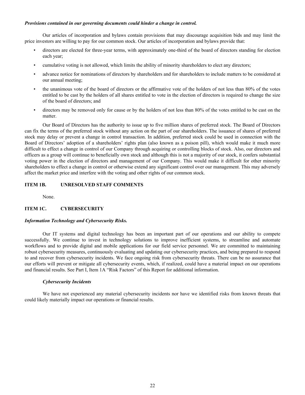 Provisions contained in our governing documents could hinder a change in control. Our articles of incorporation and bylaws contain provisions that may discourage acquisition bids and may limit the price investors are willing to pay for our common stock. Our articles of incorporation and bylaws provide that: • directors are elected for three-year terms, with approximately one-third of the board of directors standing for election each year; • cumulative voting is not allowed, which limits the ability of minority shareholders to elect any directors; • advance notice for nominations of directors by shareholders and for shareholders to include matters to be considered at our annual meeting; • the unanimous vote of the board of directors or the affirmative vote of the holders of not less than 80% of the votes entitled to be cast by the holders of all shares entitled to vote in the election of directors is required to change the size of the board of directors; and • directors may be removed only for cause or by the holders of not less than 80% of the votes entitled to be cast on the matter. Our Board of Directors has the authority to issue up to five million shares of preferred stock. The Board of Directors can fix the terms of the preferred stock without any action on the part of our shareholders. The issuance of shares of preferred stock may delay or prevent a change in control transaction. In addition, preferred stock could be used in connection with the Board of Directors’ adoption of a shareholders’ rights plan (also known as a poison pill), which would make it much more difficult to effect a change in control of our Company through acquiring or controlling blocks of stock. Also, our directors and officers as a group will continue to beneficially own stock and although this is not a majority of our stock, it confers substantial voting power in the election of directors and management of our Company. This would make it difficult for other minority shareholders to effect a change in control or otherwise extend any significant control over our management. This may adversely affect the market price and interfere with the voting and other rights of our common stock. ITEM 1B. UNRESOLVED STAFF COMMENTS None. ITEM 1C. CYBERSECURITY Information Technology and Cybersecurity Risks. Our IT systems and digital technology has been an important part of our operations and our ability to compete successfully. We continue to invest in technology solutions to improve inefficient systems, to streamline and automate workflows and to provide digital and mobile applications for our field service personnel. We are committed to maintaining robust cybersecurity measures, continuously evaluating and updating our cybersecurity practices, and being prepared to respond to and recover from cybersecurity incidents. We face ongoing risk from cybersecurity threats. There can be no assurance that our efforts will prevent or mitigate all cybersecurity events, which, if realized, could have a material impact on our operations and financial results. See Part I, Item 1A “Risk Factors” of this Report for additional information. Cybersecurity Incidents We have not experienced any material cybersecurity incidents nor have we identified risks from known threats that could likely materially impact our operations or financial results. 22
