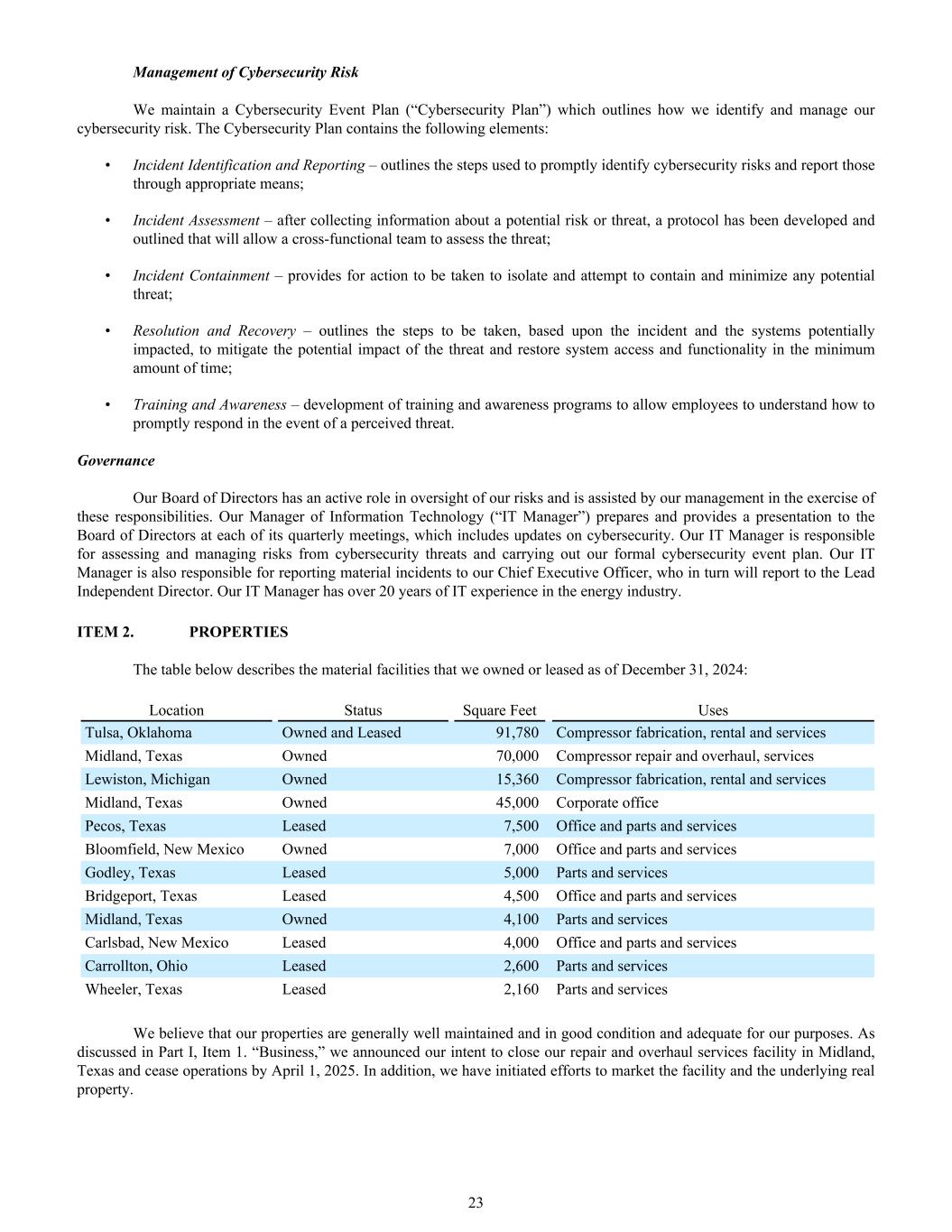 Management of Cybersecurity Risk We maintain a Cybersecurity Event Plan (“Cybersecurity Plan”) which outlines how we identify and manage our cybersecurity risk. The Cybersecurity Plan contains the following elements: • Incident Identification and Reporting – outlines the steps used to promptly identify cybersecurity risks and report those through appropriate means; • Incident Assessment – after collecting information about a potential risk or threat, a protocol has been developed and outlined that will allow a cross-functional team to assess the threat; • Incident Containment – provides for action to be taken to isolate and attempt to contain and minimize any potential threat; • Resolution and Recovery – outlines the steps to be taken, based upon the incident and the systems potentially impacted, to mitigate the potential impact of the threat and restore system access and functionality in the minimum amount of time; • Training and Awareness – development of training and awareness programs to allow employees to understand how to promptly respond in the event of a perceived threat. Governance Our Board of Directors has an active role in oversight of our risks and is assisted by our management in the exercise of these responsibilities. Our Manager of Information Technology (“IT Manager”) prepares and provides a presentation to the Board of Directors at each of its quarterly meetings, which includes updates on cybersecurity. Our IT Manager is responsible for assessing and managing risks from cybersecurity threats and carrying out our formal cybersecurity event plan. Our IT Manager is also responsible for reporting material incidents to our Chief Executive Officer, who in turn will report to the Lead Independent Director. Our IT Manager has over 20 years of IT experience in the energy industry. ITEM 2. PROPERTIES The table below describes the material facilities that we owned or leased as of December 31, 2024: Location Status Square Feet Uses Tulsa, Oklahoma Owned and Leased 91,780 Compressor fabrication, rental and services Midland, Texas Owned 70,000 Compressor repair and overhaul, services Lewiston, Michigan Owned 15,360 Compressor fabrication, rental and services Midland, Texas Owned 45,000 Corporate office Pecos, Texas Leased 7,500 Office and parts and services Bloomfield, New Mexico Owned 7,000 Office and parts and services Godley, Texas Leased 5,000 Parts and services Bridgeport, Texas Leased 4,500 Office and parts and services Midland, Texas Owned 4,100 Parts and services Carlsbad, New Mexico Leased 4,000 Office and parts and services Carrollton, Ohio Leased 2,600 Parts and services Wheeler, Texas Leased 2,160 Parts and services We believe that our properties are generally well maintained and in good condition and adequate for our purposes. As discussed in Part I, Item 1. “Business,” we announced our intent to close our repair and overhaul services facility in Midland, Texas and cease operations by April 1, 2025. In addition, we have initiated efforts to market the facility and the underlying real property. 23