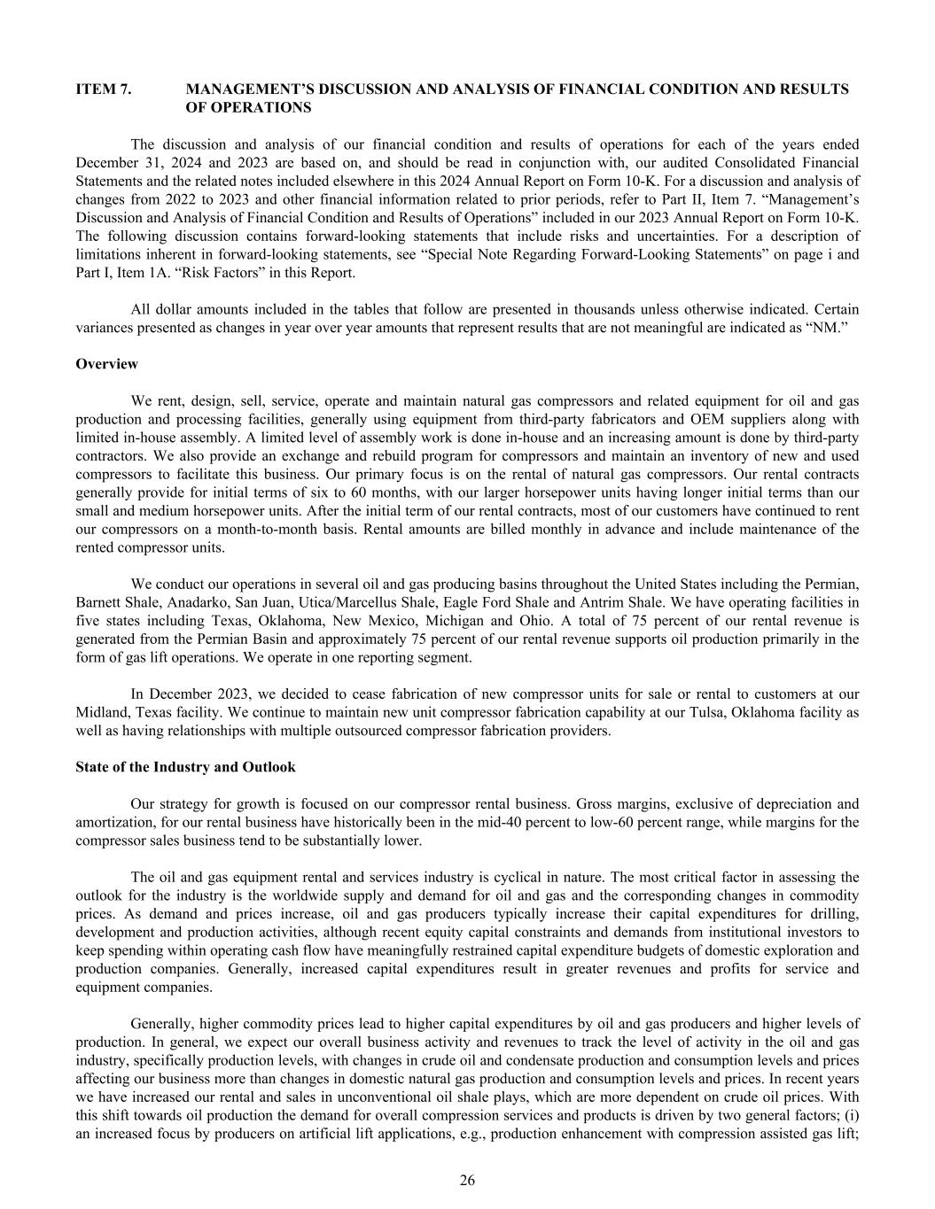 ITEM 7. MANAGEMENT’S DISCUSSION AND ANALYSIS OF FINANCIAL CONDITION AND RESULTS OF OPERATIONS The discussion and analysis of our financial condition and results of operations for each of the years ended December 31, 2024 and 2023 are based on, and should be read in conjunction with, our audited Consolidated Financial Statements and the related notes included elsewhere in this 2024 Annual Report on Form 10-K. For a discussion and analysis of changes from 2022 to 2023 and other financial information related to prior periods, refer to Part II, Item 7. “Management’s Discussion and Analysis of Financial Condition and Results of Operations” included in our 2023 Annual Report on Form 10-K. The following discussion contains forward-looking statements that include risks and uncertainties. For a description of limitations inherent in forward-looking statements, see “Special Note Regarding Forward-Looking Statements” on page i and Part I, Item 1A. “Risk Factors” in this Report. All dollar amounts included in the tables that follow are presented in thousands unless otherwise indicated. Certain variances presented as changes in year over year amounts that represent results that are not meaningful are indicated as “NM.” Overview We rent, design, sell, service, operate and maintain natural gas compressors and related equipment for oil and gas production and processing facilities, generally using equipment from third-party fabricators and OEM suppliers along with limited in-house assembly. A limited level of assembly work is done in-house and an increasing amount is done by third-party contractors. We also provide an exchange and rebuild program for compressors and maintain an inventory of new and used compressors to facilitate this business. Our primary focus is on the rental of natural gas compressors. Our rental contracts generally provide for initial terms of six to 60 months, with our larger horsepower units having longer initial terms than our small and medium horsepower units. After the initial term of our rental contracts, most of our customers have continued to rent our compressors on a month-to-month basis. Rental amounts are billed monthly in advance and include maintenance of the rented compressor units. We conduct our operations in several oil and gas producing basins throughout the United States including the Permian, Barnett Shale, Anadarko, San Juan, Utica/Marcellus Shale, Eagle Ford Shale and Antrim Shale. We have operating facilities in five states including Texas, Oklahoma, New Mexico, Michigan and Ohio. A total of 75 percent of our rental revenue is generated from the Permian Basin and approximately 75 percent of our rental revenue supports oil production primarily in the form of gas lift operations. We operate in one reporting segment. In December 2023, we decided to cease fabrication of new compressor units for sale or rental to customers at our Midland, Texas facility. We continue to maintain new unit compressor fabrication capability at our Tulsa, Oklahoma facility as well as having relationships with multiple outsourced compressor fabrication providers. State of the Industry and Outlook Our strategy for growth is focused on our compressor rental business. Gross margins, exclusive of depreciation and amortization, for our rental business have historically been in the mid-40 percent to low-60 percent range, while margins for the compressor sales business tend to be substantially lower. The oil and gas equipment rental and services industry is cyclical in nature. The most critical factor in assessing the outlook for the industry is the worldwide supply and demand for oil and gas and the corresponding changes in commodity prices. As demand and prices increase, oil and gas producers typically increase their capital expenditures for drilling, development and production activities, although recent equity capital constraints and demands from institutional investors to keep spending within operating cash flow have meaningfully restrained capital expenditure budgets of domestic exploration and production companies. Generally, increased capital expenditures result in greater revenues and profits for service and equipment companies. Generally, higher commodity prices lead to higher capital expenditures by oil and gas producers and higher levels of production. In general, we expect our overall business activity and revenues to track the level of activity in the oil and gas industry, specifically production levels, with changes in crude oil and condensate production and consumption levels and prices affecting our business more than changes in domestic natural gas production and consumption levels and prices. In recent years we have increased our rental and sales in unconventional oil shale plays, which are more dependent on crude oil prices. With this shift towards oil production the demand for overall compression services and products is driven by two general factors; (i) an increased focus by producers on artificial lift applications, e.g., production enhancement with compression assisted gas lift; 26