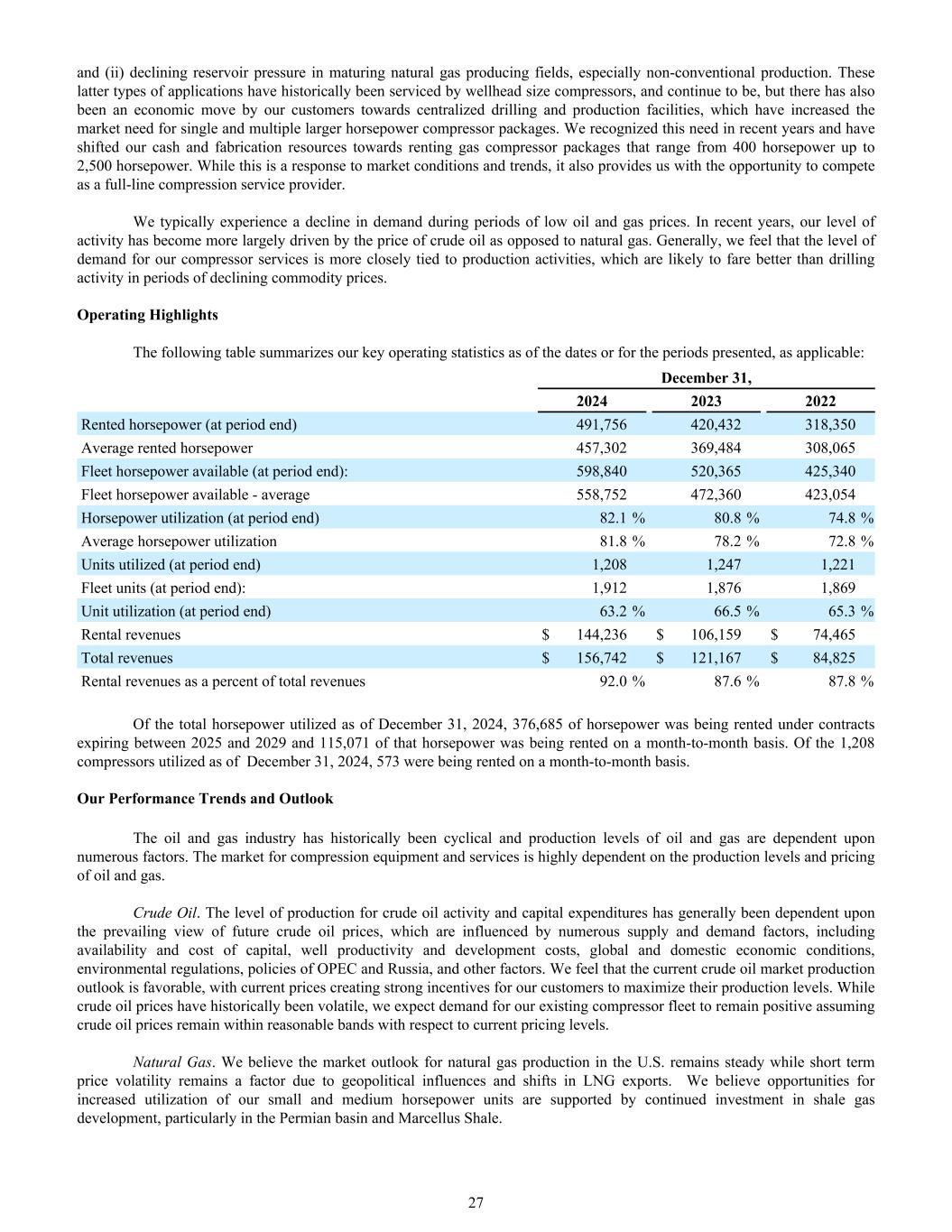 and (ii) declining reservoir pressure in maturing natural gas producing fields, especially non-conventional production. These latter types of applications have historically been serviced by wellhead size compressors, and continue to be, but there has also been an economic move by our customers towards centralized drilling and production facilities, which have increased the market need for single and multiple larger horsepower compressor packages. We recognized this need in recent years and have shifted our cash and fabrication resources towards renting gas compressor packages that range from 400 horsepower up to 2,500 horsepower. While this is a response to market conditions and trends, it also provides us with the opportunity to compete as a full-line compression service provider. We typically experience a decline in demand during periods of low oil and gas prices. In recent years, our level of activity has become more largely driven by the price of crude oil as opposed to natural gas. Generally, we feel that the level of demand for our compressor services is more closely tied to production activities, which are likely to fare better than drilling activity in periods of declining commodity prices. Operating Highlights The following table summarizes our key operating statistics as of the dates or for the periods presented, as applicable: December 31, 2024 2023 2022 Rented horsepower (at period end) 491,756 420,432 318,350 Average rented horsepower 457,302 369,484 308,065 Fleet horsepower available (at period end): 598,840 520,365 425,340 Fleet horsepower available - average 558,752 472,360 423,054 Horsepower utilization (at period end) 82.1 % 80.8 % 74.8 % Average horsepower utilization 81.8 % 78.2 % 72.8 % Units utilized (at period end) 1,208 1,247 1,221 Fleet units (at period end): 1,912 1,876 1,869 Unit utilization (at period end) 63.2 % 66.5 % 65.3 % Rental revenues $ 144,236 $ 106,159 $ 74,465 Total revenues $ 156,742 $ 121,167 $ 84,825 Rental revenues as a percent of total revenues 92.0 % 87.6 % 87.8 % Of the total horsepower utilized as of December 31, 2024, 376,685 of horsepower was being rented under contracts expiring between 2025 and 2029 and 115,071 of that horsepower was being rented on a month-to-month basis. Of the 1,208 compressors utilized as of December 31, 2024, 573 were being rented on a month-to-month basis. Our Performance Trends and Outlook The oil and gas industry has historically been cyclical and production levels of oil and gas are dependent upon numerous factors. The market for compression equipment and services is highly dependent on the production levels and pricing of oil and gas. Crude Oil. The level of production for crude oil activity and capital expenditures has generally been dependent upon the prevailing view of future crude oil prices, which are influenced by numerous supply and demand factors, including availability and cost of capital, well productivity and development costs, global and domestic economic conditions, environmental regulations, policies of OPEC and Russia, and other factors. We feel that the current crude oil market production outlook is favorable, with current prices creating strong incentives for our customers to maximize their production levels. While crude oil prices have historically been volatile, we expect demand for our existing compressor fleet to remain positive assuming crude oil prices remain within reasonable bands with respect to current pricing levels. Natural Gas. We believe the market outlook for natural gas production in the U.S. remains steady while short term price volatility remains a factor due to geopolitical influences and shifts in LNG exports. We believe opportunities for increased utilization of our small and medium horsepower units are supported by continued investment in shale gas development, particularly in the Permian basin and Marcellus Shale. 27