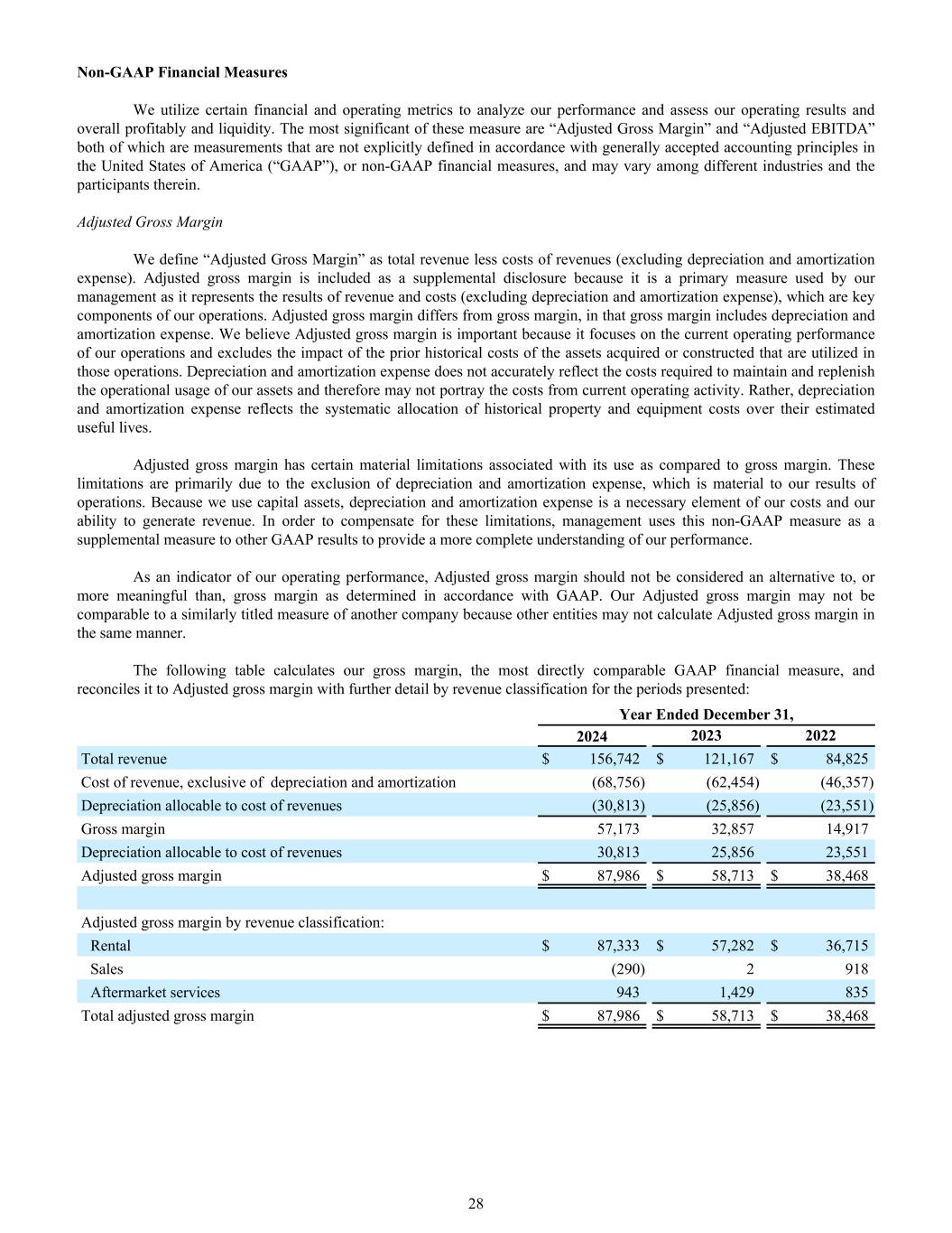Non-GAAP Financial Measures We utilize certain financial and operating metrics to analyze our performance and assess our operating results and overall profitably and liquidity. The most significant of these measure are “Adjusted Gross Margin” and “Adjusted EBITDA” both of which are measurements that are not explicitly defined in accordance with generally accepted accounting principles in the United States of America (“GAAP”), or non-GAAP financial measures, and may vary among different industries and the participants therein. Adjusted Gross Margin We define “Adjusted Gross Margin” as total revenue less costs of revenues (excluding depreciation and amortization expense). Adjusted gross margin is included as a supplemental disclosure because it is a primary measure used by our management as it represents the results of revenue and costs (excluding depreciation and amortization expense), which are key components of our operations. Adjusted gross margin differs from gross margin, in that gross margin includes depreciation and amortization expense. We believe Adjusted gross margin is important because it focuses on the current operating performance of our operations and excludes the impact of the prior historical costs of the assets acquired or constructed that are utilized in those operations. Depreciation and amortization expense does not accurately reflect the costs required to maintain and replenish the operational usage of our assets and therefore may not portray the costs from current operating activity. Rather, depreciation and amortization expense reflects the systematic allocation of historical property and equipment costs over their estimated useful lives. Adjusted gross margin has certain material limitations associated with its use as compared to gross margin. These limitations are primarily due to the exclusion of depreciation and amortization expense, which is material to our results of operations. Because we use capital assets, depreciation and amortization expense is a necessary element of our costs and our ability to generate revenue. In order to compensate for these limitations, management uses this non-GAAP measure as a supplemental measure to other GAAP results to provide a more complete understanding of our performance. As an indicator of our operating performance, Adjusted gross margin should not be considered an alternative to, or more meaningful than, gross margin as determined in accordance with GAAP. Our Adjusted gross margin may not be comparable to a similarly titled measure of another company because other entities may not calculate Adjusted gross margin in the same manner. The following table calculates our gross margin, the most directly comparable GAAP financial measure, and reconciles it to Adjusted gross margin with further detail by revenue classification for the periods presented: Year Ended December 31, 2024 2023 2022 Total revenue $ 156,742 $ 121,167 $ 84,825 Cost of revenue, exclusive of depreciation and amortization (68,756) (62,454) (46,357) Depreciation allocable to cost of revenues (30,813) (25,856) (23,551) Gross margin 57,173 32,857 14,917 Depreciation allocable to cost of revenues 30,813 25,856 23,551 Adjusted gross margin $ 87,986 $ 58,713 $ 38,468 Adjusted gross margin by revenue classification: Rental $ 87,333 $ 57,282 $ 36,715 Sales (290) 2 918 Aftermarket services 943 1,429 835 Total adjusted gross margin $ 87,986 $ 58,713 $ 38,468 28