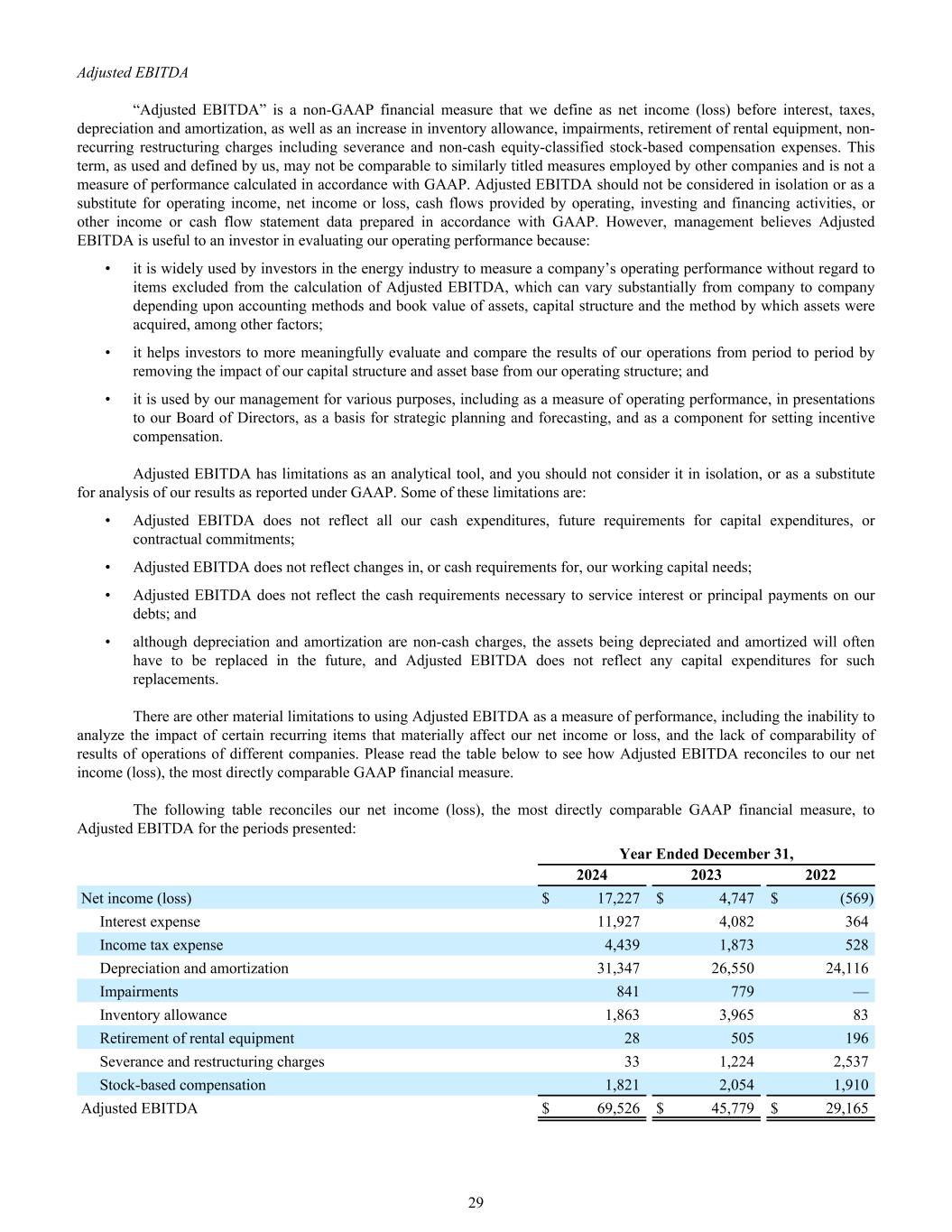 Adjusted EBITDA “Adjusted EBITDA” is a non-GAAP financial measure that we define as net income (loss) before interest, taxes, depreciation and amortization, as well as an increase in inventory allowance, impairments, retirement of rental equipment, non- recurring restructuring charges including severance and non-cash equity-classified stock-based compensation expenses. This term, as used and defined by us, may not be comparable to similarly titled measures employed by other companies and is not a measure of performance calculated in accordance with GAAP. Adjusted EBITDA should not be considered in isolation or as a substitute for operating income, net income or loss, cash flows provided by operating, investing and financing activities, or other income or cash flow statement data prepared in accordance with GAAP. However, management believes Adjusted EBITDA is useful to an investor in evaluating our operating performance because: • it is widely used by investors in the energy industry to measure a company’s operating performance without regard to items excluded from the calculation of Adjusted EBITDA, which can vary substantially from company to company depending upon accounting methods and book value of assets, capital structure and the method by which assets were acquired, among other factors; • it helps investors to more meaningfully evaluate and compare the results of our operations from period to period by removing the impact of our capital structure and asset base from our operating structure; and • it is used by our management for various purposes, including as a measure of operating performance, in presentations to our Board of Directors, as a basis for strategic planning and forecasting, and as a component for setting incentive compensation. Adjusted EBITDA has limitations as an analytical tool, and you should not consider it in isolation, or as a substitute for analysis of our results as reported under GAAP. Some of these limitations are: • Adjusted EBITDA does not reflect all our cash expenditures, future requirements for capital expenditures, or contractual commitments; • Adjusted EBITDA does not reflect changes in, or cash requirements for, our working capital needs; • Adjusted EBITDA does not reflect the cash requirements necessary to service interest or principal payments on our debts; and • although depreciation and amortization are non-cash charges, the assets being depreciated and amortized will often have to be replaced in the future, and Adjusted EBITDA does not reflect any capital expenditures for such replacements. There are other material limitations to using Adjusted EBITDA as a measure of performance, including the inability to analyze the impact of certain recurring items that materially affect our net income or loss, and the lack of comparability of results of operations of different companies. Please read the table below to see how Adjusted EBITDA reconciles to our net income (loss), the most directly comparable GAAP financial measure. The following table reconciles our net income (loss), the most directly comparable GAAP financial measure, to Adjusted EBITDA for the periods presented: Year Ended December 31, 2024 2023 2022 Net income (loss) $ 17,227 $ 4,747 $ (569) Interest expense 11,927 4,082 364 Income tax expense 4,439 1,873 528 Depreciation and amortization 31,347 26,550 24,116 Impairments 841 779 — Inventory allowance 1,863 3,965 83 Retirement of rental equipment 28 505 196 Severance and restructuring charges 33 1,224 2,537 Stock-based compensation 1,821 2,054 1,910 Adjusted EBITDA $ 69,526 $ 45,779 $ 29,165 29