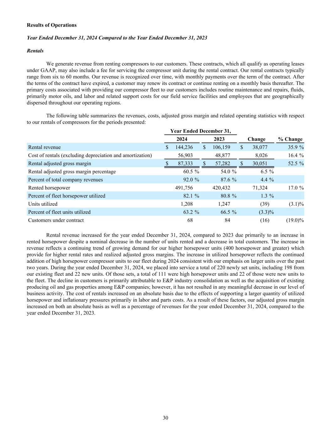 Results of Operations Year Ended December 31, 2024 Compared to the Year Ended December 31, 2023 Rentals We generate revenue from renting compressors to our customers. These contracts, which all qualify as operating leases under GAAP, may also include a fee for servicing the compressor unit during the rental contract. Our rental contracts typically range from six to 60 months. Our revenue is recognized over time, with monthly payments over the term of the contract. After the terms of the contract have expired, a customer may renew its contract or continue renting on a monthly basis thereafter. The primary costs associated with providing our compressor fleet to our customers includes routine maintenance and repairs, fluids, primarily motor oils, and labor and related support costs for our field service facilities and employees that are geographically dispersed throughout our operating regions. The following table summarizes the revenues, costs, adjusted gross margin and related operating statistics with respect to our rentals of compressors for the periods presented: Year Ended December 31, 2024 2023 Change % Change Rental revenue $ 144,236 $ 106,159 $ 38,077 35.9 % Cost of rentals (excluding depreciation and amortization) 56,903 48,877 8,026 16.4 % Rental adjusted gross margin $ 87,333 $ 57,282 $ 30,051 52.5 % Rental adjusted gross margin percentage 60.5 % 54.0 % 6.5 % Percent of total company revenues 92.0 % 87.6 % 4.4 % Rented horsepower 491,756 420,432 71,324 17.0 % Percent of fleet horsepower utilized 82.1 % 80.8 % 1.3 % Units utilized 1,208 1,247 (39) (3.1) % Percent of fleet units utilized 63.2 % 66.5 % (3.3) % Customers under contract 68 84 (16) (19.0) % Rental revenue increased for the year ended December 31, 2024, compared to 2023 due primarily to an increase in rented horsepower despite a nominal decrease in the number of units rented and a decrease in total customers. The increase in revenue reflects a continuing trend of growing demand for our higher horsepower units (400 horsepower and greater) which provide for higher rental rates and realized adjusted gross margins. The increase in utilized horsepower reflects the continued addition of high horsepower compressor units to our fleet during 2024 consistent with our emphasis on larger units over the past two years. During the year ended December 31, 2024, we placed into service a total of 220 newly set units, including 198 from our existing fleet and 22 new units. Of those sets, a total of 111 were high horsepower units and 22 of those were new units to the fleet. The decline in customers is primarily attributable to E&P industry consolidation as well as the acquisition of existing producing oil and gas properties among E&P companies; however, it has not resulted in any meaningful decrease in our level of business activity. The cost of rentals increased on an absolute basis due to the effects of supporting a larger quantity of utilized horsepower and inflationary pressures primarily in labor and parts costs. As a result of these factors, our adjusted gross margin increased on both an absolute basis as well as a percentage of revenues for the year ended December 31, 2024, compared to the year ended December 31, 2023. 30