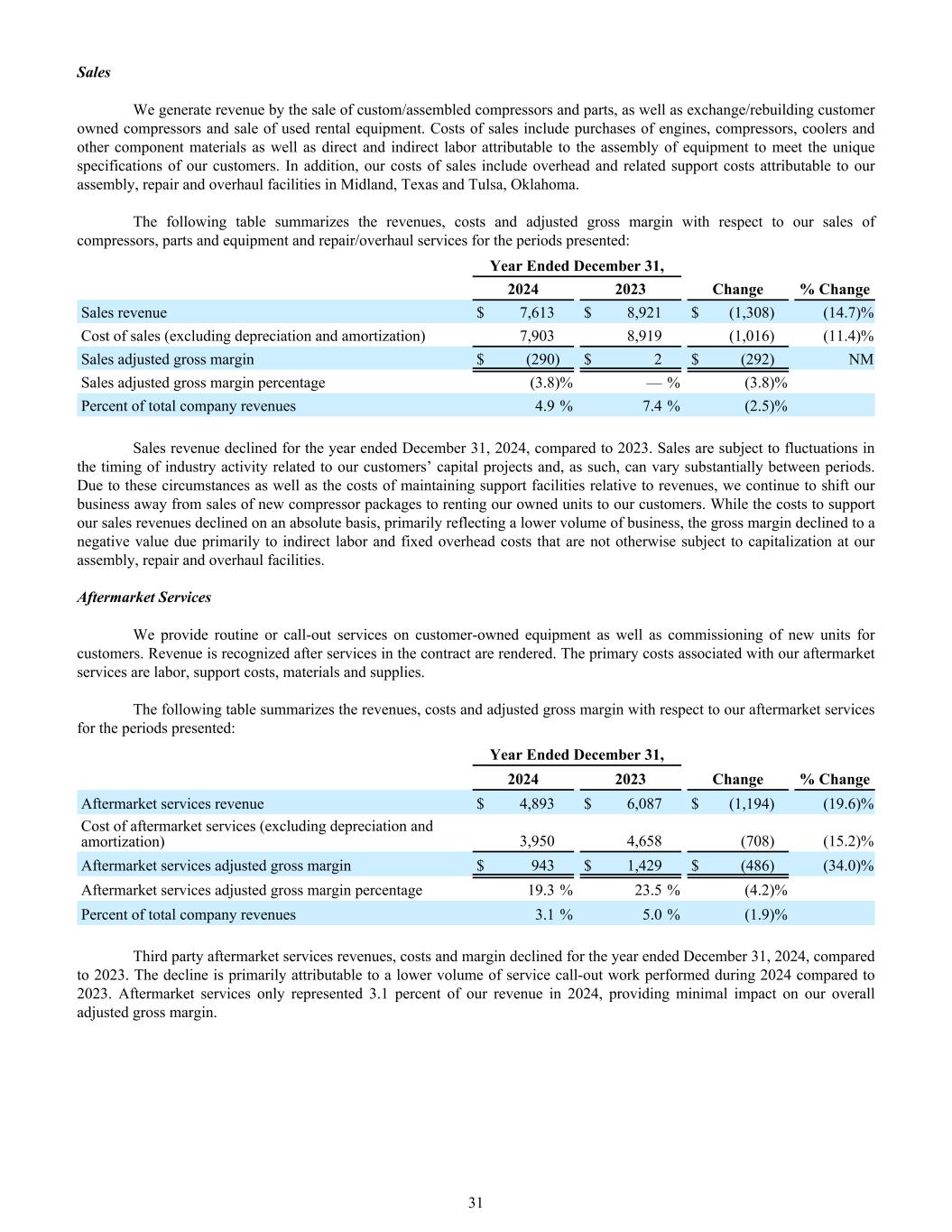 Sales We generate revenue by the sale of custom/assembled compressors and parts, as well as exchange/rebuilding customer owned compressors and sale of used rental equipment. Costs of sales include purchases of engines, compressors, coolers and other component materials as well as direct and indirect labor attributable to the assembly of equipment to meet the unique specifications of our customers. In addition, our costs of sales include overhead and related support costs attributable to our assembly, repair and overhaul facilities in Midland, Texas and Tulsa, Oklahoma. The following table summarizes the revenues, costs and adjusted gross margin with respect to our sales of compressors, parts and equipment and repair/overhaul services for the periods presented: Year Ended December 31, 2024 2023 Change % Change Sales revenue $ 7,613 $ 8,921 $ (1,308) (14.7) % Cost of sales (excluding depreciation and amortization) 7,903 8,919 (1,016) (11.4) % Sales adjusted gross margin $ (290) $ 2 $ (292) NM Sales adjusted gross margin percentage (3.8) % — % (3.8) % Percent of total company revenues 4.9 % 7.4 % (2.5) % Sales revenue declined for the year ended December 31, 2024, compared to 2023. Sales are subject to fluctuations in the timing of industry activity related to our customers’ capital projects and, as such, can vary substantially between periods. Due to these circumstances as well as the costs of maintaining support facilities relative to revenues, we continue to shift our business away from sales of new compressor packages to renting our owned units to our customers. While the costs to support our sales revenues declined on an absolute basis, primarily reflecting a lower volume of business, the gross margin declined to a negative value due primarily to indirect labor and fixed overhead costs that are not otherwise subject to capitalization at our assembly, repair and overhaul facilities. Aftermarket Services We provide routine or call-out services on customer-owned equipment as well as commissioning of new units for customers. Revenue is recognized after services in the contract are rendered. The primary costs associated with our aftermarket services are labor, support costs, materials and supplies. The following table summarizes the revenues, costs and adjusted gross margin with respect to our aftermarket services for the periods presented: Year Ended December 31, 2024 2023 Change % Change Aftermarket services revenue $ 4,893 $ 6,087 $ (1,194) (19.6) % Cost of aftermarket services (excluding depreciation and amortization) 3,950 4,658 (708) (15.2) % Aftermarket services adjusted gross margin $ 943 $ 1,429 $ (486) (34.0) % Aftermarket services adjusted gross margin percentage 19.3 % 23.5 % (4.2) % Percent of total company revenues 3.1 % 5.0 % (1.9) % Third party aftermarket services revenues, costs and margin declined for the year ended December 31, 2024, compared to 2023. The decline is primarily attributable to a lower volume of service call-out work performed during 2024 compared to 2023. Aftermarket services only represented 3.1 percent of our revenue in 2024, providing minimal impact on our overall adjusted gross margin. 31