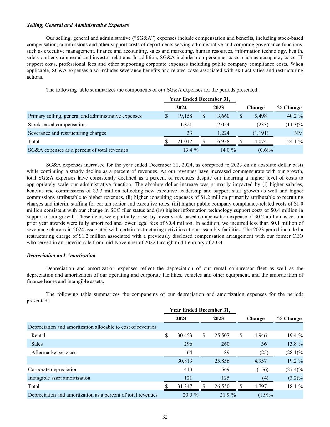 Selling, General and Administrative Expenses Our selling, general and administrative (“SG&A”) expenses include compensation and benefits, including stock-based compensation, commissions and other support costs of departments serving administrative and corporate governance functions, such as executive management, finance and accounting, sales and marketing, human resources, information technology, health, safety and environmental and investor relations. In addition, SG&A includes non-personnel costs, such as occupancy costs, IT support costs, professional fees and other supporting corporate expenses including public company compliance costs. When applicable, SG&A expenses also includes severance benefits and related costs associated with exit activities and restructuring actions. The following table summarizes the components of our SG&A expenses for the periods presented: Year Ended December 31, 2024 2023 Change % Change Primary selling, general and administrative expenses $ 19,158 $ 13,660 $ 5,498 40.2 % Stock-based compensation 1,821 2,054 (233) (11.3) % Severance and restructuring charges 33 1,224 (1,191) NM Total $ 21,012 $ 16,938 $ 4,074 24.1 % SG&A expenses as a percent of total revenues 13.4 % 14.0 % (0.6) % SG&A expenses increased for the year ended December 31, 2024, as compared to 2023 on an absolute dollar basis while continuing a steady decline as a percent of revenues. As our revenues have increased commensurate with our growth, total SG&A expenses have consistently declined as a percent of revenues despite our incurring a higher level of costs to appropriately scale our administrative function. The absolute dollar increase was primarily impacted by (i) higher salaries, benefits and commissions of $3.3 million reflecting new executive leadership and support staff growth as well and higher commissions attributable to higher revenues, (ii) higher consulting expenses of $1.2 million primarily attributable to recruiting charges and interim staffing for certain senior and executive roles, (iii) higher public company compliance-related costs of $1.0 million consistent with our change in SEC filer status and (iv) higher information technology support costs of $0.4 million in support of our growth. These items were partially offset by lower stock-based compensation expense of $0.2 million as certain prior year awards were fully amortized and lower legal fees of $0.4 million. In addition, we incurred less than $0.1 million of severance charges in 2024 associated with certain restructuring activities at our assembly facilities. The 2023 period included a restructuring charge of $1.2 million associated with a previously disclosed compensation arrangement with our former CEO who served in an interim role from mid-November of 2022 through mid-February of 2024. Depreciation and Amortization Depreciation and amortization expenses reflect the depreciation of our rental compressor fleet as well as the depreciation and amortization of our operating and corporate facilities, vehicles and other equipment, and the amortization of finance leases and intangible assets. The following table summarizes the components of our depreciation and amortization expenses for the periods presented: Year Ended December 31, 2024 2023 Change % Change Depreciation and amortization allocable to cost of revenues: Rental $ 30,453 $ 25,507 $ 4,946 19.4 % Sales 296 260 36 13.8 % Aftermarket services 64 89 (25) (28.1) % 30,813 25,856 4,957 19.2 % Corporate depreciation 413 569 (156) (27.4) % Intangible asset amortization 121 125 (4) (3.2) % Total $ 31,347 $ 26,550 $ 4,797 18.1 % Depreciation and amortization as a percent of total revenues 20.0 % 21.9 % (1.9) % 32
