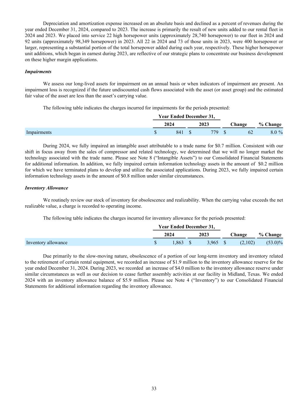 Depreciation and amortization expense increased on an absolute basis and declined as a percent of revenues during the year ended December 31, 2024, compared to 2023. The increase is primarily the result of new units added to our rental fleet in 2024 and 2023. We placed into service 22 high horsepower units (approximately 28,740 horsepower) to our fleet in 2024 and 92 units (approximately 98,349 horsepower) in 2023. All 22 in 2024 and 73 of those units in 2023, were 400 horsepower or larger, representing a substantial portion of the total horsepower added during each year, respectively. These higher horsepower unit additions, which began in earnest during 2023, are reflective of our strategic plans to concentrate our business development on these higher margin applications. Impairments We assess our long-lived assets for impairment on an annual basis or when indicators of impairment are present. An impairment loss is recognized if the future undiscounted cash flows associated with the asset (or asset group) and the estimated fair value of the asset are less than the asset’s carrying value. The following table indicates the charges incurred for impairments for the periods presented: Year Ended December 31, 2024 2023 Change % Change Impairments $ 841 $ 779 $ 62 8.0 % During 2024, we fully impaired an intangible asset attributable to a trade name for $0.7 million. Consistent with our shift in focus away from the sales of compressor and related technology, we determined that we will no longer market the technology associated with the trade name. Please see Note 8 (“Intangible Assets”) to our Consolidated Financial Statements for additional information. In addition, we fully impaired certain information technology assets in the amount of $0.2 million for which we have terminated plans to develop and utilize the associated applications. During 2023, we fully impaired certain information technology assets in the amount of $0.8 million under similar circumstances. Inventory Allowance We routinely review our stock of inventory for obsolescence and realizability. When the carrying value exceeds the net realizable value, a charge is recorded to operating income. The following table indicates the charges incurred for inventory allowance for the periods presented: Year Ended December 31, 2024 2023 Change % Change Inventory allowance $ 1,863 $ 3,965 $ (2,102) (53.0) % Due primarily to the slow-moving nature, obsolescence of a portion of our long-term inventory and inventory related to the retirement of certain rental equipment, we recorded an increase of $1.9 million to the inventory allowance reserve for the year ended December 31, 2024. During 2023, we recorded an increase of $4.0 million to the inventory allowance reserve under similar circumstances as well as our decision to cease further assembly activities at our facility in Midland, Texas. We ended 2024 with an inventory allowance balance of $5.9 million. Please see Note 4 (“Inventory”) to our Consolidated Financial Statements for additional information regarding the inventory allowance. 33