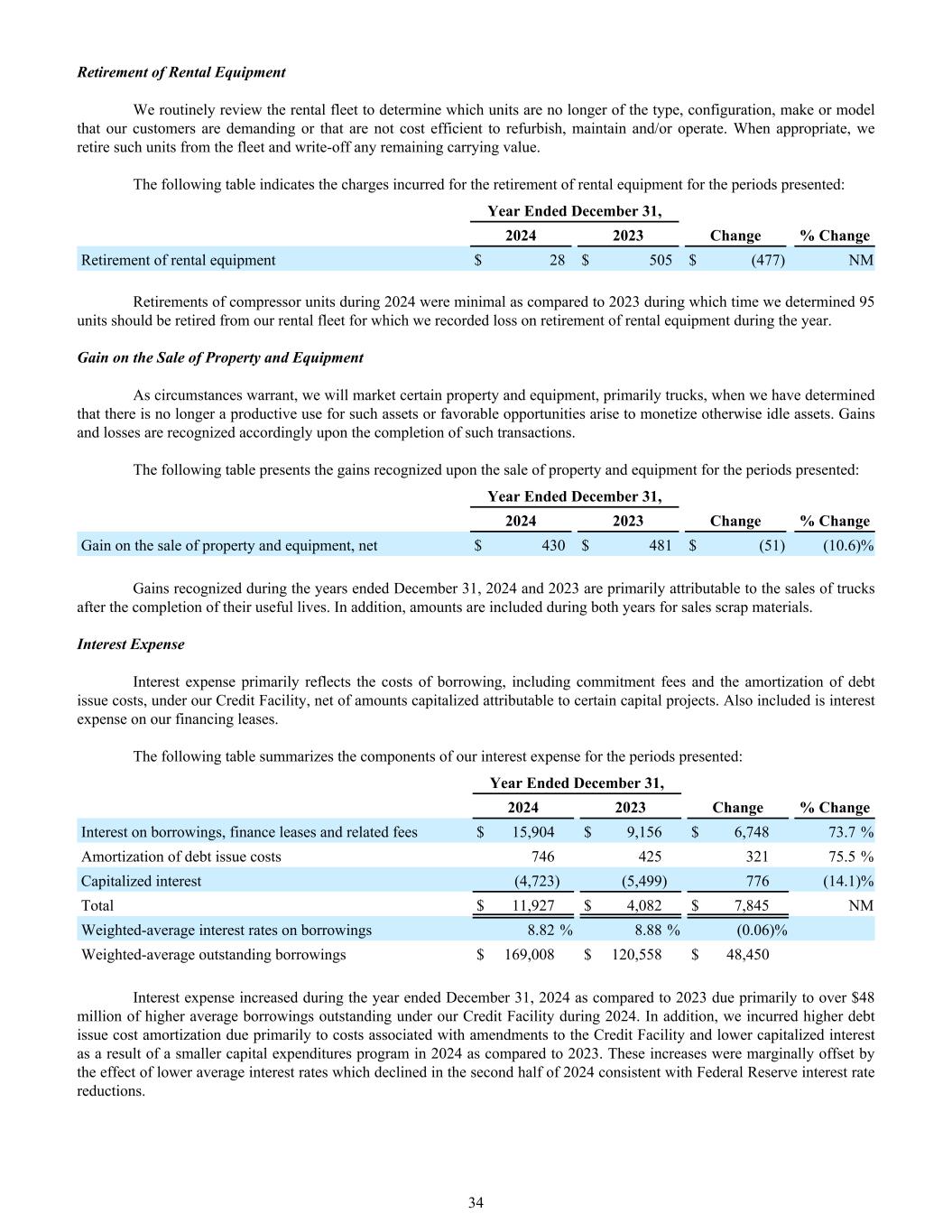 Retirement of Rental Equipment We routinely review the rental fleet to determine which units are no longer of the type, configuration, make or model that our customers are demanding or that are not cost efficient to refurbish, maintain and/or operate. When appropriate, we retire such units from the fleet and write-off any remaining carrying value. The following table indicates the charges incurred for the retirement of rental equipment for the periods presented: Year Ended December 31, 2024 2023 Change % Change Retirement of rental equipment $ 28 $ 505 $ (477) NM Retirements of compressor units during 2024 were minimal as compared to 2023 during which time we determined 95 units should be retired from our rental fleet for which we recorded loss on retirement of rental equipment during the year. Gain on the Sale of Property and Equipment As circumstances warrant, we will market certain property and equipment, primarily trucks, when we have determined that there is no longer a productive use for such assets or favorable opportunities arise to monetize otherwise idle assets. Gains and losses are recognized accordingly upon the completion of such transactions. The following table presents the gains recognized upon the sale of property and equipment for the periods presented: Year Ended December 31, 2024 2023 Change % Change Gain on the sale of property and equipment, net $ 430 $ 481 $ (51) (10.6) % Gains recognized during the years ended December 31, 2024 and 2023 are primarily attributable to the sales of trucks after the completion of their useful lives. In addition, amounts are included during both years for sales scrap materials. Interest Expense Interest expense primarily reflects the costs of borrowing, including commitment fees and the amortization of debt issue costs, under our Credit Facility, net of amounts capitalized attributable to certain capital projects. Also included is interest expense on our financing leases. The following table summarizes the components of our interest expense for the periods presented: Year Ended December 31, 2024 2023 Change % Change Interest on borrowings, finance leases and related fees $ 15,904 $ 9,156 $ 6,748 73.7 % Amortization of debt issue costs 746 425 321 75.5 % Capitalized interest (4,723) (5,499) 776 (14.1) % Total $ 11,927 $ 4,082 $ 7,845 NM Weighted-average interest rates on borrowings 8.82 % 8.88 % (0.06) % Weighted-average outstanding borrowings $ 169,008 $ 120,558 $ 48,450 Interest expense increased during the year ended December 31, 2024 as compared to 2023 due primarily to over $48 million of higher average borrowings outstanding under our Credit Facility during 2024. In addition, we incurred higher debt issue cost amortization due primarily to costs associated with amendments to the Credit Facility and lower capitalized interest as a result of a smaller capital expenditures program in 2024 as compared to 2023. These increases were marginally offset by the effect of lower average interest rates which declined in the second half of 2024 consistent with Federal Reserve interest rate reductions. 34