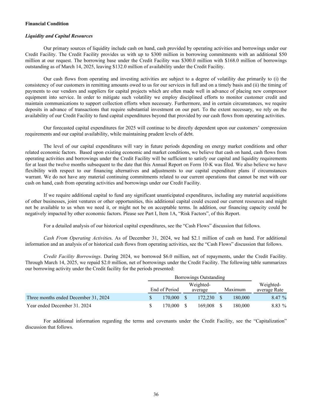 Financial Condition Liquidity and Capital Resources Our primary sources of liquidity include cash on hand, cash provided by operating activities and borrowings under our Credit Facility. The Credit Facility provides us with up to $300 million in borrowing commitments with an additional $50 million at our request. The borrowing base under the Credit Facility was $300.0 million with $168.0 million of borrowings outstanding as of March 14, 2025, leaving $132.0 million of availability under the Credit Facility. Our cash flows from operating and investing activities are subject to a degree of volatility due primarily to (i) the consistency of our customers in remitting amounts owed to us for our services in full and on a timely basis and (ii) the timing of payments to our vendors and suppliers for capital projects which are often made well in advance of placing new compressor equipment into service. In order to mitigate such volatility we employ disciplined efforts to monitor customer credit and maintain communications to support collection efforts when necessary. Furthermore, and in certain circumstances, we require deposits in advance of transactions that require substantial investment on our part. To the extent necessary, we rely on the availability of our Credit Facility to fund capital expenditures beyond that provided by our cash flows from operating activities. Our forecasted capital expenditures for 2025 will continue to be directly dependent upon our customers’ compression requirements and our capital availability, while maintaining prudent levels of debt. The level of our capital expenditures will vary in future periods depending on energy market conditions and other related economic factors. Based upon existing economic and market conditions, we believe that cash on hand, cash flows from operating activities and borrowings under the Credit Facility will be sufficient to satisfy our capital and liquidity requirements for at least the twelve months subsequent to the date that this Annual Report on Form 10-K was filed. We also believe we have flexibility with respect to our financing alternatives and adjustments to our capital expenditure plans if circumstances warrant. We do not have any material continuing commitments related to our current operations that cannot be met with our cash on hand, cash from operating activities and borrowings under our Credit Facility. If we require additional capital to fund any significant unanticipated expenditures, including any material acquisitions of other businesses, joint ventures or other opportunities, this additional capital could exceed our current resources and might not be available to us when we need it, or might not be on acceptable terms. In addition, our financing capacity could be negatively impacted by other economic factors. Please see Part I, Item 1A, “Risk Factors”, of this Report. For a detailed analysis of our historical capital expenditures, see the “Cash Flows” discussion that follows. Cash From Operating Activities. As of December 31, 2024, we had $2.1 million of cash on hand. For additional information and an analysis of or historical cash flows from operating activities, see the “Cash Flows” discussion that follows. Credit Facility Borrowings. During 2024, we borrowed $6.0 million, net of repayments, under the Credit Facility. Through March 14, 2025, we repaid $2.0 million, net of borrowings under the Credit Facility. The following table summarizes our borrowing activity under the Credit facility for the periods presented: Borrowings Outstanding End of Period Weighted- average Maximum Weighted- average Rate Three months ended December 31, 2024 $ 170,000 $ 172,230 $ 180,000 8.47 % Year ended December 31. 2024 $ 170,000 $ 169,008 $ 180,000 8.83 % For additional information regarding the terms and covenants under the Credit Facility, see the “Capitalization” discussion that follows. 36