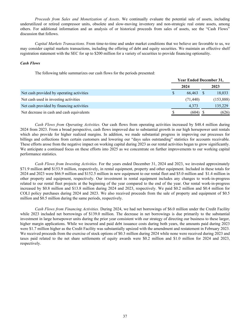 Proceeds from Sales and Monetization of Assets. We continually evaluate the potential sale of assets, including underutilized or retired compressor units, obsolete and slow-moving inventory and non-strategic real estate assets, among others. For additional information and an analysis of or historical proceeds from sales of assets, see the “Cash Flows” discussion that follows. Capital Markets Transactions. From time-to-time and under market conditions that we believe are favorable to us, we may consider capital markets transactions, including the offering of debt and equity securities. We maintain an effective shelf registration statement with the SEC for up to $200 million for a variety of securities to provide financing optionality. Cash Flows The following table summarizes our cash flows for the periods presented: Year Ended December 31, 2024 2023 Net cash provided by operating activities $ 66,463 $ 18,033 Net cash used in investing activities (71,440) (153,888) Net cash provided by financing activities 4,373 135,229 Net decrease in cash and cash equivalents $ (604) $ (626) Cash Flows from Operating Activities. Our cash flows from operating activities increased by $48.4 million during 2024 from 2023. From a broad perspective, cash flows improved due to substantial growth in our high horsepower unit rentals which also provide for higher realized margins. In addition, we made substantial progress in improving our processes for billings and collections from certain customers and lowering our “days sales outstanding” statistics for accounts receivable. These efforts arose from the negative impact on working capital during 2023 as our rental activities began to grow significantly. We anticipate a continued focus on these efforts into 2025 as we concentrate on further improvements to our working capital performance statistics. Cash Flows from Investing Activities. For the years ended December 31, 2024 and 2023, we invested approximately $71.9 million and $153.9 million, respectively, in rental equipment, property and other equipment. Included in these totals for 2024 and 2023 were $66.9 million and $152.5 million in new equipment to our rental fleet and $5.0 million and $1.4 million in other property and equipment, respectively. Our investment in rental equipment includes any changes to work-in-progress related to our rental fleet projects at the beginning of the year compared to the end of the year. Our rental work-in-progress increased by $0.8 million and $13.8 million during 2024 and 2023, respectively. We paid $0.2 million and $0.4 million for COLI policy purchases during 2024 and 2023. We also received proceeds from the sale of property and equipment of $0.5 million and $0.5 million during the same periods, respectively. Cash Flows from Financing Activities. During 2024, we had net borrowings of $6.0 million under the Credit Facility while 2023 included net borrowings of $139.0 million. The decrease in net borrowings is due primarily to the substantial investment in large horsepower units during the prior year consistent with our strategy of directing our business to these larger, higher margin applications. While we incurred and paid debt issuance costs during both years, the amounts paid during 2023 were $1.7 million higher as the Credit Facility was substantially upsized with the amendment and restatement in February 2023. We received proceeds from the exercise of stock options of $0.3 million during 2024 while none were received during 2023 and taxes paid related to the net share settlements of equity awards were $0.2 million and $1.0 million for 2024 and 2023, respectively. 37
