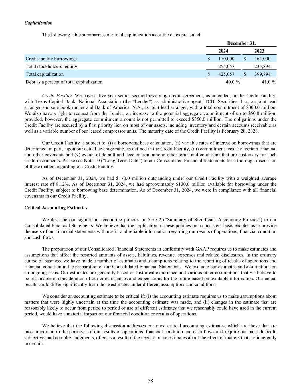 Capitalization The following table summarizes our total capitalization as of the dates presented: December 31, 2024 2023 Credit facility borrowings $ 170,000 $ 164,000 Total stockholders’ equity 255,057 235,894 Total capitalization $ 425,057 $ 399,894 Debt as a percent of total capitalization 40.0 % 41.0 % Credit Facility. We have a five-year senior secured revolving credit agreement, as amended, or the Credit Facility, with Texas Capital Bank, National Association (the “Lender”) as administrative agent, TCBI Securities, Inc., as joint lead arranger and sole book runner and Bank of America, N.A., as joint lead arranger, with a total commitment of $300.0 million. We also have a right to request from the Lender, an increase to the potential aggregate commitment of up to $50.0 million; provided, however, the aggregate commitment amount is not permitted to exceed $350.0 million. The obligations under the Credit Facility are secured by a first priority lien on most of our assets, including inventory and certain accounts receivable as well as a variable number of our leased compressor units. The maturity date of the Credit Facility is February 28, 2028. Our Credit Facility is subject to: (i) a borrowing base calculation, (ii) variable rates of interest on borrowings that are determined, in part, upon our actual leverage ratio, as defined in the Credit Facility, (iii) commitment fees, (iv) certain financial and other covenants and (v) events of default and acceleration, among other terms and conditions that are customary for such credit instruments. Please see Note 10 (“Long-Term Debt”) to our Consolidated Financial Statements for a thorough discussion of these matters regarding our Credit Facility. As of December 31, 2024, we had $170.0 million outstanding under our Credit Facility with a weighted average interest rate of 8.12%. As of December 31, 2024, we had approximately $130.0 million available for borrowing under the Credit Facility, subject to borrowing base determination. As of December 31, 2024, we were in compliance with all financial covenants in our Credit Facility. Critical Accounting Estimates We describe our significant accounting policies in Note 2 (“Summary of Significant Accounting Policies”) to our Consolidated Financial Statements. We believe that the application of these policies on a consistent basis enables us to provide the users of our financial statements with useful and reliable information regarding our results of operations, financial condition and cash flows. The preparation of our Consolidated Financial Statements in conformity with GAAP requires us to make estimates and assumptions that affect the reported amounts of assets, liabilities, revenue, expenses and related disclosures. In the ordinary course of business, we have made a number of estimates and assumptions relating to the reporting of results of operations and financial condition in the preparation of our Consolidated Financial Statements. We evaluate our estimates and assumptions on an ongoing basis. Our estimates are generally based on historical experience and various other assumptions that we believe to be reasonable in consideration of our circumstances and expectations for the future based on available information. Our actual results could differ significantly from those estimates under different assumptions and conditions. We consider an accounting estimate to be critical if: (i) the accounting estimate requires us to make assumptions about matters that were highly uncertain at the time the accounting estimate was made, and (ii) changes in the estimate that are reasonably likely to occur from period to period or use of different estimates that we reasonably could have used in the current period, would have a material impact on our financial condition or results of operations. We believe that the following discussion addresses our most critical accounting estimates, which are those that are most important to the portrayal of our results of operations, financial condition and cash flows and require our most difficult, subjective, and complex judgments, often as a result of the need to make estimates about the effect of matters that are inherently uncertain. 38