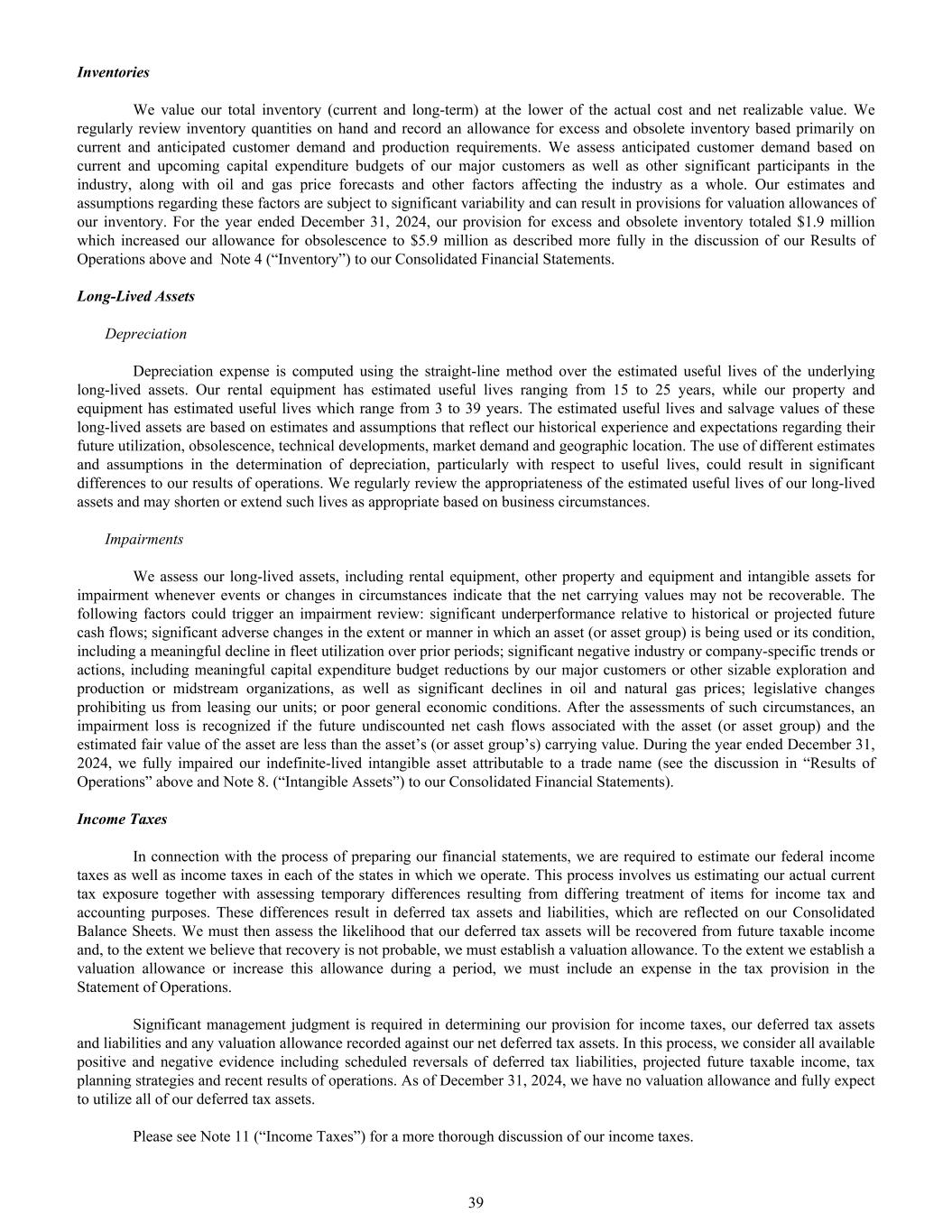Inventories We value our total inventory (current and long-term) at the lower of the actual cost and net realizable value. We regularly review inventory quantities on hand and record an allowance for excess and obsolete inventory based primarily on current and anticipated customer demand and production requirements. We assess anticipated customer demand based on current and upcoming capital expenditure budgets of our major customers as well as other significant participants in the industry, along with oil and gas price forecasts and other factors affecting the industry as a whole. Our estimates and assumptions regarding these factors are subject to significant variability and can result in provisions for valuation allowances of our inventory. For the year ended December 31, 2024, our provision for excess and obsolete inventory totaled $1.9 million which increased our allowance for obsolescence to $5.9 million as described more fully in the discussion of our Results of Operations above and Note 4 (“Inventory”) to our Consolidated Financial Statements. Long-Lived Assets Depreciation Depreciation expense is computed using the straight-line method over the estimated useful lives of the underlying long-lived assets. Our rental equipment has estimated useful lives ranging from 15 to 25 years, while our property and equipment has estimated useful lives which range from 3 to 39 years. The estimated useful lives and salvage values of these long-lived assets are based on estimates and assumptions that reflect our historical experience and expectations regarding their future utilization, obsolescence, technical developments, market demand and geographic location. The use of different estimates and assumptions in the determination of depreciation, particularly with respect to useful lives, could result in significant differences to our results of operations. We regularly review the appropriateness of the estimated useful lives of our long-lived assets and may shorten or extend such lives as appropriate based on business circumstances. Impairments We assess our long-lived assets, including rental equipment, other property and equipment and intangible assets for impairment whenever events or changes in circumstances indicate that the net carrying values may not be recoverable. The following factors could trigger an impairment review: significant underperformance relative to historical or projected future cash flows; significant adverse changes in the extent or manner in which an asset (or asset group) is being used or its condition, including a meaningful decline in fleet utilization over prior periods; significant negative industry or company-specific trends or actions, including meaningful capital expenditure budget reductions by our major customers or other sizable exploration and production or midstream organizations, as well as significant declines in oil and natural gas prices; legislative changes prohibiting us from leasing our units; or poor general economic conditions. After the assessments of such circumstances, an impairment loss is recognized if the future undiscounted net cash flows associated with the asset (or asset group) and the estimated fair value of the asset are less than the asset’s (or asset group’s) carrying value. During the year ended December 31, 2024, we fully impaired our indefinite-lived intangible asset attributable to a trade name (see the discussion in “Results of Operations” above and Note 8. (“Intangible Assets”) to our Consolidated Financial Statements). Income Taxes In connection with the process of preparing our financial statements, we are required to estimate our federal income taxes as well as income taxes in each of the states in which we operate. This process involves us estimating our actual current tax exposure together with assessing temporary differences resulting from differing treatment of items for income tax and accounting purposes. These differences result in deferred tax assets and liabilities, which are reflected on our Consolidated Balance Sheets. We must then assess the likelihood that our deferred tax assets will be recovered from future taxable income and, to the extent we believe that recovery is not probable, we must establish a valuation allowance. To the extent we establish a valuation allowance or increase this allowance during a period, we must include an expense in the tax provision in the Statement of Operations. Significant management judgment is required in determining our provision for income taxes, our deferred tax assets and liabilities and any valuation allowance recorded against our net deferred tax assets. In this process, we consider all available positive and negative evidence including scheduled reversals of deferred tax liabilities, projected future taxable income, tax planning strategies and recent results of operations. As of December 31, 2024, we have no valuation allowance and fully expect to utilize all of our deferred tax assets. Please see Note 11 (“Income Taxes”) for a more thorough discussion of our income taxes. 39