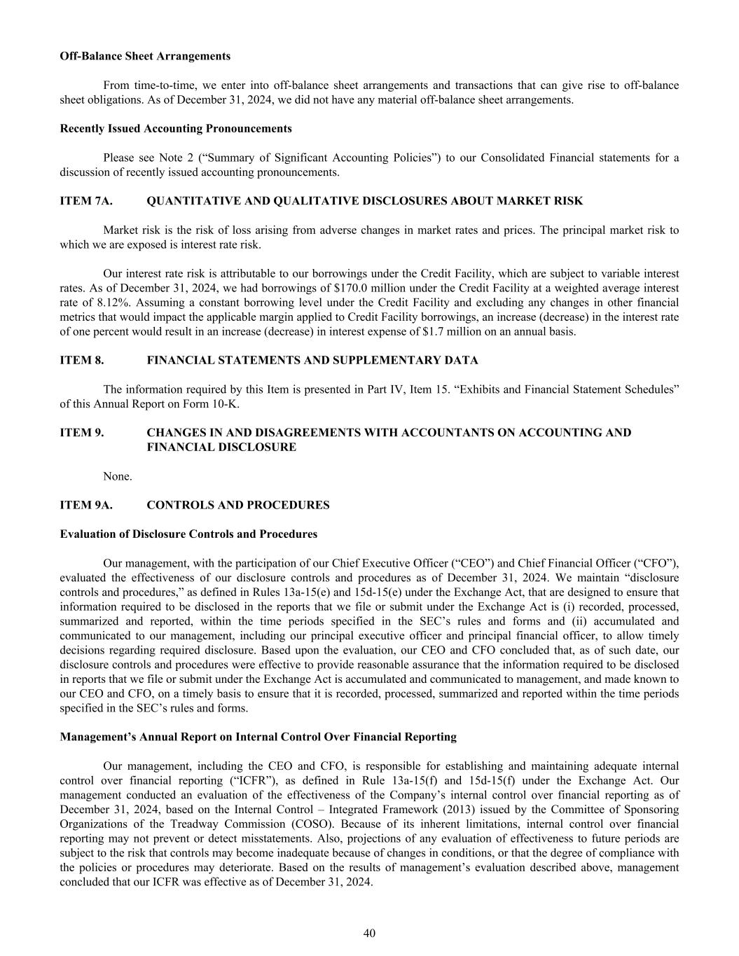 Off-Balance Sheet Arrangements From time-to-time, we enter into off-balance sheet arrangements and transactions that can give rise to off-balance sheet obligations. As of December 31, 2024, we did not have any material off-balance sheet arrangements. Recently Issued Accounting Pronouncements Please see Note 2 (“Summary of Significant Accounting Policies”) to our Consolidated Financial statements for a discussion of recently issued accounting pronouncements. ITEM 7A. QUANTITATIVE AND QUALITATIVE DISCLOSURES ABOUT MARKET RISK Market risk is the risk of loss arising from adverse changes in market rates and prices. The principal market risk to which we are exposed is interest rate risk. Our interest rate risk is attributable to our borrowings under the Credit Facility, which are subject to variable interest rates. As of December 31, 2024, we had borrowings of $170.0 million under the Credit Facility at a weighted average interest rate of 8.12%. Assuming a constant borrowing level under the Credit Facility and excluding any changes in other financial metrics that would impact the applicable margin applied to Credit Facility borrowings, an increase (decrease) in the interest rate of one percent would result in an increase (decrease) in interest expense of $1.7 million on an annual basis. ITEM 8. FINANCIAL STATEMENTS AND SUPPLEMENTARY DATA The information required by this Item is presented in Part IV, Item 15. “Exhibits and Financial Statement Schedules” of this Annual Report on Form 10-K. ITEM 9. CHANGES IN AND DISAGREEMENTS WITH ACCOUNTANTS ON ACCOUNTING AND FINANCIAL DISCLOSURE None. ITEM 9A. CONTROLS AND PROCEDURES Evaluation of Disclosure Controls and Procedures Our management, with the participation of our Chief Executive Officer (“CEO”) and Chief Financial Officer (“CFO”), evaluated the effectiveness of our disclosure controls and procedures as of December 31, 2024. We maintain “disclosure controls and procedures,” as defined in Rules 13a-15(e) and 15d-15(e) under the Exchange Act, that are designed to ensure that information required to be disclosed in the reports that we file or submit under the Exchange Act is (i) recorded, processed, summarized and reported, within the time periods specified in the SEC’s rules and forms and (ii) accumulated and communicated to our management, including our principal executive officer and principal financial officer, to allow timely decisions regarding required disclosure. Based upon the evaluation, our CEO and CFO concluded that, as of such date, our disclosure controls and procedures were effective to provide reasonable assurance that the information required to be disclosed in reports that we file or submit under the Exchange Act is accumulated and communicated to management, and made known to our CEO and CFO, on a timely basis to ensure that it is recorded, processed, summarized and reported within the time periods specified in the SEC’s rules and forms. Management’s Annual Report on Internal Control Over Financial Reporting Our management, including the CEO and CFO, is responsible for establishing and maintaining adequate internal control over financial reporting (“ICFR”), as defined in Rule 13a-15(f) and 15d-15(f) under the Exchange Act. Our management conducted an evaluation of the effectiveness of the Company’s internal control over financial reporting as of December 31, 2024, based on the Internal Control – Integrated Framework (2013) issued by the Committee of Sponsoring Organizations of the Treadway Commission (COSO). Because of its inherent limitations, internal control over financial reporting may not prevent or detect misstatements. Also, projections of any evaluation of effectiveness to future periods are subject to the risk that controls may become inadequate because of changes in conditions, or that the degree of compliance with the policies or procedures may deteriorate. Based on the results of management’s evaluation described above, management concluded that our ICFR was effective as of December 31, 2024. 40