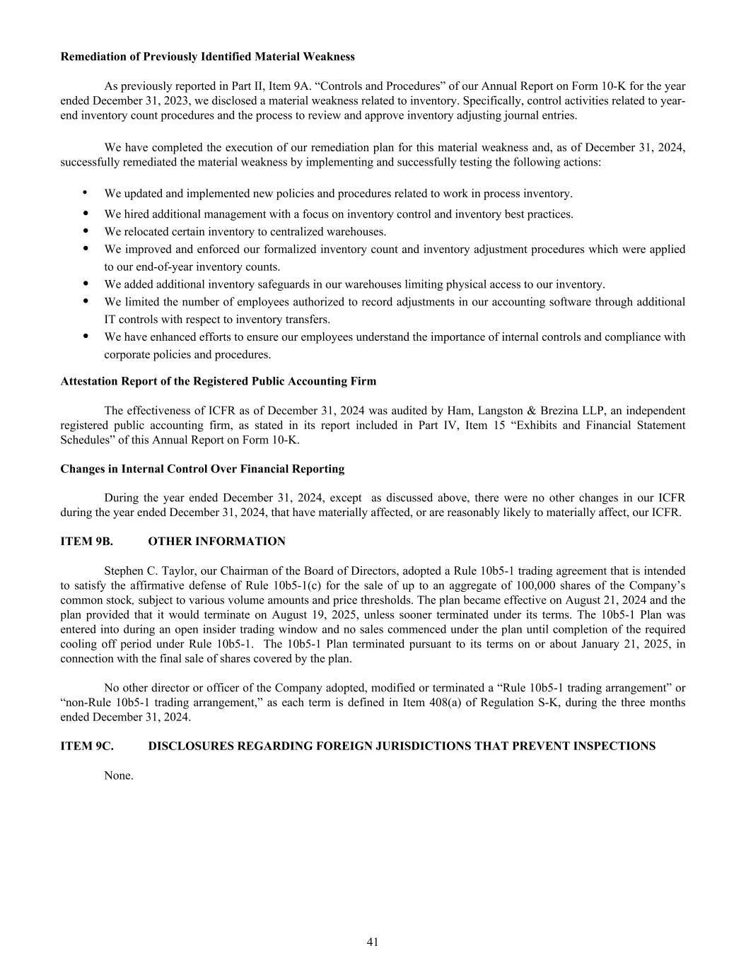 Remediation of Previously Identified Material Weakness As previously reported in Part II, Item 9A. “Controls and Procedures” of our Annual Report on Form 10-K for the year ended December 31, 2023, we disclosed a material weakness related to inventory. Specifically, control activities related to year- end inventory count procedures and the process to review and approve inventory adjusting journal entries. We have completed the execution of our remediation plan for this material weakness and, as of December 31, 2024, successfully remediated the material weakness by implementing and successfully testing the following actions: • We updated and implemented new policies and procedures related to work in process inventory. • We hired additional management with a focus on inventory control and inventory best practices. • We relocated certain inventory to centralized warehouses. • We improved and enforced our formalized inventory count and inventory adjustment procedures which were applied to our end-of-year inventory counts. • We added additional inventory safeguards in our warehouses limiting physical access to our inventory. • We limited the number of employees authorized to record adjustments in our accounting software through additional IT controls with respect to inventory transfers. • We have enhanced efforts to ensure our employees understand the importance of internal controls and compliance with corporate policies and procedures. Attestation Report of the Registered Public Accounting Firm The effectiveness of ICFR as of December 31, 2024 was audited by Ham, Langston & Brezina LLP, an independent registered public accounting firm, as stated in its report included in Part IV, Item 15 “Exhibits and Financial Statement Schedules” of this Annual Report on Form 10-K. Changes in Internal Control Over Financial Reporting During the year ended December 31, 2024, except as discussed above, there were no other changes in our ICFR during the year ended December 31, 2024, that have materially affected, or are reasonably likely to materially affect, our ICFR. ITEM 9B. OTHER INFORMATION Stephen C. Taylor, our Chairman of the Board of Directors, adopted a Rule 10b5-1 trading agreement that is intended to satisfy the affirmative defense of Rule 10b5-1(c) for the sale of up to an aggregate of 100,000 shares of the Company’s common stock, subject to various volume amounts and price thresholds. The plan became effective on August 21, 2024 and the plan provided that it would terminate on August 19, 2025, unless sooner terminated under its terms. The 10b5-1 Plan was entered into during an open insider trading window and no sales commenced under the plan until completion of the required cooling off period under Rule 10b5-1. The 10b5-1 Plan terminated pursuant to its terms on or about January 21, 2025, in connection with the final sale of shares covered by the plan. No other director or officer of the Company adopted, modified or terminated a “Rule 10b5-1 trading arrangement” or “non-Rule 10b5-1 trading arrangement,” as each term is defined in Item 408(a) of Regulation S-K, during the three months ended December 31, 2024. ITEM 9C. DISCLOSURES REGARDING FOREIGN JURISDICTIONS THAT PREVENT INSPECTIONS None. 41
