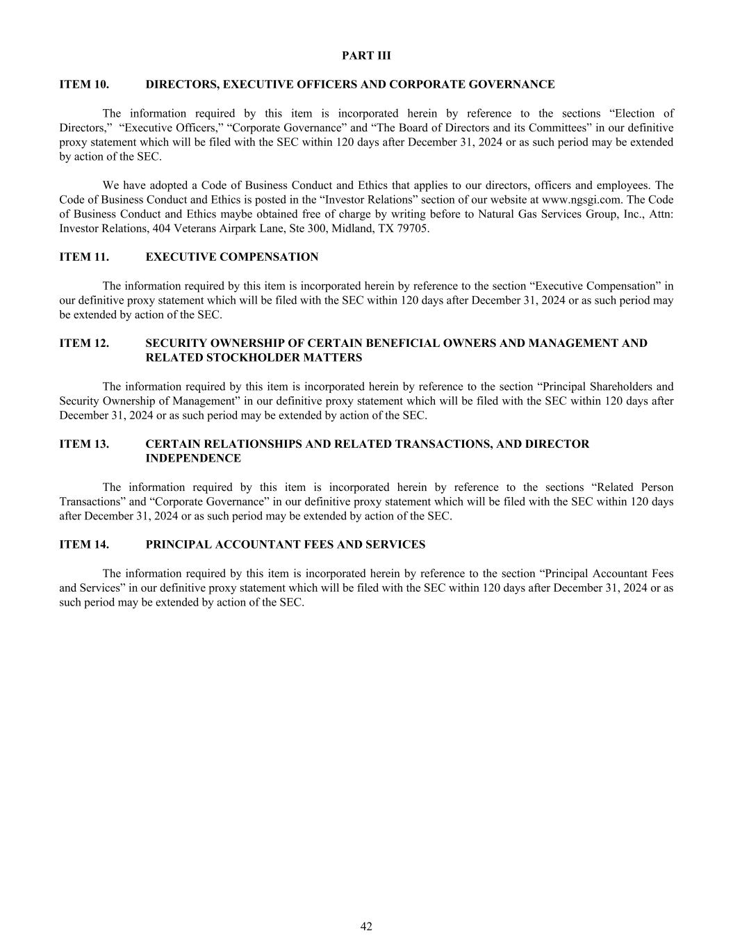 PART III ITEM 10. DIRECTORS, EXECUTIVE OFFICERS AND CORPORATE GOVERNANCE The information required by this item is incorporated herein by reference to the sections “Election of Directors,” “Executive Officers,” “Corporate Governance” and “The Board of Directors and its Committees” in our definitive proxy statement which will be filed with the SEC within 120 days after December 31, 2024 or as such period may be extended by action of the SEC. We have adopted a Code of Business Conduct and Ethics that applies to our directors, officers and employees. The Code of Business Conduct and Ethics is posted in the “Investor Relations” section of our website at www.ngsgi.com. The Code of Business Conduct and Ethics maybe obtained free of charge by writing before to Natural Gas Services Group, Inc., Attn: Investor Relations, 404 Veterans Airpark Lane, Ste 300, Midland, TX 79705. ITEM 11. EXECUTIVE COMPENSATION The information required by this item is incorporated herein by reference to the section “Executive Compensation” in our definitive proxy statement which will be filed with the SEC within 120 days after December 31, 2024 or as such period may be extended by action of the SEC. ITEM 12. SECURITY OWNERSHIP OF CERTAIN BENEFICIAL OWNERS AND MANAGEMENT AND RELATED STOCKHOLDER MATTERS The information required by this item is incorporated herein by reference to the section “Principal Shareholders and Security Ownership of Management” in our definitive proxy statement which will be filed with the SEC within 120 days after December 31, 2024 or as such period may be extended by action of the SEC. ITEM 13. CERTAIN RELATIONSHIPS AND RELATED TRANSACTIONS, AND DIRECTOR INDEPENDENCE The information required by this item is incorporated herein by reference to the sections “Related Person Transactions” and “Corporate Governance” in our definitive proxy statement which will be filed with the SEC within 120 days after December 31, 2024 or as such period may be extended by action of the SEC. ITEM 14. PRINCIPAL ACCOUNTANT FEES AND SERVICES The information required by this item is incorporated herein by reference to the section “Principal Accountant Fees and Services” in our definitive proxy statement which will be filed with the SEC within 120 days after December 31, 2024 or as such period may be extended by action of the SEC. 42