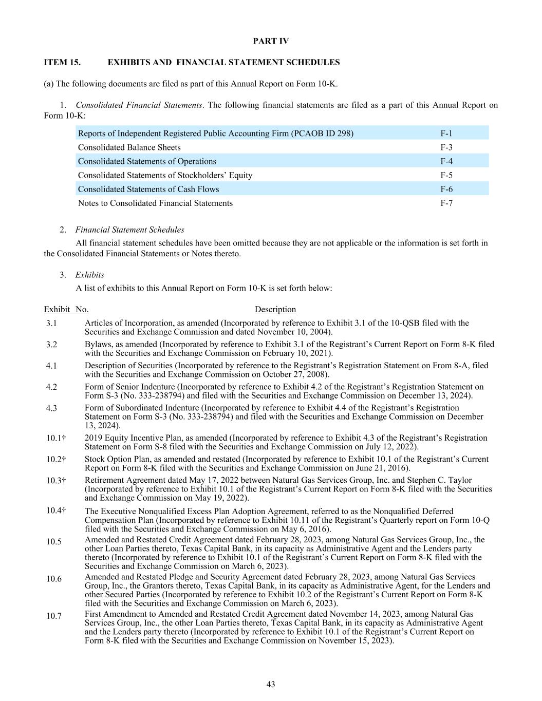 PART IV ITEM 15. EXHIBITS AND FINANCIAL STATEMENT SCHEDULES (a) The following documents are filed as part of this Annual Report on Form 10-K. 1. Consolidated Financial Statements. The following financial statements are filed as a part of this Annual Report on Form 10-K: Reports of Independent Registered Public Accounting Firm (PCAOB ID 298) F-1 Consolidated Balance Sheets F-3 Consolidated Statements of Operations F-4 Consolidated Statements of Stockholders’ Equity F-5 Consolidated Statements of Cash Flows F-6 Notes to Consolidated Financial Statements F-7 2. Financial Statement Schedules All financial statement schedules have been omitted because they are not applicable or the information is set forth in the Consolidated Financial Statements or Notes thereto. 3. Exhibits A list of exhibits to this Annual Report on Form 10-K is set forth below: Exhibit No. Description 3.1 Articles of Incorporation, as amended (Incorporated by reference to Exhibit 3.1 of the 10-QSB filed with the Securities and Exchange Commission and dated November 10, 2004). 3.2 Bylaws, as amended (Incorporated by reference to Exhibit 3.1 of the Registrant’s Current Report on Form 8-K filed with the Securities and Exchange Commission on February 10, 2021). 4.1 Description of Securities (Incorporated by reference to the Registrant’s Registration Statement on From 8-A, filed with the Securities and Exchange Commission on October 27, 2008). 4.2 Form of Senior Indenture (Incorporated by reference to Exhibit 4.2 of the Registrant’s Registration Statement on Form S-3 (No. 333-238794) and filed with the Securities and Exchange Commission on December 13, 2024). 4.3 Form of Subordinated Indenture (Incorporated by reference to Exhibit 4.4 of the Registrant’s Registration Statement on Form S-3 (No. 333-238794) and filed with the Securities and Exchange Commission on December 13, 2024). 10.1† 2019 Equity Incentive Plan, as amended (Incorporated by reference to Exhibit 4.3 of the Registrant’s Registration Statement on Form S-8 filed with the Securities and Exchange Commission on July 12, 2022). 10.2† Stock Option Plan, as amended and restated (Incorporated by reference to Exhibit 10.1 of the Registrant’s Current Report on Form 8-K filed with the Securities and Exchange Commission on June 21, 2016). 10.3† Retirement Agreement dated May 17, 2022 between Natural Gas Services Group, Inc. and Stephen C. Taylor (Incorporated by reference to Exhibit 10.1 of the Registrant’s Current Report on Form 8-K filed with the Securities and Exchange Commission on May 19, 2022). 10.4† The Executive Nonqualified Excess Plan Adoption Agreement, referred to as the Nonqualified Deferred Compensation Plan (Incorporated by reference to Exhibit 10.11 of the Registrant’s Quarterly report on Form 10-Q filed with the Securities and Exchange Commission on May 6, 2016). 10.5 Amended and Restated Credit Agreement dated February 28, 2023, among Natural Gas Services Group, Inc., the other Loan Parties thereto, Texas Capital Bank, in its capacity as Administrative Agent and the Lenders party thereto (Incorporated by reference to Exhibit 10.1 of the Registrant’s Current Report on Form 8-K filed with the Securities and Exchange Commission on March 6, 2023). 10.6 Amended and Restated Pledge and Security Agreement dated February 28, 2023, among Natural Gas Services Group, Inc., the Grantors thereto, Texas Capital Bank, in its capacity as Administrative Agent, for the Lenders and other Secured Parties (Incorporated by reference to Exhibit 10.2 of the Registrant’s Current Report on Form 8-K filed with the Securities and Exchange Commission on March 6, 2023). 10.7 First Amendment to Amended and Restated Credit Agreement dated November 14, 2023, among Natural Gas Services Group, Inc., the other Loan Parties thereto, Texas Capital Bank, in its capacity as Administrative Agent and the Lenders party thereto (Incorporated by reference to Exhibit 10.1 of the Registrant’s Current Report on Form 8-K filed with the Securities and Exchange Commission on November 15, 2023). 43