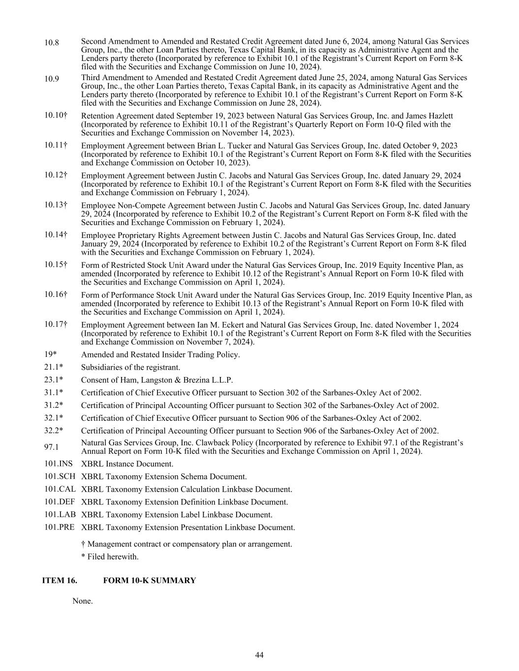 10.8 Second Amendment to Amended and Restated Credit Agreement dated June 6, 2024, among Natural Gas Services Group, Inc., the other Loan Parties thereto, Texas Capital Bank, in its capacity as Administrative Agent and the Lenders party thereto (Incorporated by reference to Exhibit 10.1 of the Registrant’s Current Report on Form 8-K filed with the Securities and Exchange Commission on June 10, 2024). 10.9 Third Amendment to Amended and Restated Credit Agreement dated June 25, 2024, among Natural Gas Services Group, Inc., the other Loan Parties thereto, Texas Capital Bank, in its capacity as Administrative Agent and the Lenders party thereto (Incorporated by reference to Exhibit 10.1 of the Registrant’s Current Report on Form 8-K filed with the Securities and Exchange Commission on June 28, 2024). 10.10† Retention Agreement dated September 19, 2023 between Natural Gas Services Group, Inc. and James Hazlett (Incorporated by reference to Exhibit 10.11 of the Registrant’s Quarterly Report on Form 10-Q filed with the Securities and Exchange Commission on November 14, 2023). 10.11† Employment Agreement between Brian L. Tucker and Natural Gas Services Group, Inc. dated October 9, 2023 (Incorporated by reference to Exhibit 10.1 of the Registrant’s Current Report on Form 8-K filed with the Securities and Exchange Commission on October 10, 2023). 10.12† Employment Agreement between Justin C. Jacobs and Natural Gas Services Group, Inc. dated January 29, 2024 (Incorporated by reference to Exhibit 10.1 of the Registrant’s Current Report on Form 8-K filed with the Securities and Exchange Commission on February 1, 2024). 10.13† Employee Non-Compete Agreement between Justin C. Jacobs and Natural Gas Services Group, Inc. dated January 29, 2024 (Incorporated by reference to Exhibit 10.2 of the Registrant’s Current Report on Form 8-K filed with the Securities and Exchange Commission on February 1, 2024). 10.14† Employee Proprietary Rights Agreement between Justin C. Jacobs and Natural Gas Services Group, Inc. dated January 29, 2024 (Incorporated by reference to Exhibit 10.2 of the Registrant’s Current Report on Form 8-K filed with the Securities and Exchange Commission on February 1, 2024). 10.15† Form of Restricted Stock Unit Award under the Natural Gas Services Group, Inc. 2019 Equity Incentive Plan, as amended (Incorporated by reference to Exhibit 10.12 of the Registrant’s Annual Report on Form 10-K filed with the Securities and Exchange Commission on April 1, 2024). 10.16† Form of Performance Stock Unit Award under the Natural Gas Services Group, Inc. 2019 Equity Incentive Plan, as amended (Incorporated by reference to Exhibit 10.13 of the Registrant’s Annual Report on Form 10-K filed with the Securities and Exchange Commission on April 1, 2024). 10.17† Employment Agreement between Ian M. Eckert and Natural Gas Services Group, Inc. dated November 1, 2024 (Incorporated by reference to Exhibit 10.1 of the Registrant’s Current Report on Form 8-K filed with the Securities and Exchange Commission on November 7, 2024). 19* Amended and Restated Insider Trading Policy. 21.1* Subsidiaries of the registrant. 23.1* Consent of Ham, Langston & Brezina L.L.P. 31.1* Certification of Chief Executive Officer pursuant to Section 302 of the Sarbanes-Oxley Act of 2002. 31.2* Certification of Principal Accounting Officer pursuant to Section 302 of the Sarbanes-Oxley Act of 2002. 32.1* Certification of Chief Executive Officer pursuant to Section 906 of the Sarbanes-Oxley Act of 2002. 32.2* Certification of Principal Accounting Officer pursuant to Section 906 of the Sarbanes-Oxley Act of 2002. 97.1 Natural Gas Services Group, Inc. Clawback Policy (Incorporated by reference to Exhibit 97.1 of the Registrant’s Annual Report on Form 10-K filed with the Securities and Exchange Commission on April 1, 2024). 101.INS XBRL Instance Document. 101.SCH XBRL Taxonomy Extension Schema Document. 101.CAL XBRL Taxonomy Extension Calculation Linkbase Document. 101.DEF XBRL Taxonomy Extension Definition Linkbase Document. 101.LAB XBRL Taxonomy Extension Label Linkbase Document. 101.PRE XBRL Taxonomy Extension Presentation Linkbase Document. † Management contract or compensatory plan or arrangement. * Filed herewith. ITEM 16. FORM 10-K SUMMARY None. 44