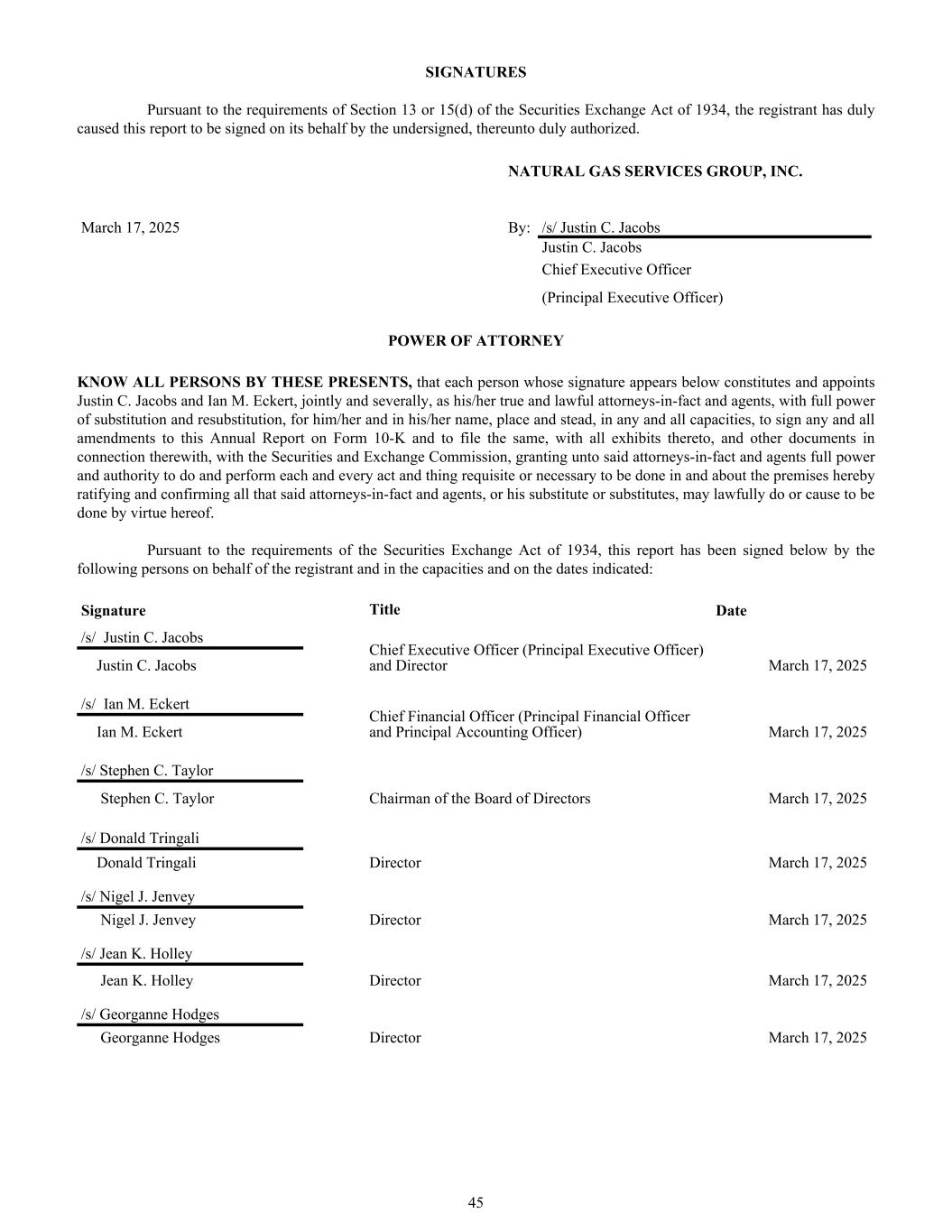 SIGNATURES Pursuant to the requirements of Section 13 or 15(d) of the Securities Exchange Act of 1934, the registrant has duly caused this report to be signed on its behalf by the undersigned, thereunto duly authorized. NATURAL GAS SERVICES GROUP, INC. March 17, 2025 By: /s/ Justin C. Jacobs Justin C. Jacobs Chief Executive Officer (Principal Executive Officer) POWER OF ATTORNEY KNOW ALL PERSONS BY THESE PRESENTS, that each person whose signature appears below constitutes and appoints Justin C. Jacobs and Ian M. Eckert, jointly and severally, as his/her true and lawful attorneys-in-fact and agents, with full power of substitution and resubstitution, for him/her and in his/her name, place and stead, in any and all capacities, to sign any and all amendments to this Annual Report on Form 10-K and to file the same, with all exhibits thereto, and other documents in connection therewith, with the Securities and Exchange Commission, granting unto said attorneys-in-fact and agents full power and authority to do and perform each and every act and thing requisite or necessary to be done in and about the premises hereby ratifying and confirming all that said attorneys-in-fact and agents, or his substitute or substitutes, may lawfully do or cause to be done by virtue hereof. Pursuant to the requirements of the Securities Exchange Act of 1934, this report has been signed below by the following persons on behalf of the registrant and in the capacities and on the dates indicated: Signature Title Date /s/ Justin C. Jacobs Chief Executive Officer (Principal Executive Officer) and Director March 17, 2025 Justin C. Jacobs /s/ Ian M. Eckert Chief Financial Officer (Principal Financial Officer and Principal Accounting Officer) March 17, 2025 Ian M. Eckert /s/ Stephen C. Taylor Chairman of the Board of Directors March 17, 2025 Stephen C. Taylor /s/ Donald Tringali Director March 17, 2025 Donald Tringali /s/ Nigel J. Jenvey Director March 17, 2025 Nigel J. Jenvey /s/ Jean K. Holley Director March 17, 2025 Jean K. Holley /s/ Georganne Hodges Director March 17, 2025 Georganne Hodges 45