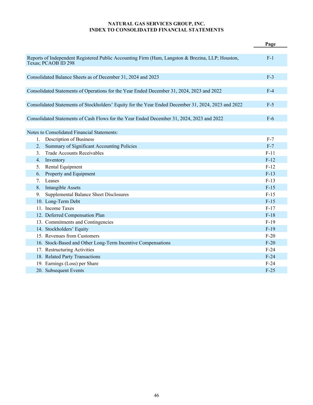 NATURAL GAS SERVICES GROUP, INC. INDEX TO CONSOLIDATED FINANCIAL STATEMENTS Page Reports of Independent Registered Public Accounting Firm (Ham, Langston & Brezina, LLP; Houston, Texas; PCAOB ID 298 F-1 Consolidated Balance Sheets as of December 31, 2024 and 2023 F-3 Consolidated Statements of Operations for the Year Ended December 31, 2024, 2023 and 2022 F-4 Consolidated Statements of Stockholders’ Equity for the Year Ended December 31, 2024, 2023 and 2022 F-5 Consolidated Statements of Cash Flows for the Year Ended December 31, 2024, 2023 and 2022 F-6 Notes to Consolidated Financial Statements: 1. Description of Business F-7 2. Summary of Significant Accounting Policies F-7 3. Trade Accounts Receivables F-11 4. Inventory F-12 5. Rental Equipment F-12 6. Property and Equipment F-13 7. Leases F-13 8. Intangible Assets F-15 9. Supplemental Balance Sheet Disclosures F-15 10. Long-Term Debt F-15 11. Income Taxes F-17 12. Deferred Compensation Plan F-18 13. Commitments and Contingencies F-19 14. Stockholders’ Equity F-19 15. Revenues from Customers F-20 16. Stock-Based and Other Long-Term Incentive Compensations F-20 17. Restructuring Activities F-24 18. Related Party Transactions F-24 19. Earnings (Loss) per Share F-24 20. Subsequent Events F-25 46