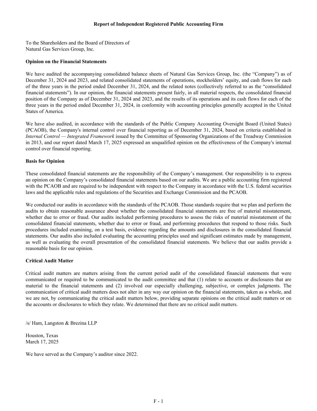 Report of Independent Registered Public Accounting Firm To the Shareholders and the Board of Directors of Natural Gas Services Group, Inc. Opinion on the Financial Statements We have audited the accompanying consolidated balance sheets of Natural Gas Services Group, Inc. (the “Company”) as of December 31, 2024 and 2023, and related consolidated statements of operations, stockholders’ equity, and cash flows for each of the three years in the period ended December 31, 2024, and the related notes (collectively referred to as the “consolidated financial statements”). In our opinion, the financial statements present fairly, in all material respects, the consolidated financial position of the Company as of December 31, 2024 and 2023, and the results of its operations and its cash flows for each of the three years in the period ended December 31, 2024, in conformity with accounting principles generally accepted in the United States of America. We have also audited, in accordance with the standards of the Public Company Accounting Oversight Board (United States) (PCAOB), the Company's internal control over financial reporting as of December 31, 2024, based on criteria established in Internal Control — Integrated Framework issued by the Committee of Sponsoring Organizations of the Treadway Commission in 2013, and our report dated March 17, 2025 expressed an unqualified opinion on the effectiveness of the Company's internal control over financial reporting. Basis for Opinion These consolidated financial statements are the responsibility of the Company’s management. Our responsibility is to express an opinion on the Company’s consolidated financial statements based on our audits. We are a public accounting firm registered with the PCAOB and are required to be independent with respect to the Company in accordance with the U.S. federal securities laws and the applicable rules and regulations of the Securities and Exchange Commission and the PCAOB. We conducted our audits in accordance with the standards of the PCAOB. Those standards require that we plan and perform the audits to obtain reasonable assurance about whether the consolidated financial statements are free of material misstatement, whether due to error or fraud. Our audits included performing procedures to assess the risks of material misstatement of the consolidated financial statements, whether due to error or fraud, and performing procedures that respond to those risks. Such procedures included examining, on a test basis, evidence regarding the amounts and disclosures in the consolidated financial statements. Our audits also included evaluating the accounting principles used and significant estimates made by management, as well as evaluating the overall presentation of the consolidated financial statements. We believe that our audits provide a reasonable basis for our opinion. Critical Audit Matter Critical audit matters are matters arising from the current period audit of the consolidated financial statements that were communicated or required to be communicated to the audit committee and that (1) relate to accounts or disclosures that are material to the financial statements and (2) involved our especially challenging, subjective, or complex judgments. The communication of critical audit matters does not alter in any way our opinion on the financial statements, taken as a whole, and we are not, by communicating the critical audit matters below, providing separate opinions on the critical audit matters or on the accounts or disclosures to which they relate. We determined that there are no critical audit matters. /s/ Ham, Langston & Brezina LLP Houston, Texas March 17, 2025 We have served as the Company’s auditor since 2022. F - 1