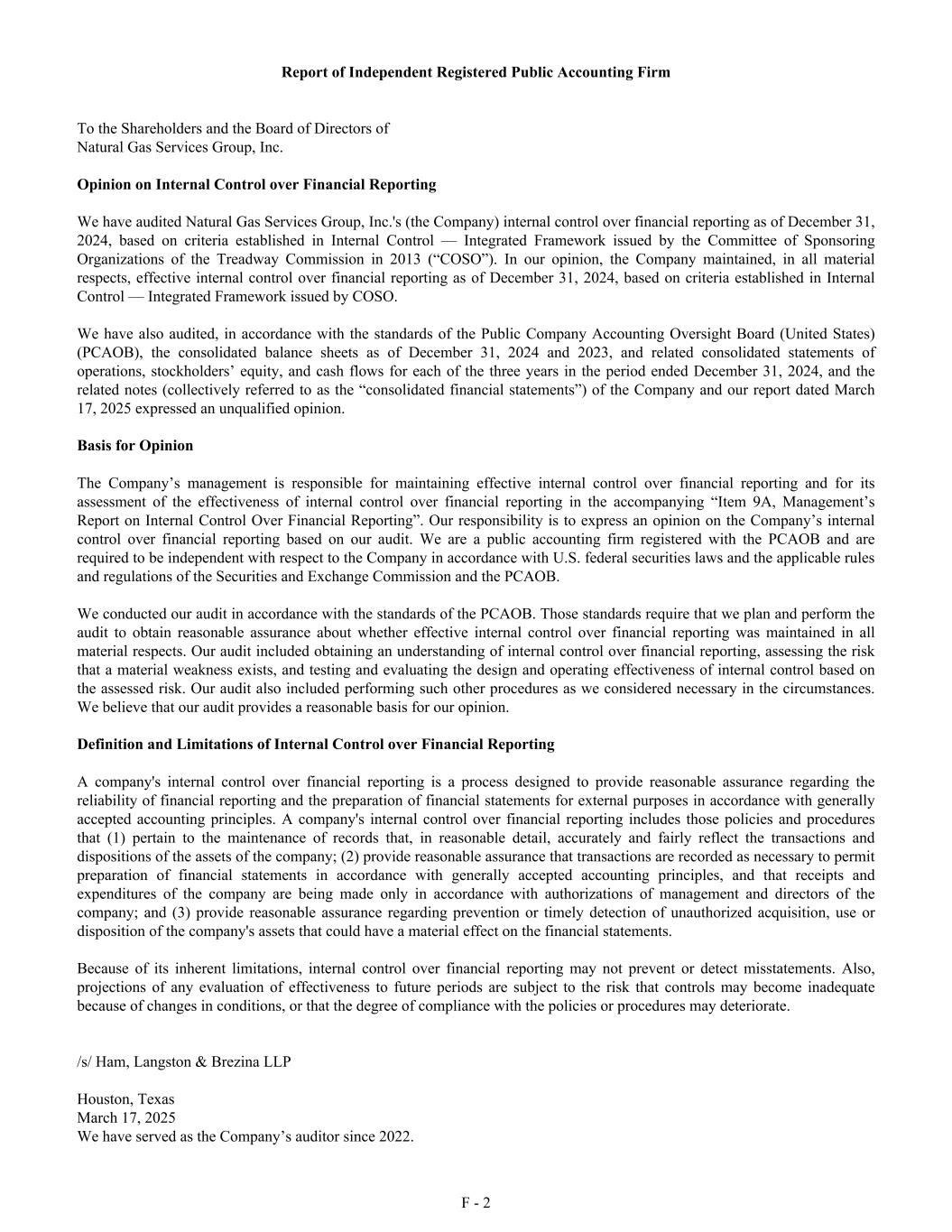 Report of Independent Registered Public Accounting Firm To the Shareholders and the Board of Directors of Natural Gas Services Group, Inc. Opinion on Internal Control over Financial Reporting We have audited Natural Gas Services Group, Inc.'s (the Company) internal control over financial reporting as of December 31, 2024, based on criteria established in Internal Control — Integrated Framework issued by the Committee of Sponsoring Organizations of the Treadway Commission in 2013 (“COSO”). In our opinion, the Company maintained, in all material respects, effective internal control over financial reporting as of December 31, 2024, based on criteria established in Internal Control — Integrated Framework issued by COSO. We have also audited, in accordance with the standards of the Public Company Accounting Oversight Board (United States) (PCAOB), the consolidated balance sheets as of December 31, 2024 and 2023, and related consolidated statements of operations, stockholders’ equity, and cash flows for each of the three years in the period ended December 31, 2024, and the related notes (collectively referred to as the “consolidated financial statements”) of the Company and our report dated March 17, 2025 expressed an unqualified opinion. Basis for Opinion The Company’s management is responsible for maintaining effective internal control over financial reporting and for its assessment of the effectiveness of internal control over financial reporting in the accompanying “Item 9A, Management’s Report on Internal Control Over Financial Reporting”. Our responsibility is to express an opinion on the Company’s internal control over financial reporting based on our audit. We are a public accounting firm registered with the PCAOB and are required to be independent with respect to the Company in accordance with U.S. federal securities laws and the applicable rules and regulations of the Securities and Exchange Commission and the PCAOB. We conducted our audit in accordance with the standards of the PCAOB. Those standards require that we plan and perform the audit to obtain reasonable assurance about whether effective internal control over financial reporting was maintained in all material respects. Our audit included obtaining an understanding of internal control over financial reporting, assessing the risk that a material weakness exists, and testing and evaluating the design and operating effectiveness of internal control based on the assessed risk. Our audit also included performing such other procedures as we considered necessary in the circumstances. We believe that our audit provides a reasonable basis for our opinion. Definition and Limitations of Internal Control over Financial Reporting A company's internal control over financial reporting is a process designed to provide reasonable assurance regarding the reliability of financial reporting and the preparation of financial statements for external purposes in accordance with generally accepted accounting principles. A company's internal control over financial reporting includes those policies and procedures that (1) pertain to the maintenance of records that, in reasonable detail, accurately and fairly reflect the transactions and dispositions of the assets of the company; (2) provide reasonable assurance that transactions are recorded as necessary to permit preparation of financial statements in accordance with generally accepted accounting principles, and that receipts and expenditures of the company are being made only in accordance with authorizations of management and directors of the company; and (3) provide reasonable assurance regarding prevention or timely detection of unauthorized acquisition, use or disposition of the company's assets that could have a material effect on the financial statements. Because of its inherent limitations, internal control over financial reporting may not prevent or detect misstatements. Also, projections of any evaluation of effectiveness to future periods are subject to the risk that controls may become inadequate because of changes in conditions, or that the degree of compliance with the policies or procedures may deteriorate. /s/ Ham, Langston & Brezina LLP Houston, Texas March 17, 2025 We have served as the Company’s auditor since 2022. F - 2